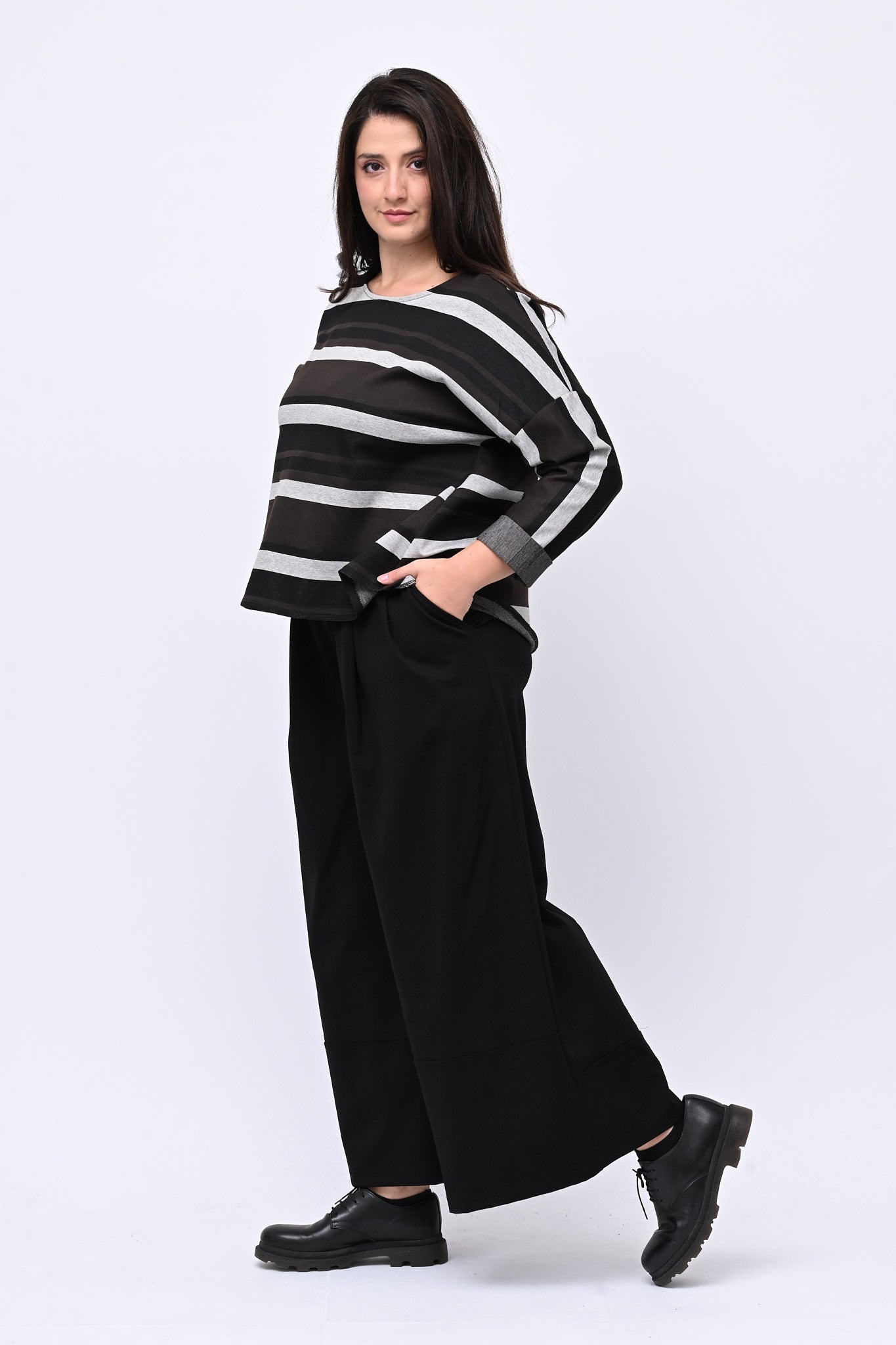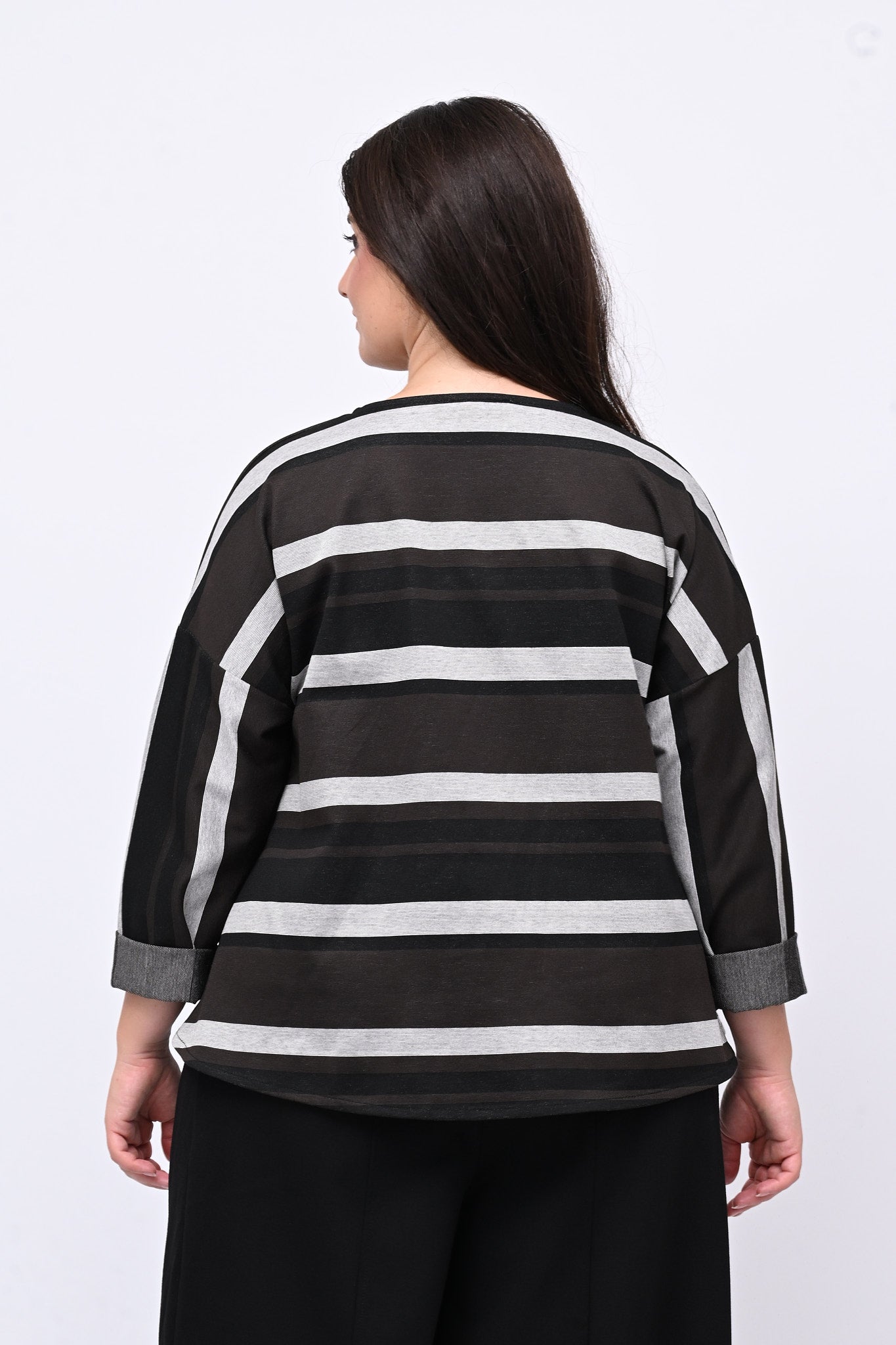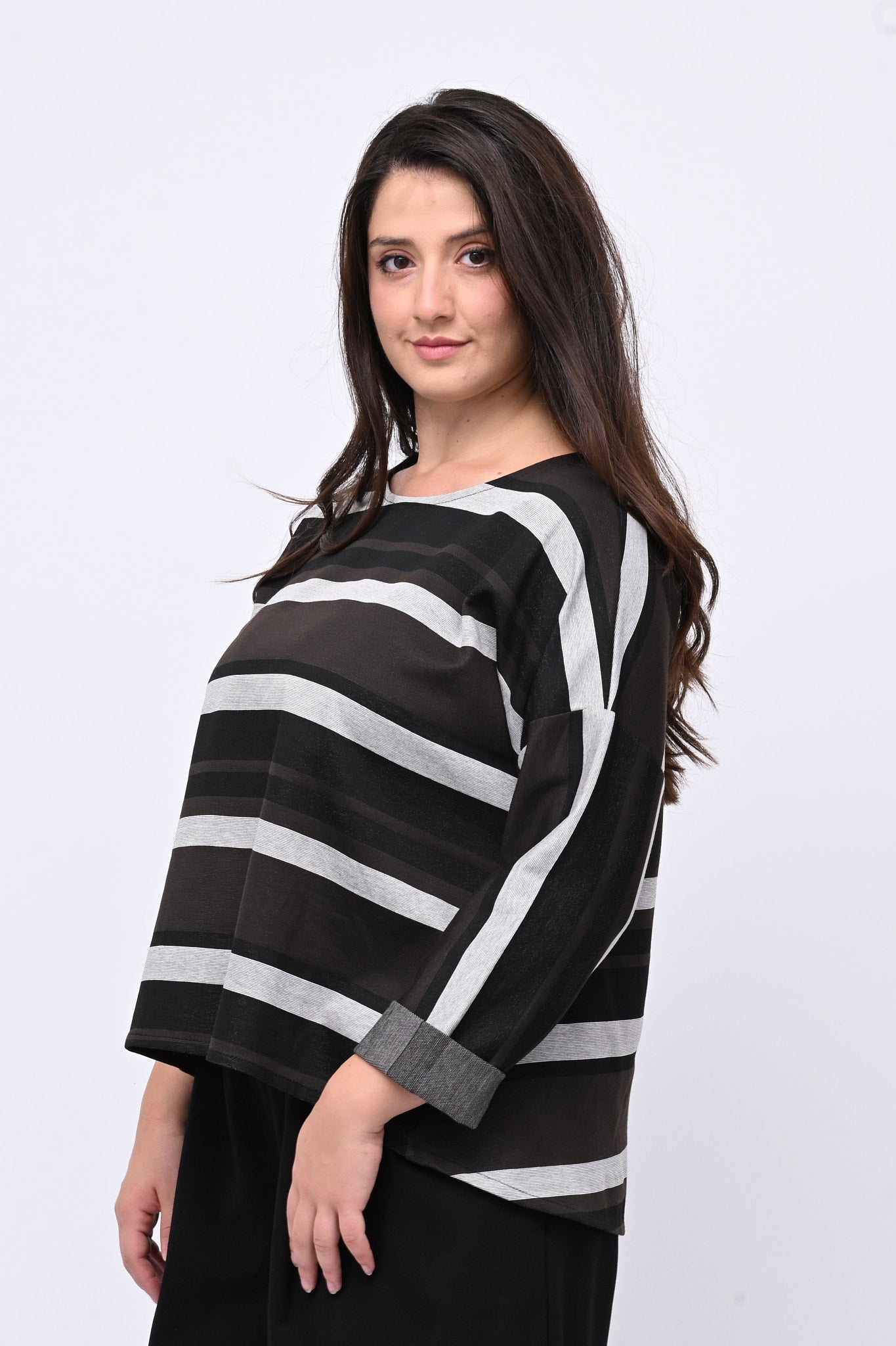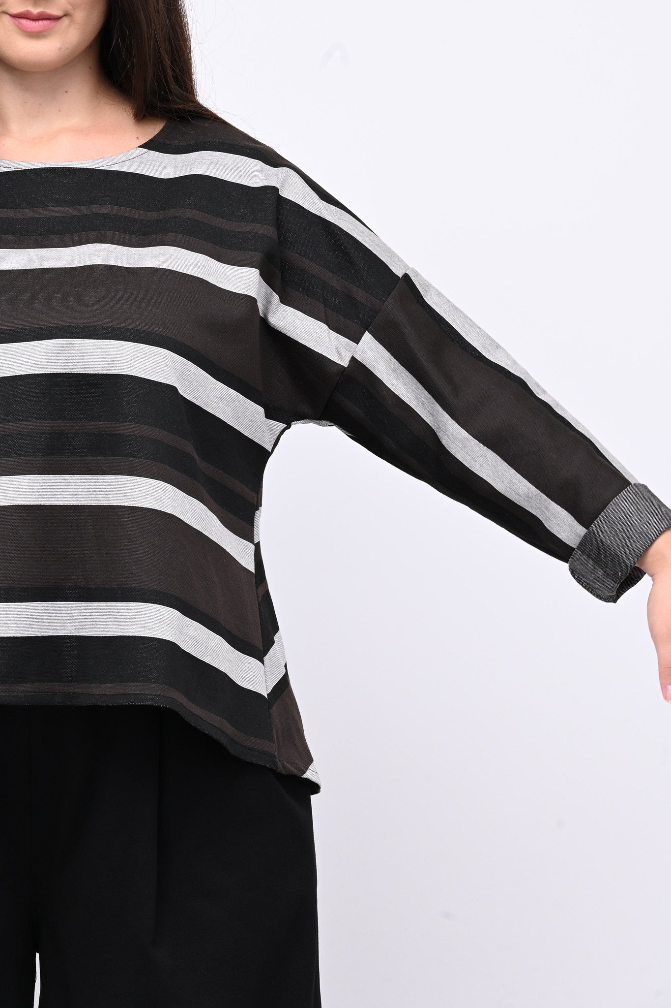 Maglia girocollo, manica lunga, dal taglio ad A, leggermente svasata e più lunga sul retro, unisce originalità e versatilità. La fantasia rigata si adatta con facilità a diversi look, garantendo comfort e stile in ogni occasione.
