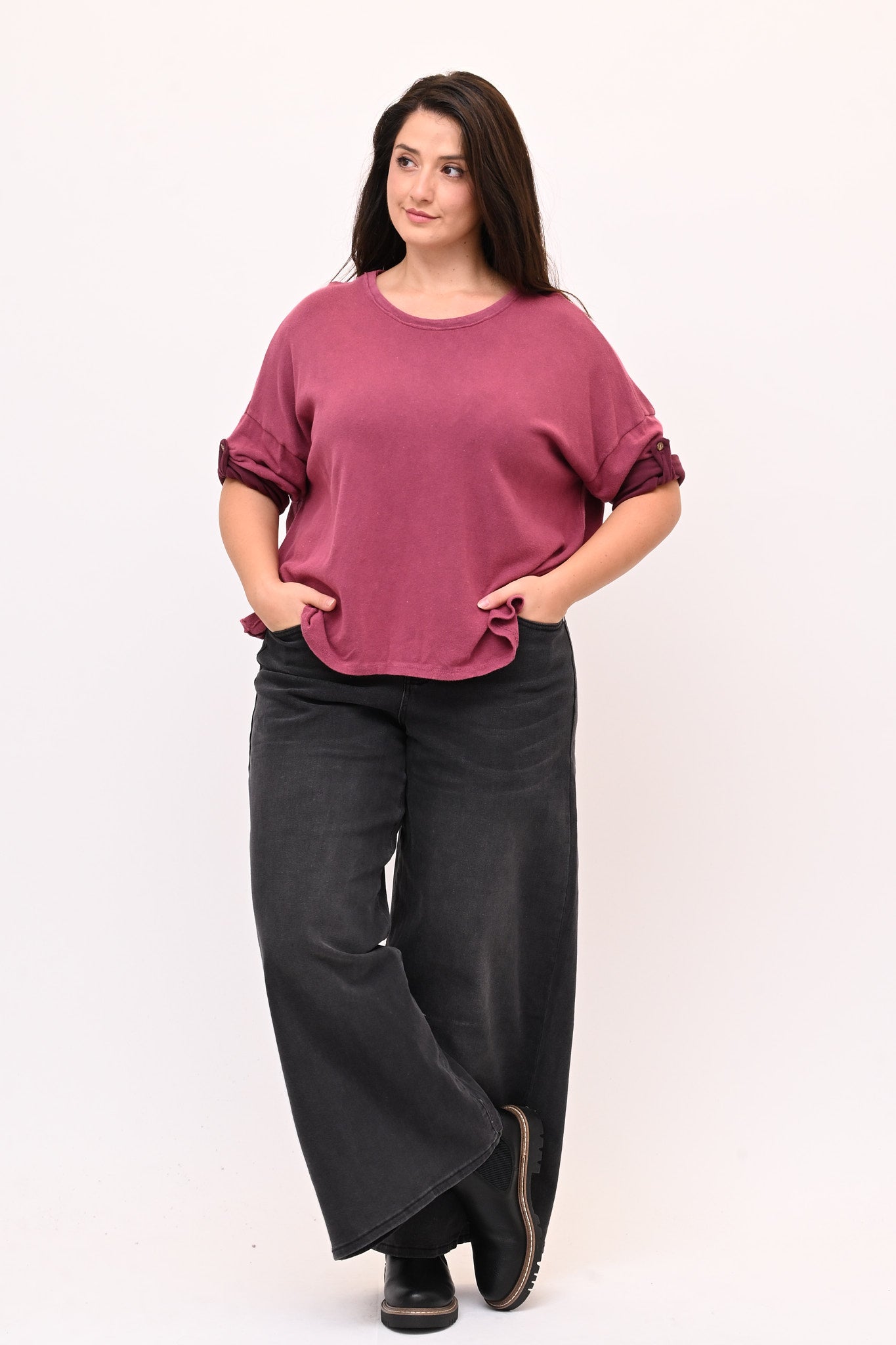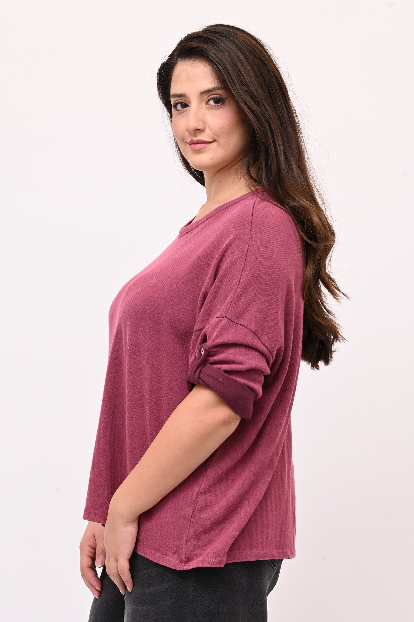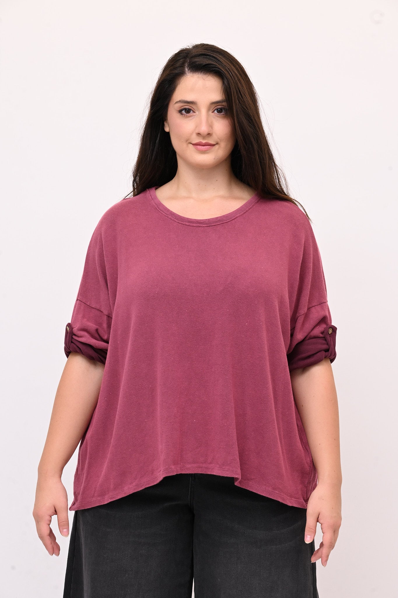 Maglia over in cotone maltinto, a scatoletta, girocollo e maniche lunghe dotate di bottone per trasformarle facilmente in maniche corte. Un capo sportivo ma rifinito, ideale per chi cerca comfort senza rinunciare a uno stile curato e versatile.