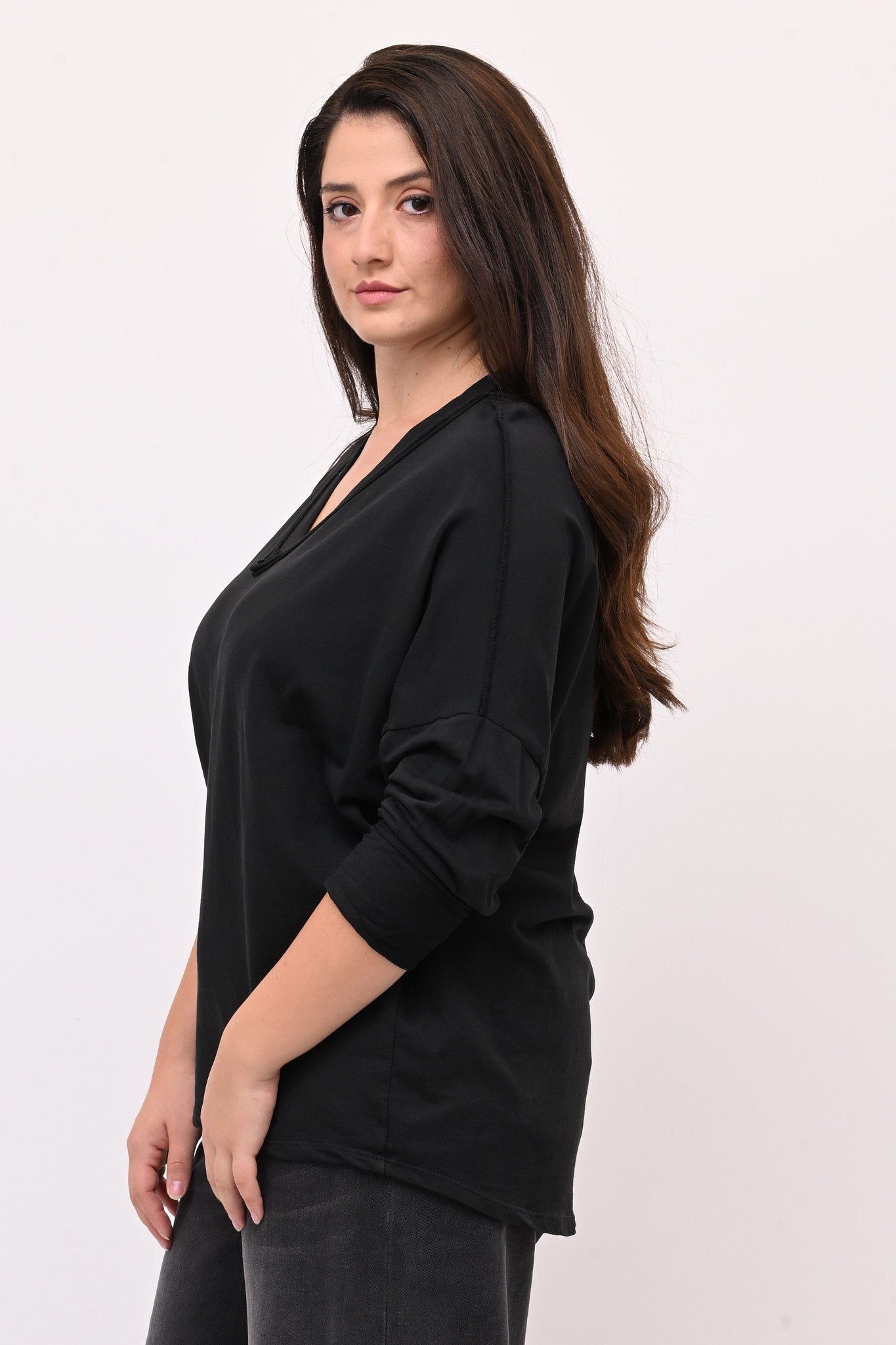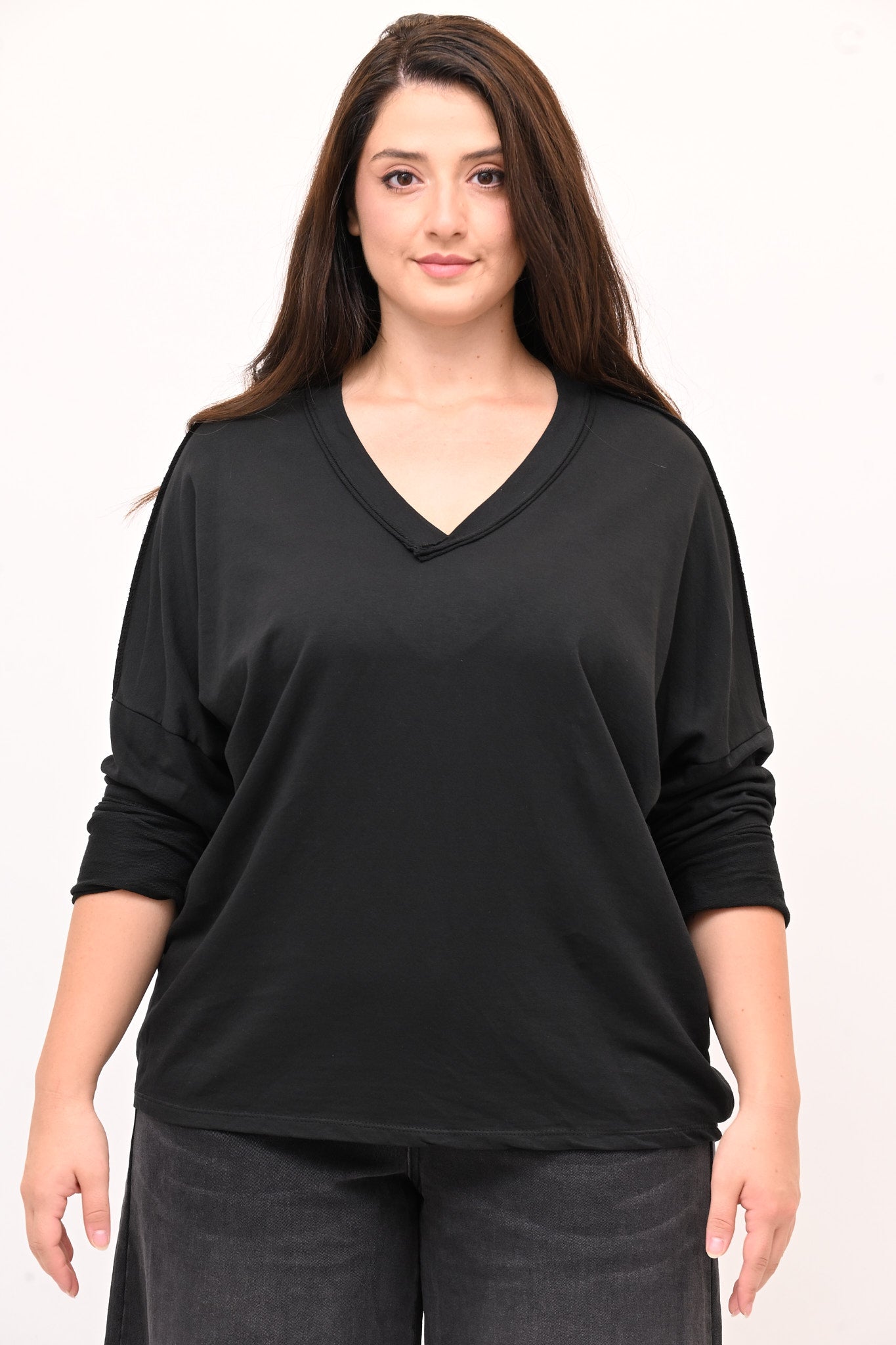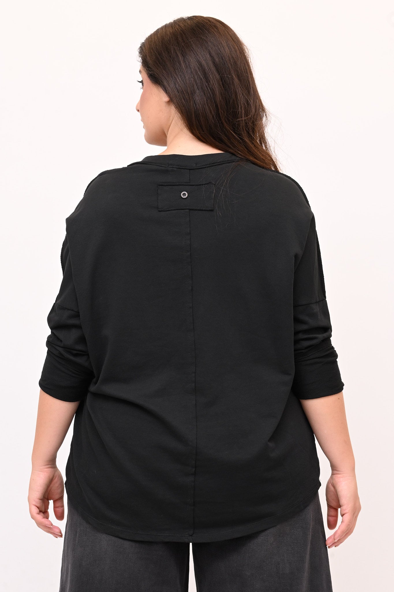 Maglia in garza di cotone, scollo a V, con spalla scesa e manica lunga che unisce un design sportivo a dettagli curati. Un capo dallo stile rilassato e confortevole, ideale per uno stile casual e curato.