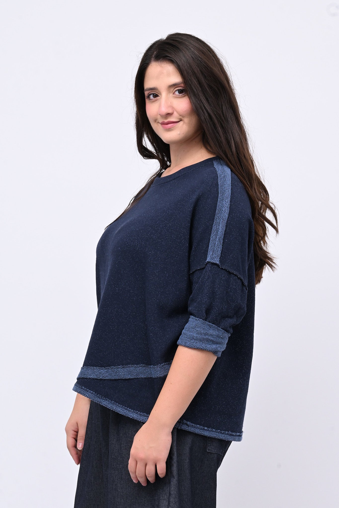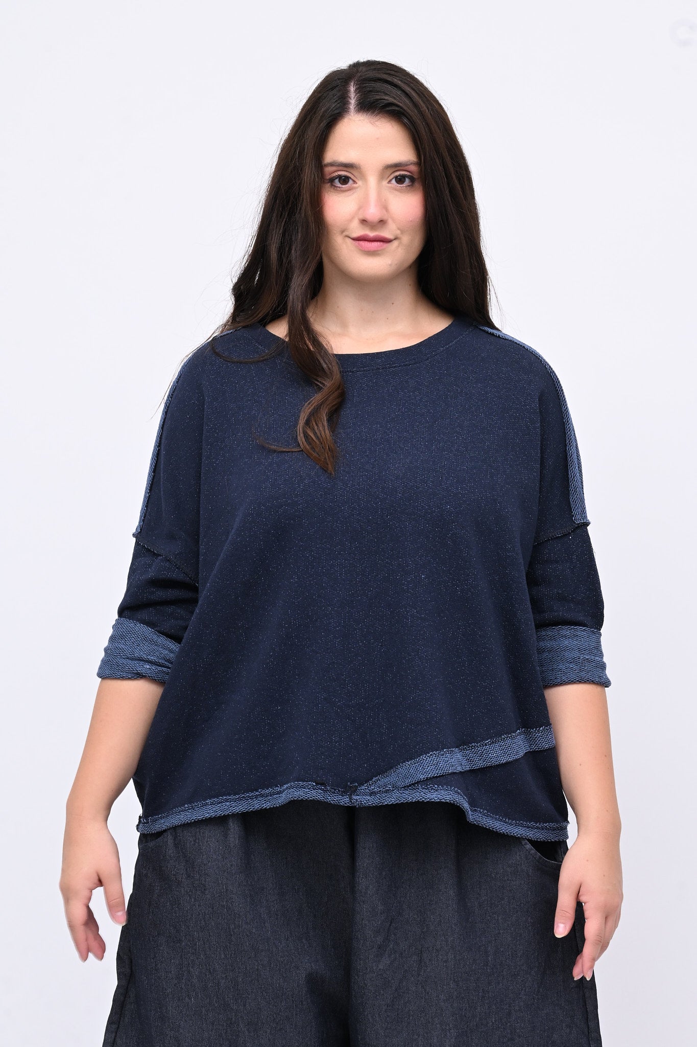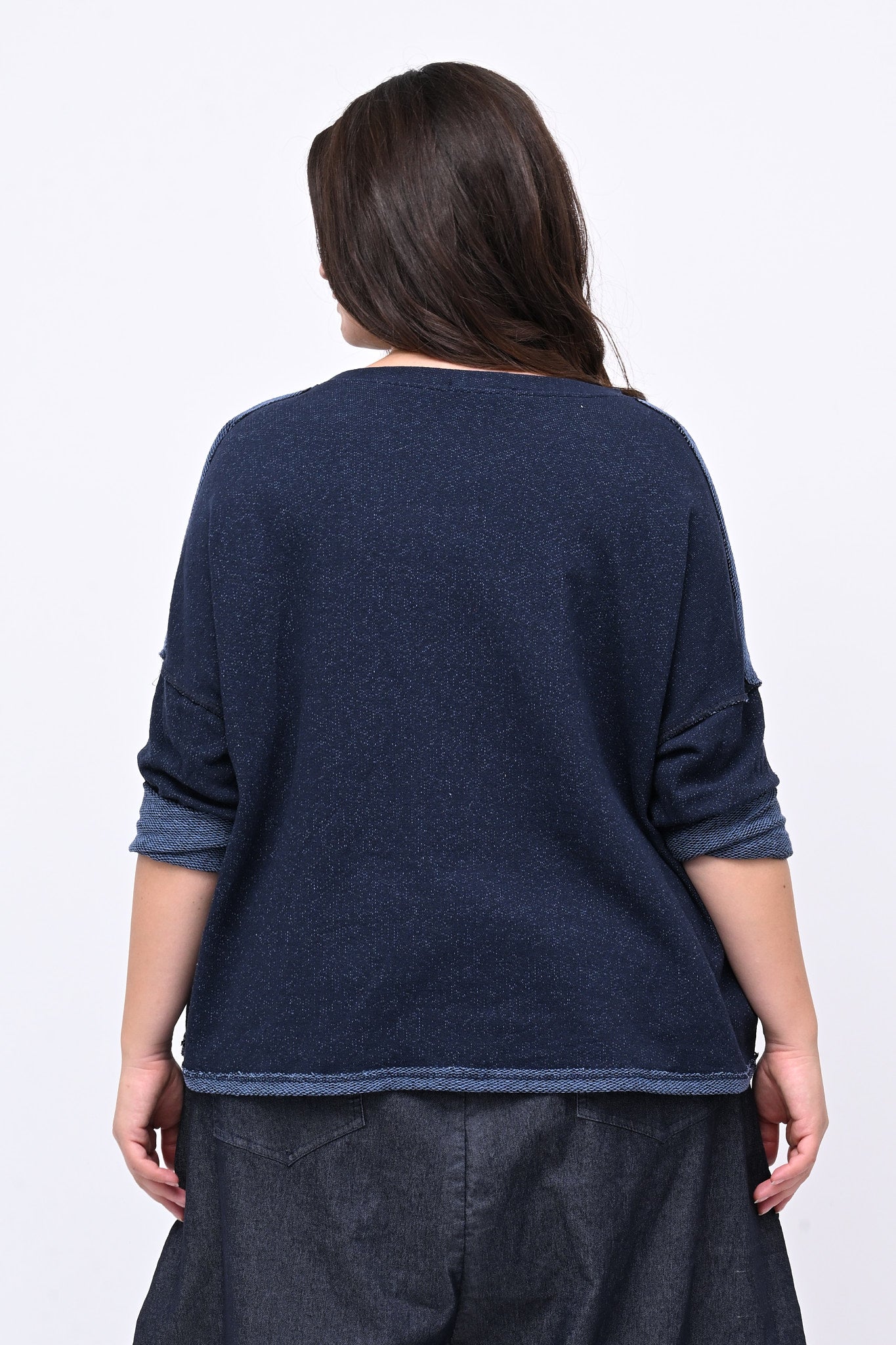 Maglia modello a scatola, in cotone garzato sale e pepe, dalla linea moderna, con spalla scesa e vestibilità comoda. Il taglio leggermente più lungo sul dietro la rende ideale per uno stile versatile, confortevole e sporty chic.