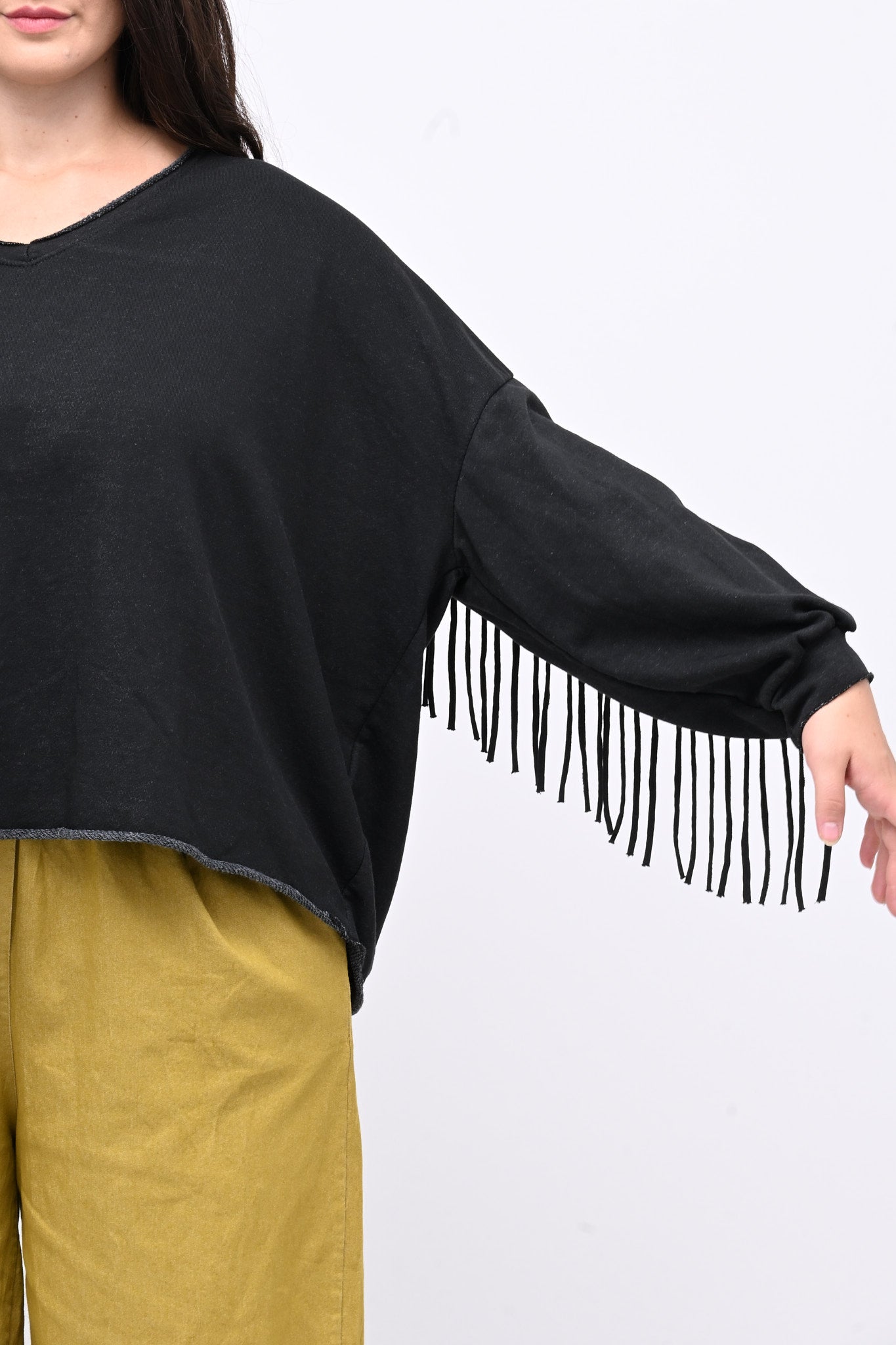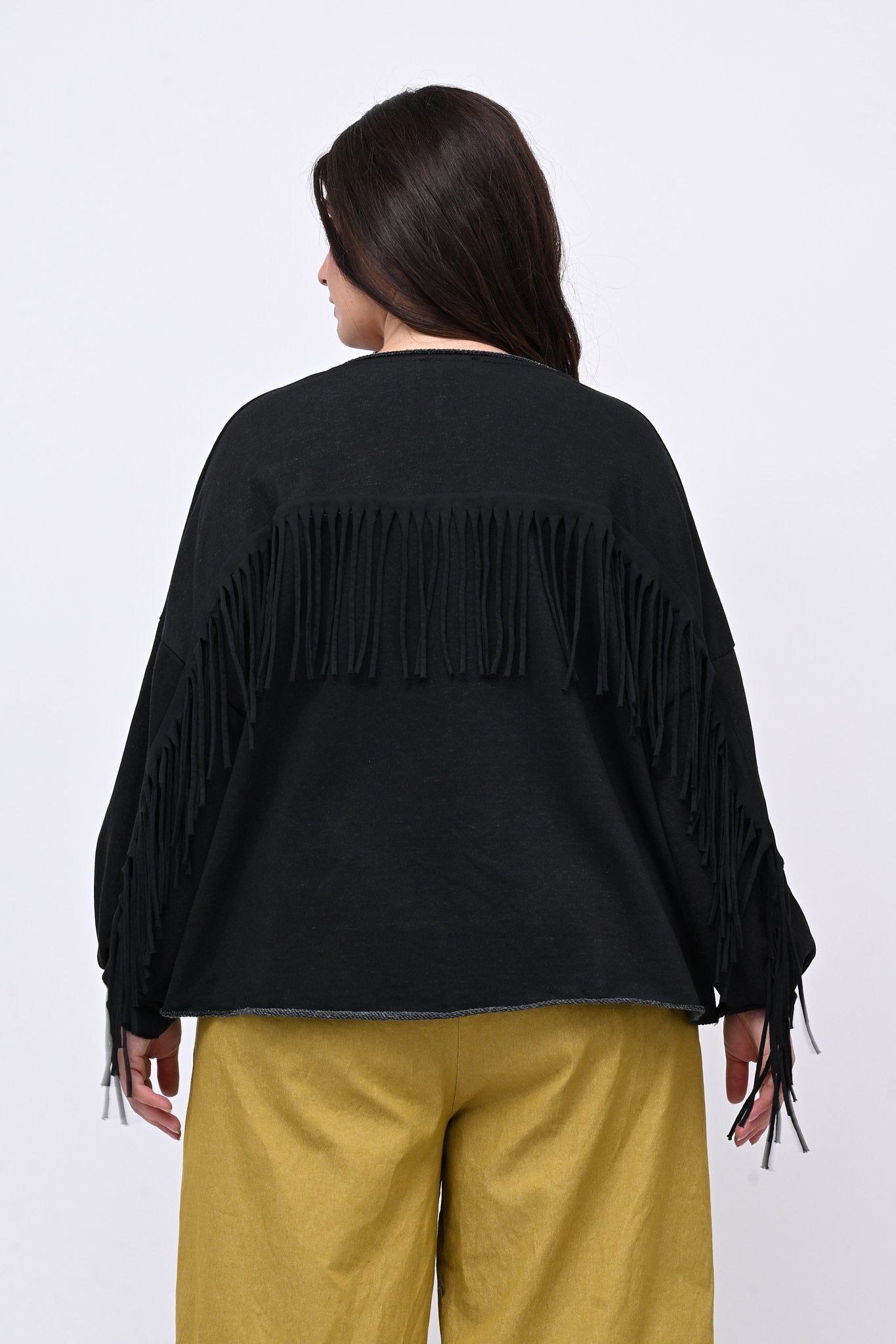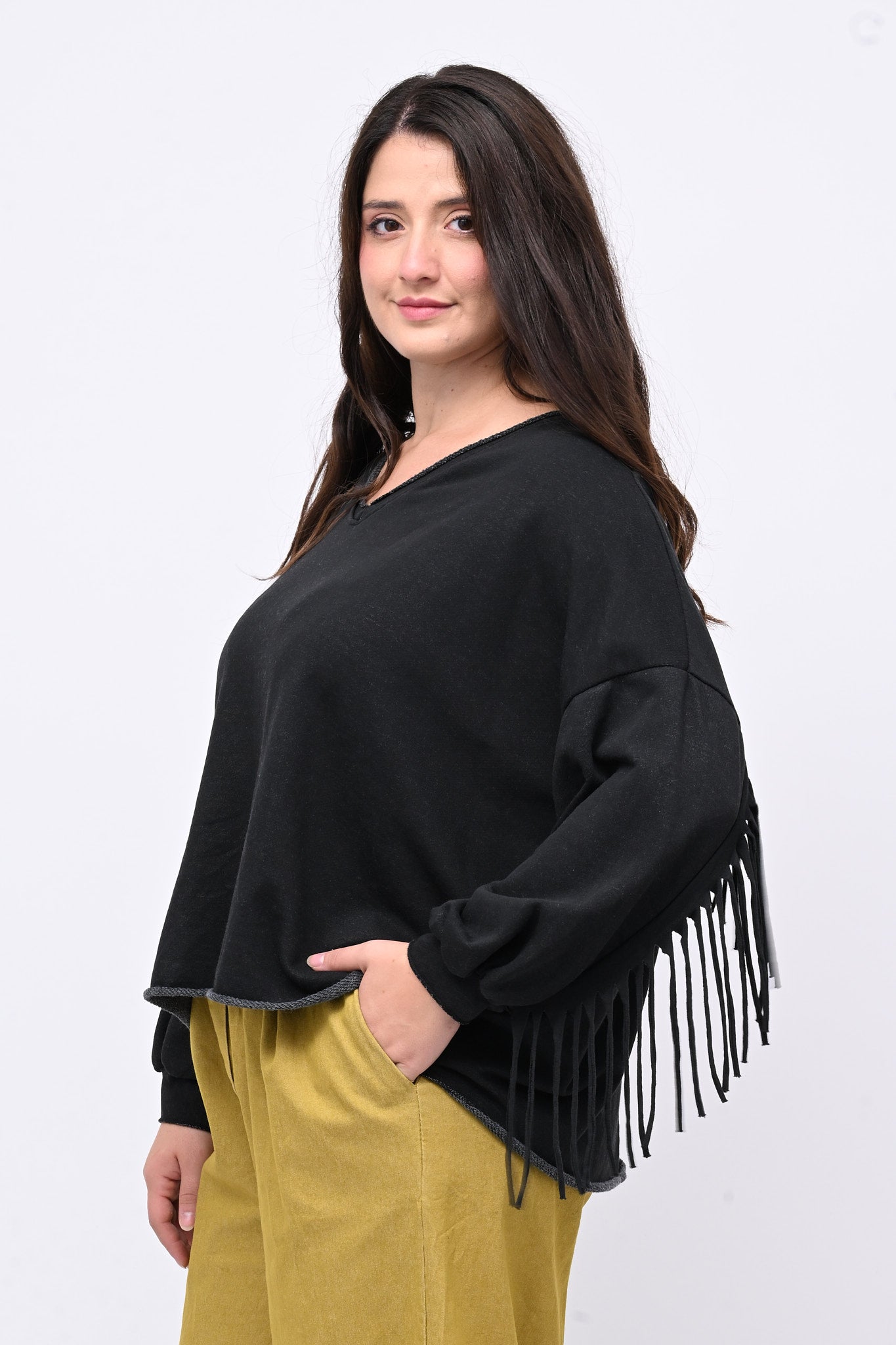 Felpa garzata in misto cotone, scollo a V, leggermente più lunga dietro. Il dettaglio distintivo delle frange sulle maniche e sul retro aggiunge un elemento di originalità e dinamismo al capo. Ideale per valorizzare qualsiasi look casual e moderno.