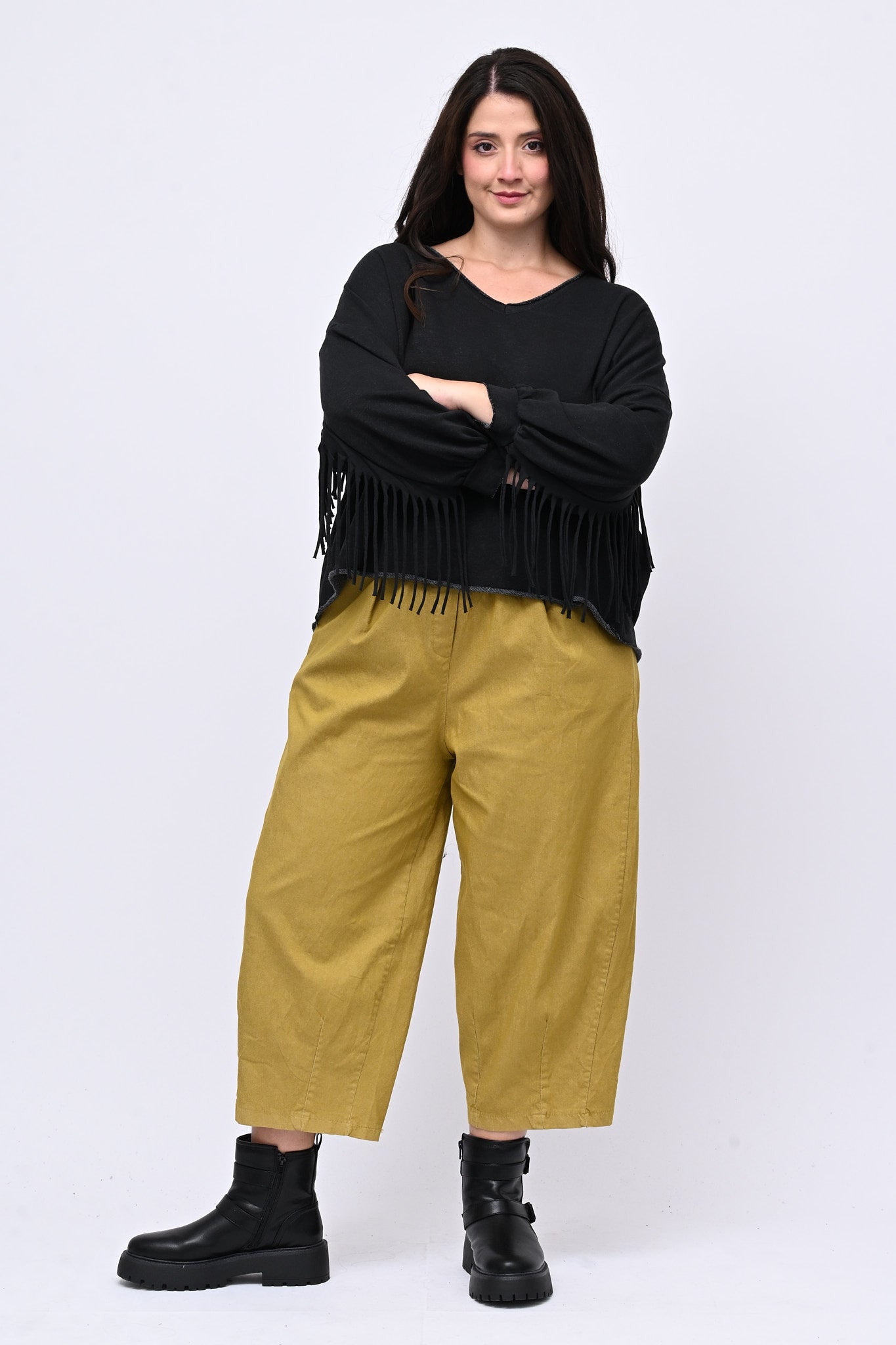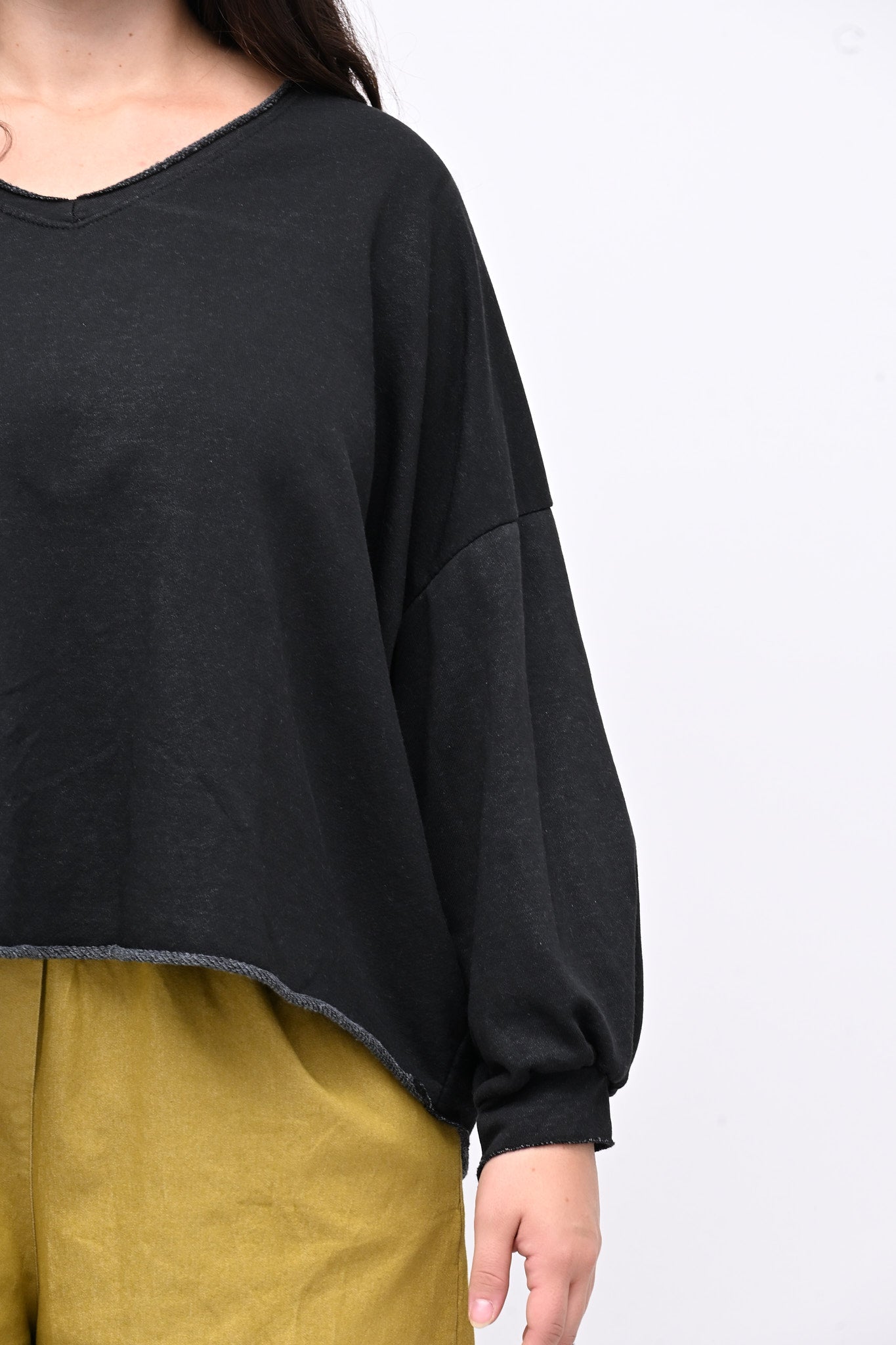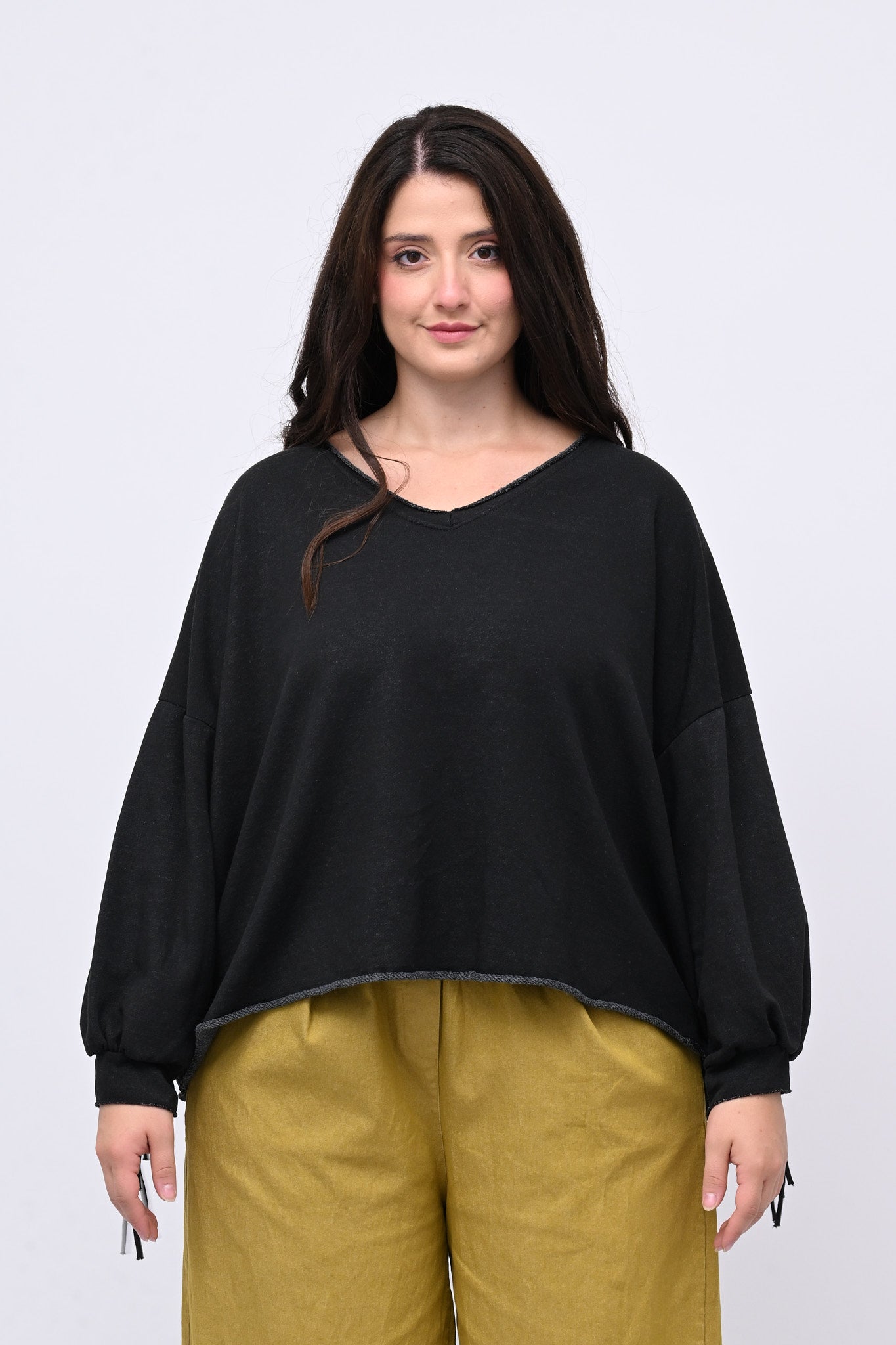 Felpa garzata in misto cotone, scollo a V, leggermente più lunga dietro. Il dettaglio distintivo delle frange sulle maniche e sul retro aggiunge un elemento di originalità e dinamismo al capo. Ideale per valorizzare qualsiasi look casual e moderno.
