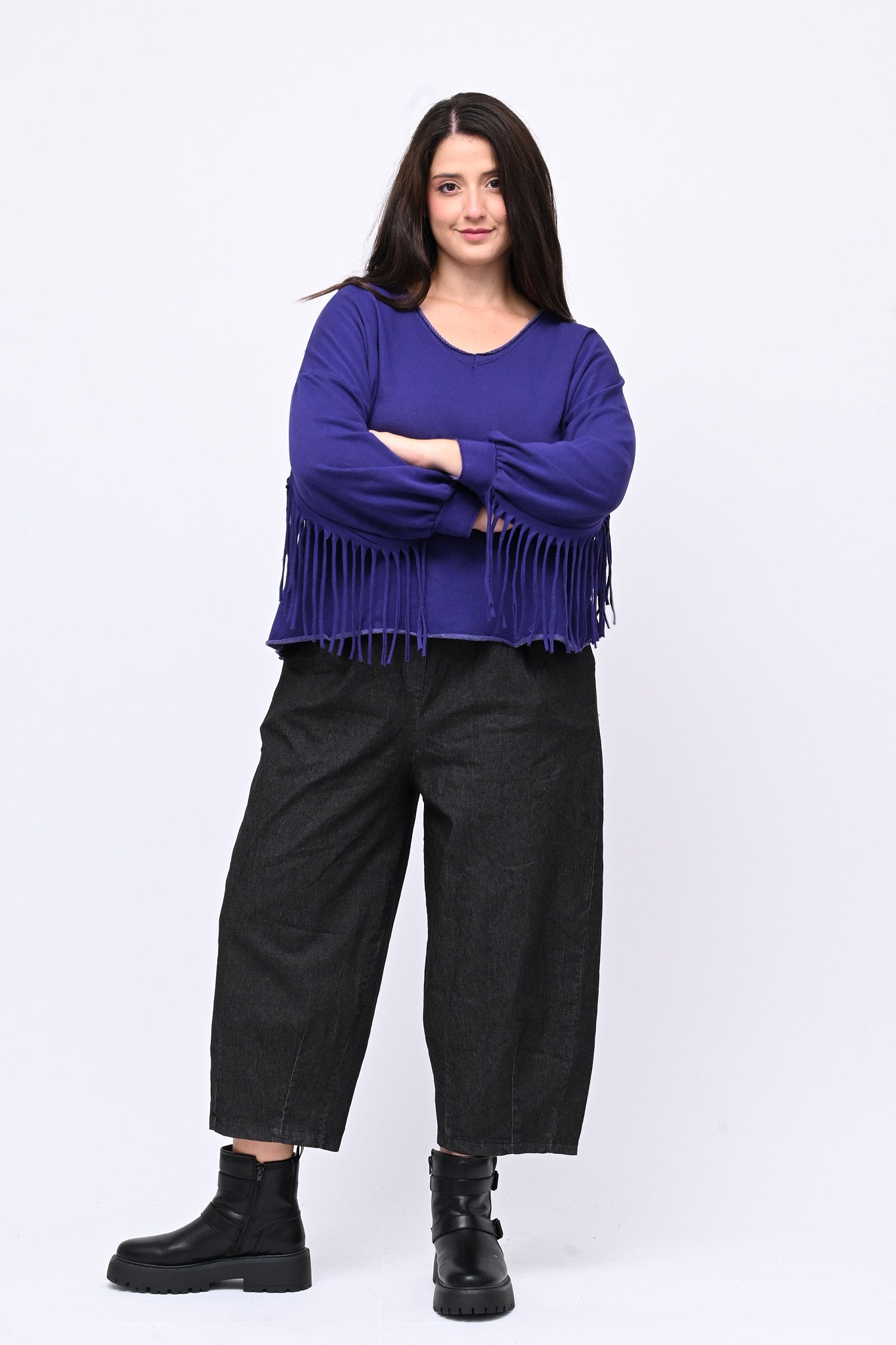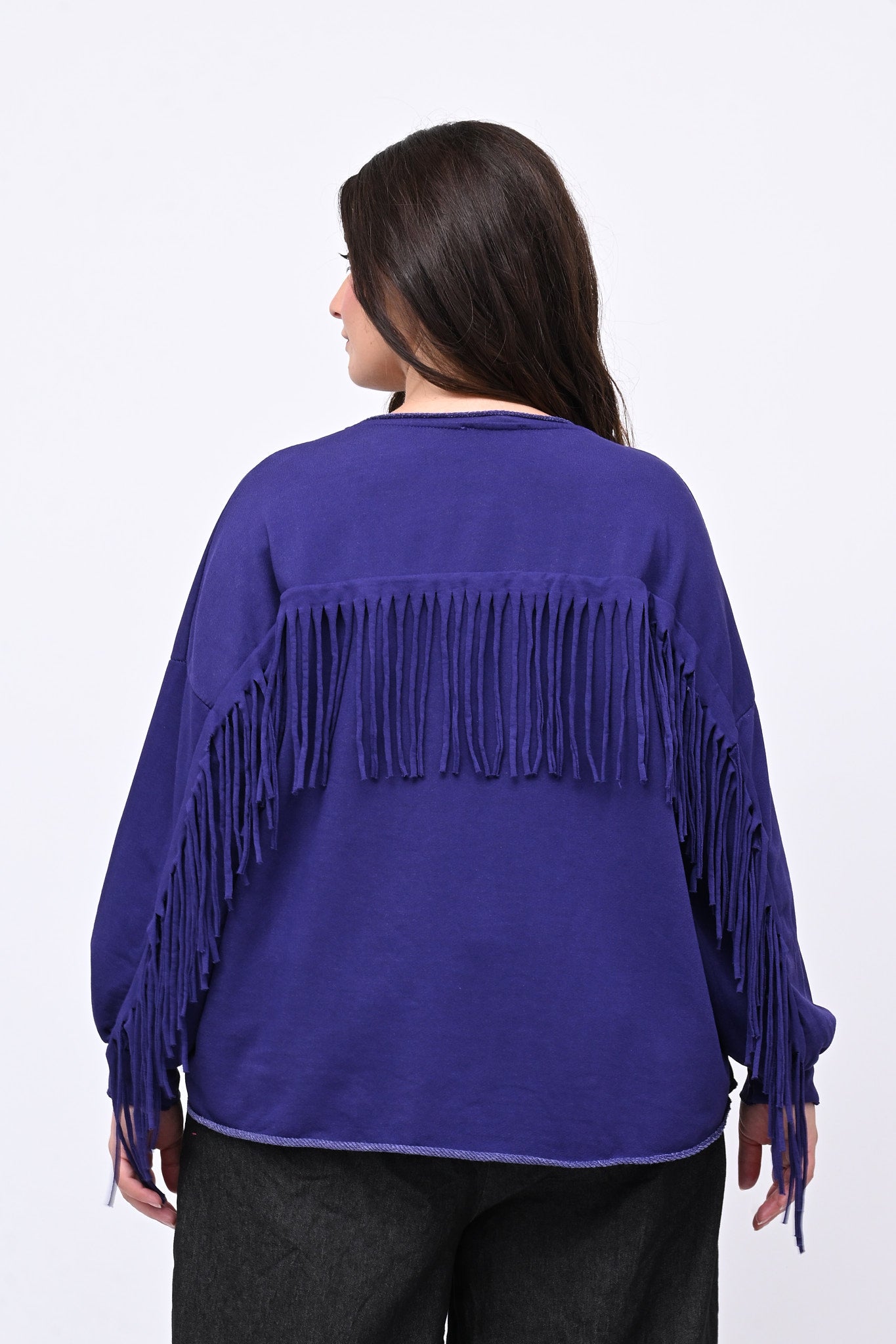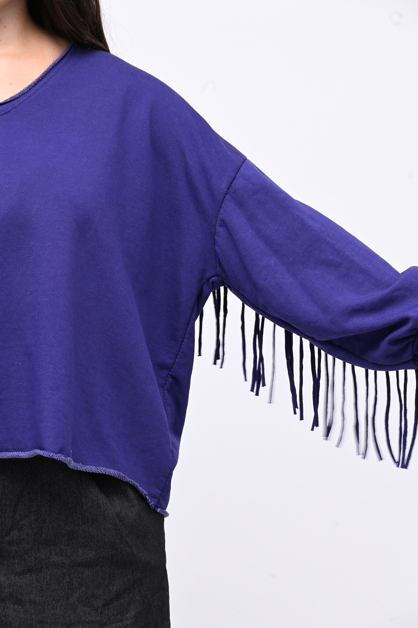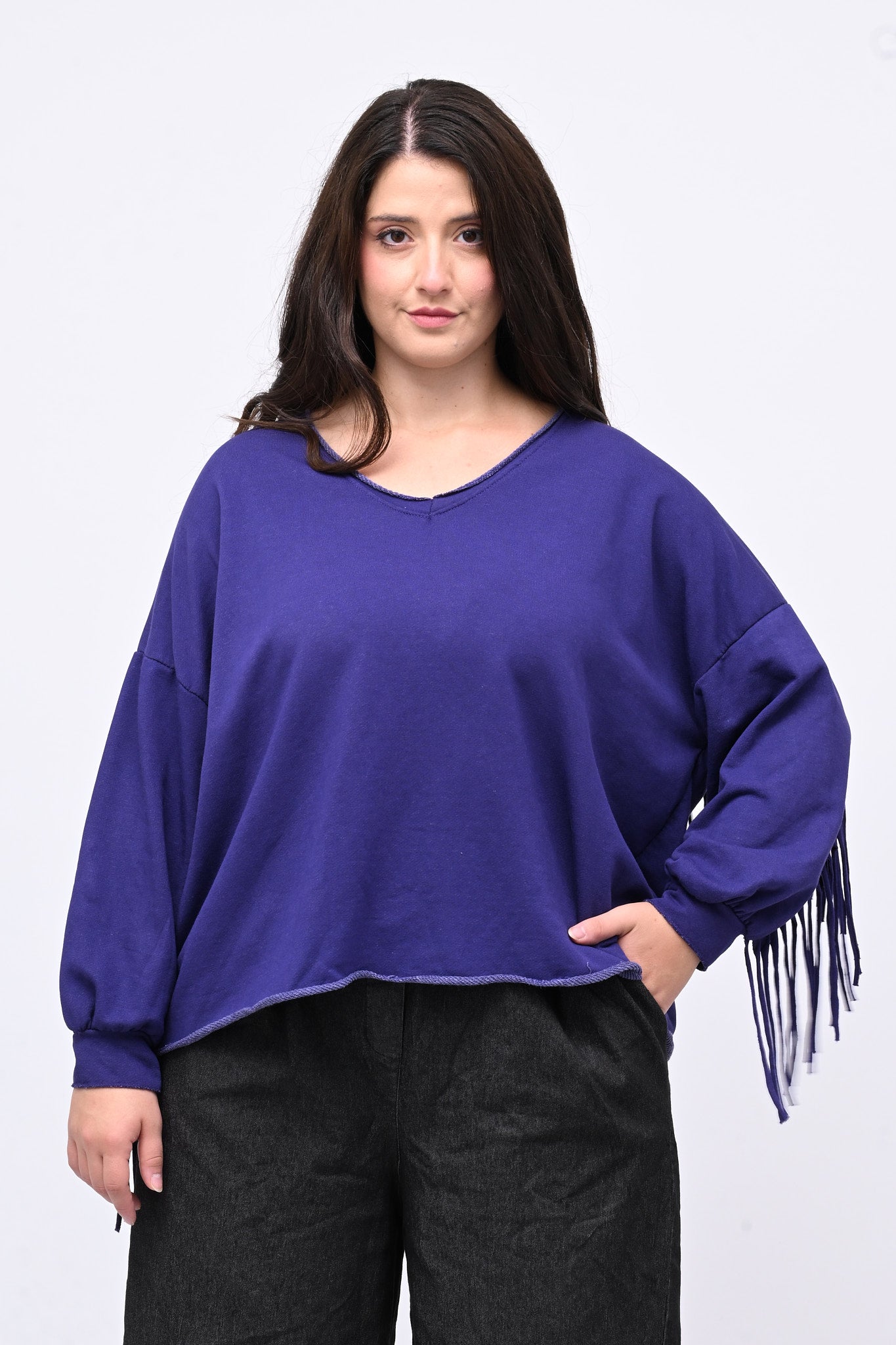 Felpa garzata in misto cotone, scollo a V, leggermente più lunga dietro. Il dettaglio distintivo delle frange sulle maniche e sul retro aggiunge un elemento di originalità e dinamismo al capo. Ideale per valorizzare qualsiasi look casual e moderno.