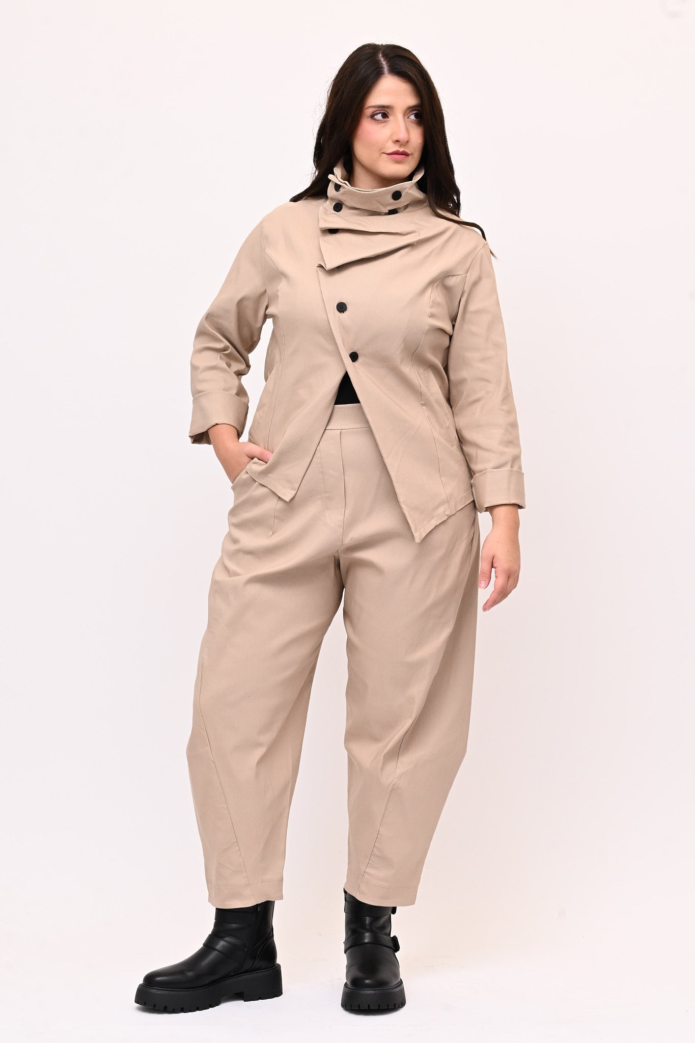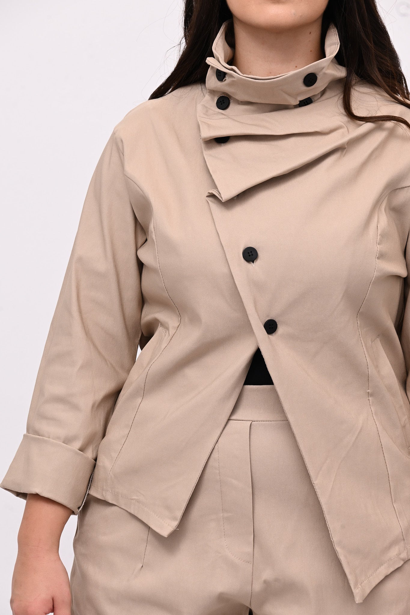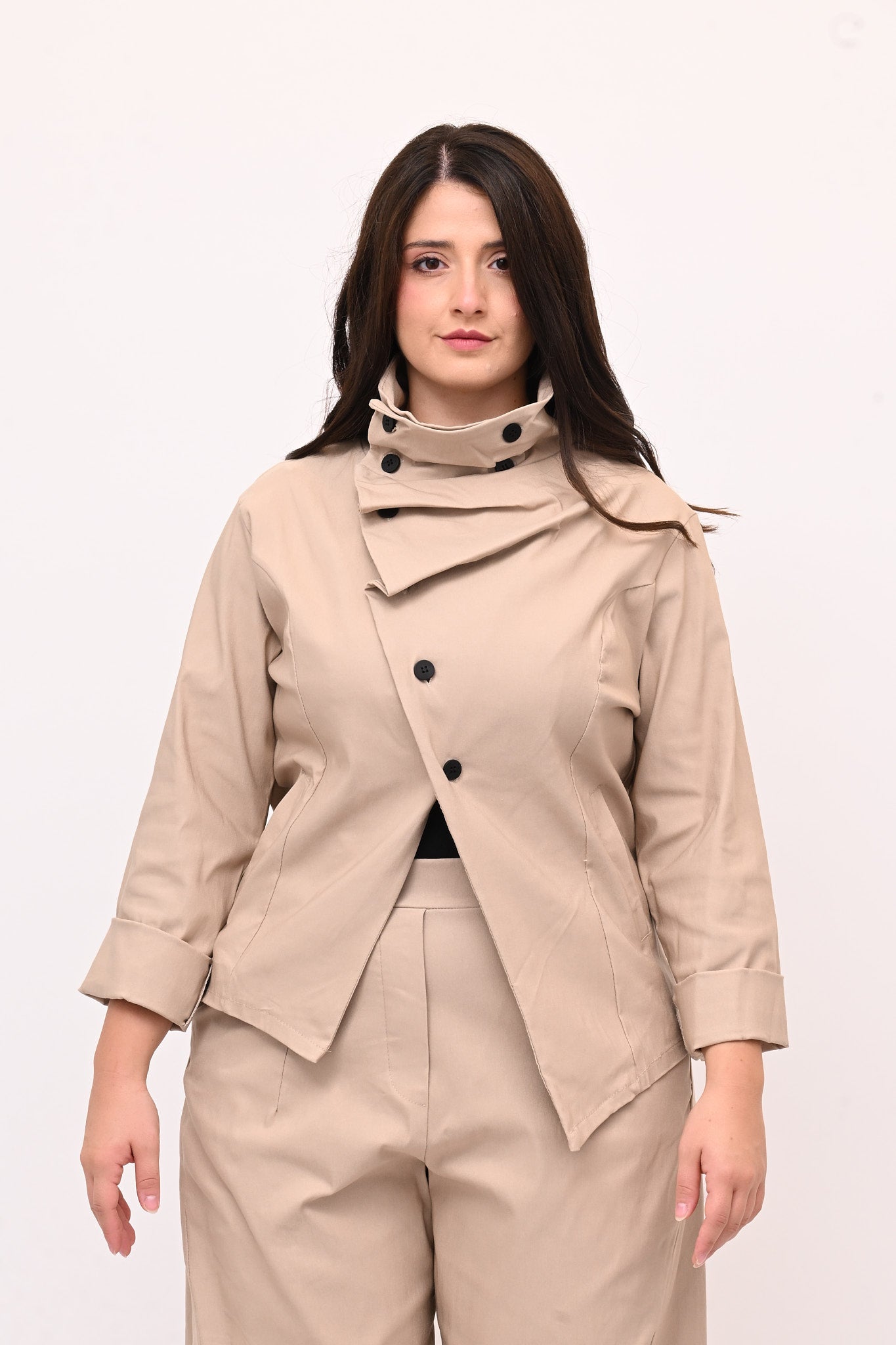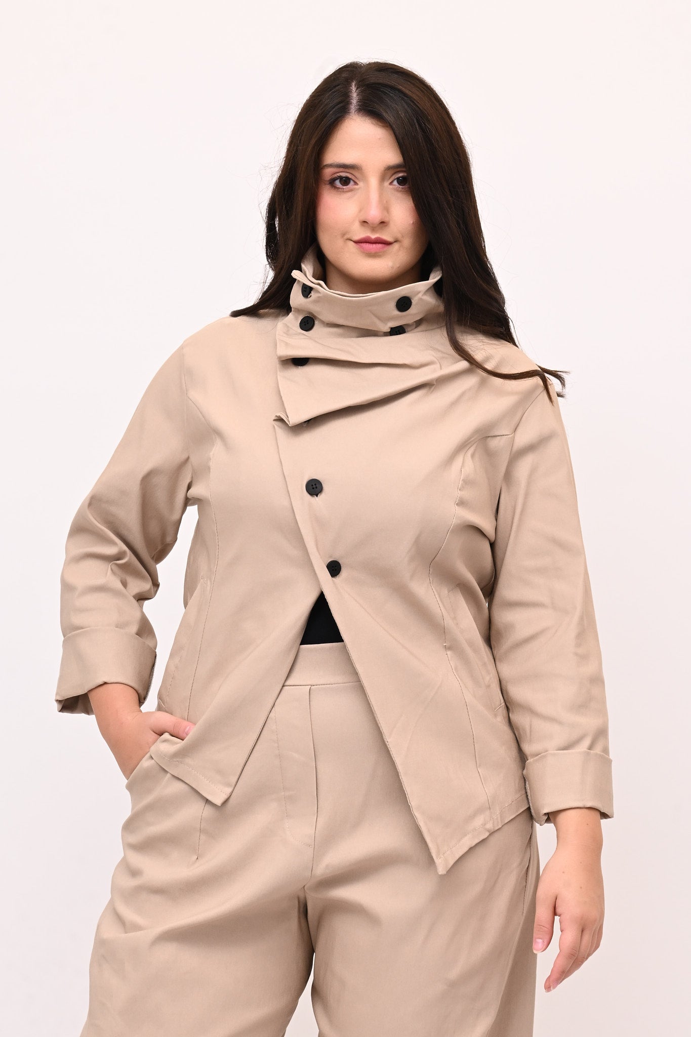 Giacca stile gotico, in bengalina elasticizzata, con chiusura diagonale fino al collo che forma morbide pinces quando è completamente abbottonata. Lo stile contemporaneo di questo capo è ideale per un look audace e stiloso.