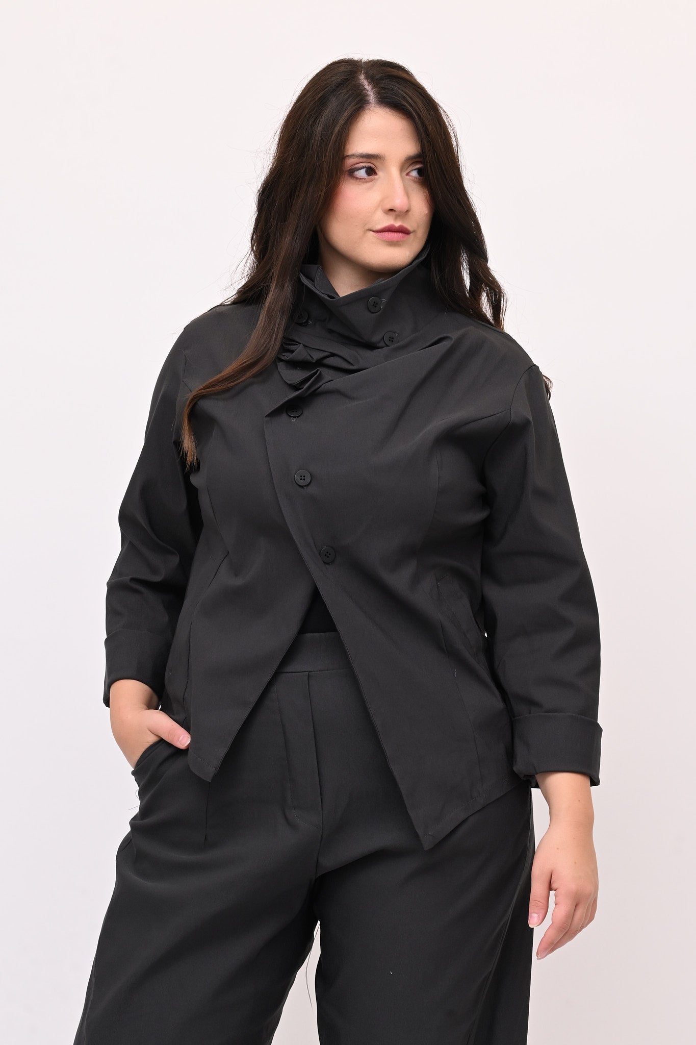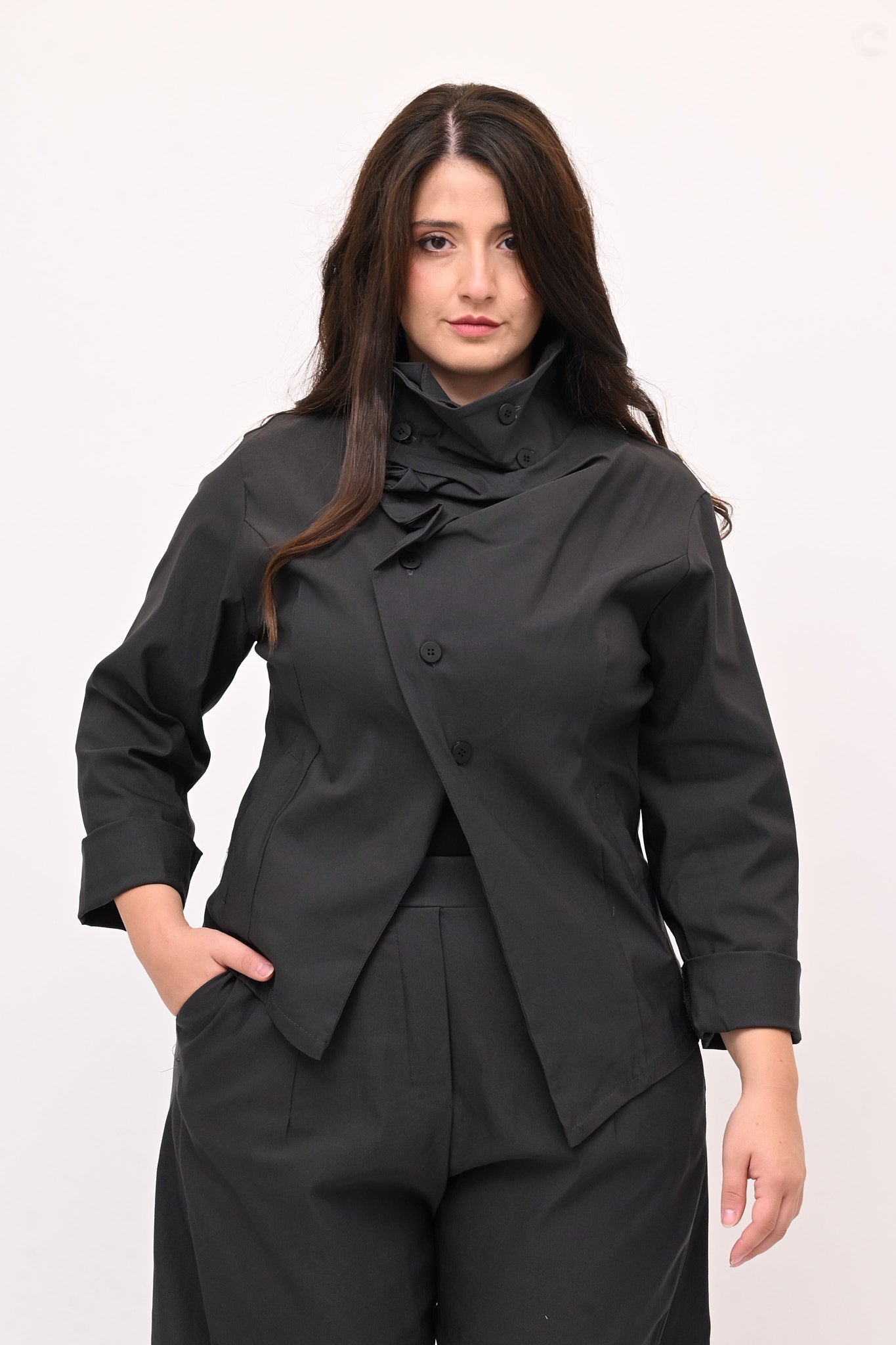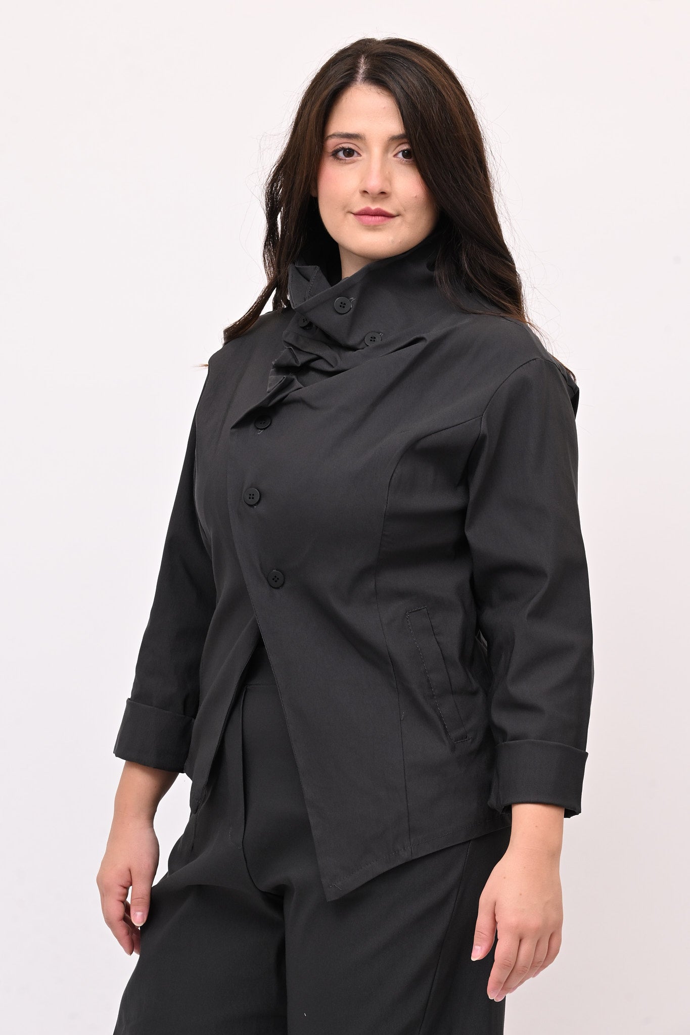 Giacca stile gotico, in bengalina elasticizzata, con chiusura diagonale fino al collo che forma morbide pinces quando è completamente abbottonata. Lo stile contemporaneo di questo capo è ideale per un look audace e stiloso.