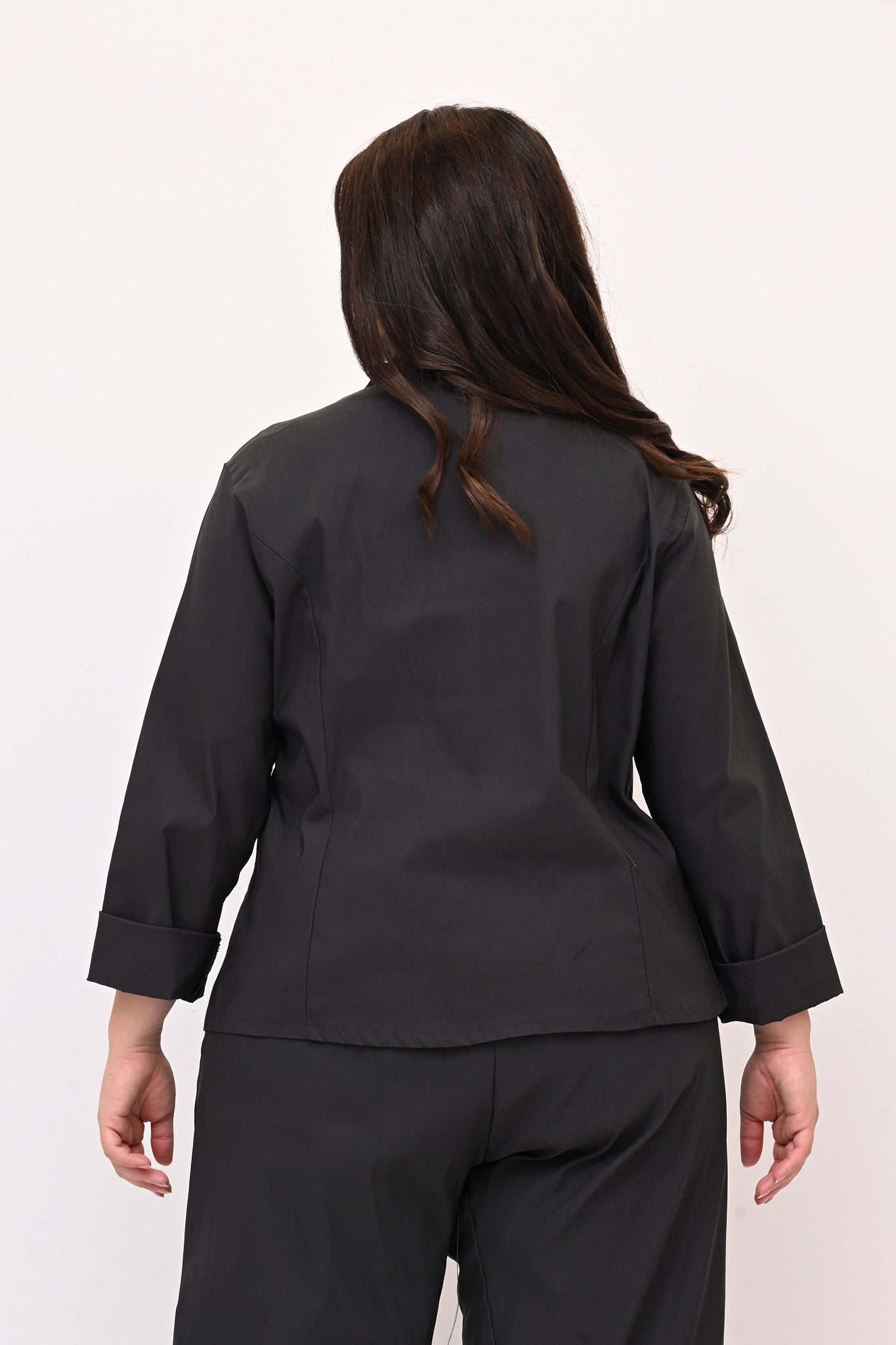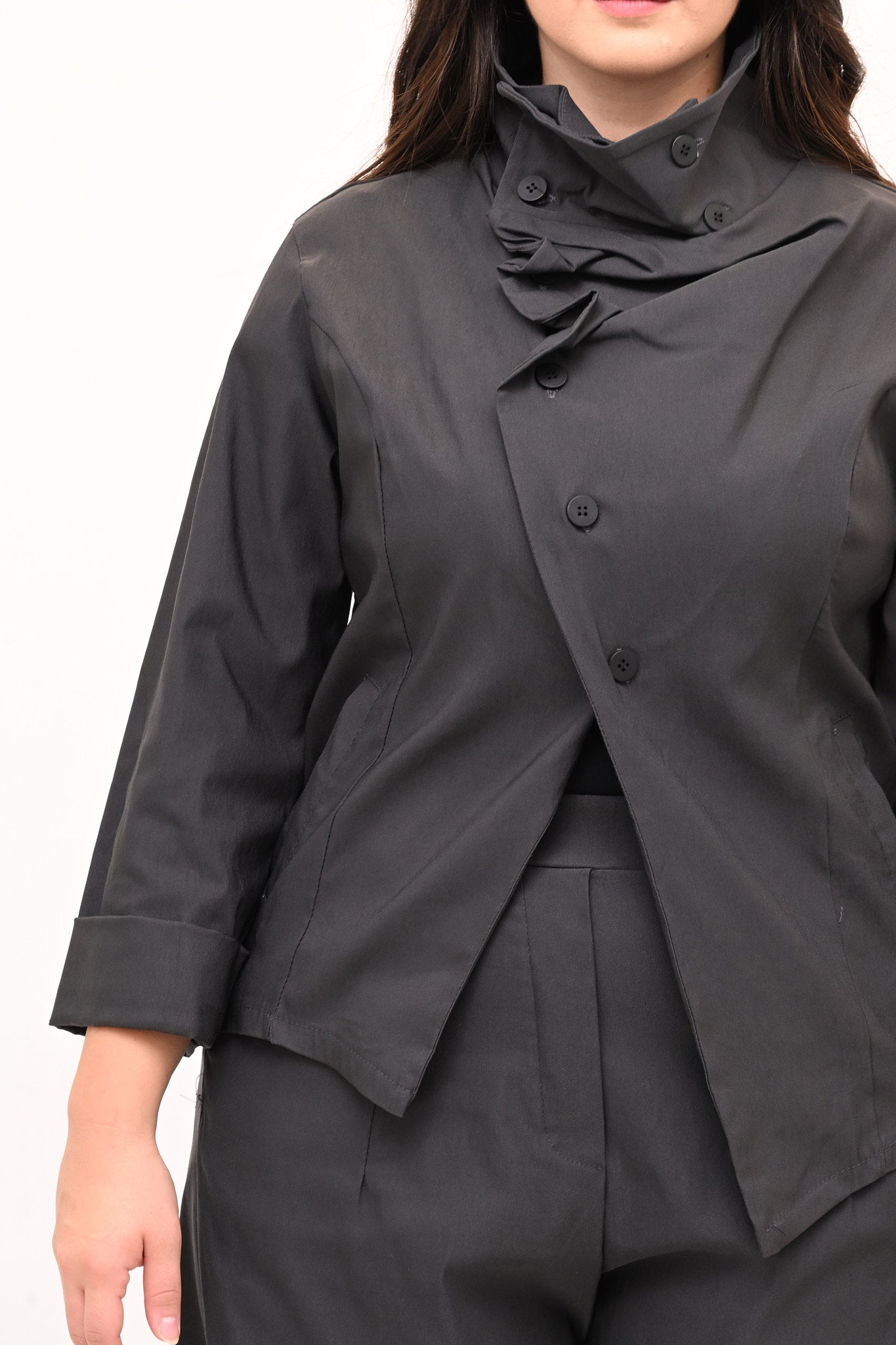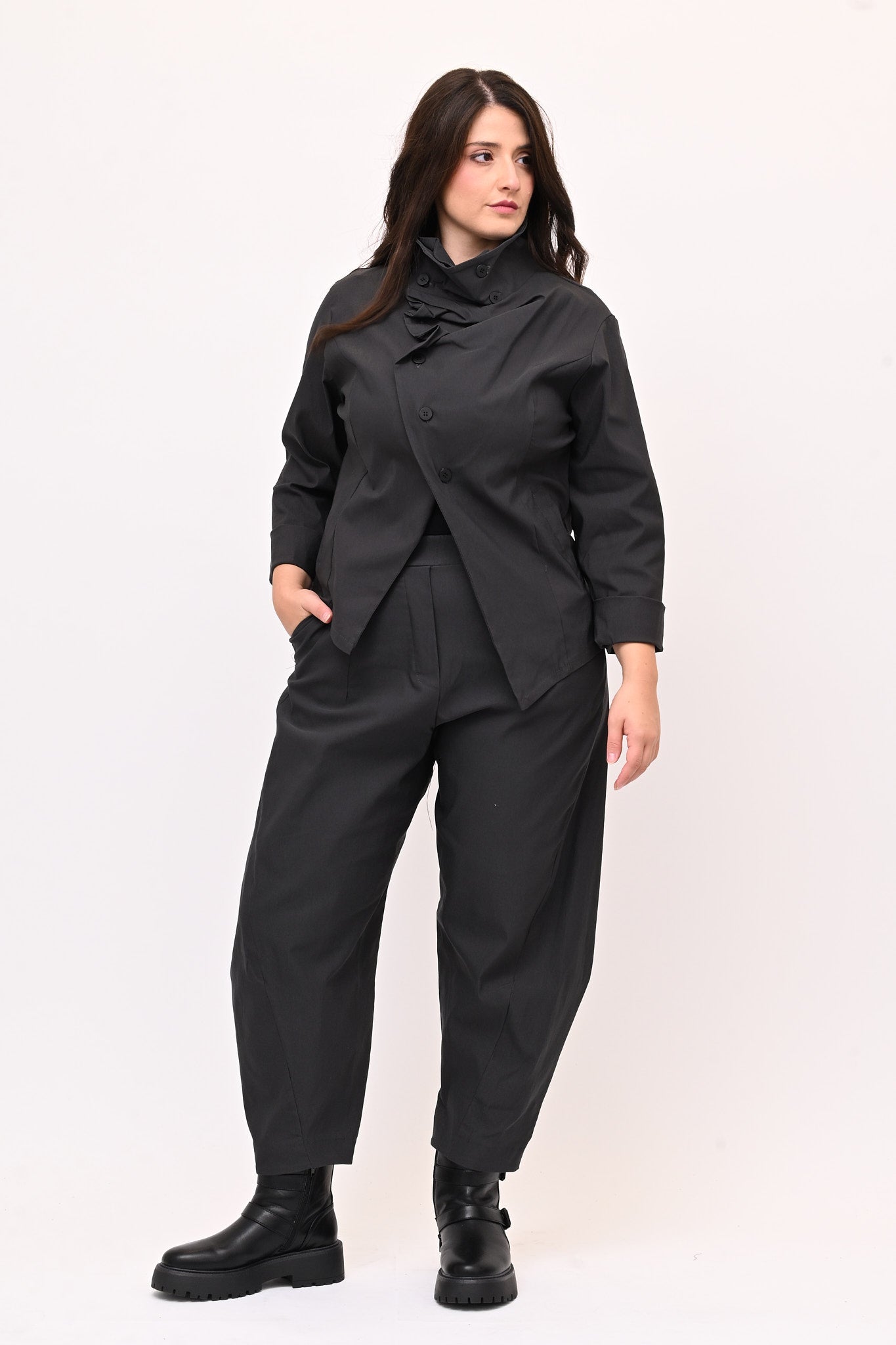 Giacca stile gotico, in bengalina elasticizzata, con chiusura diagonale fino al collo che forma morbide pinces quando è completamente abbottonata. Lo stile contemporaneo di questo capo è ideale per un look audace e stiloso.