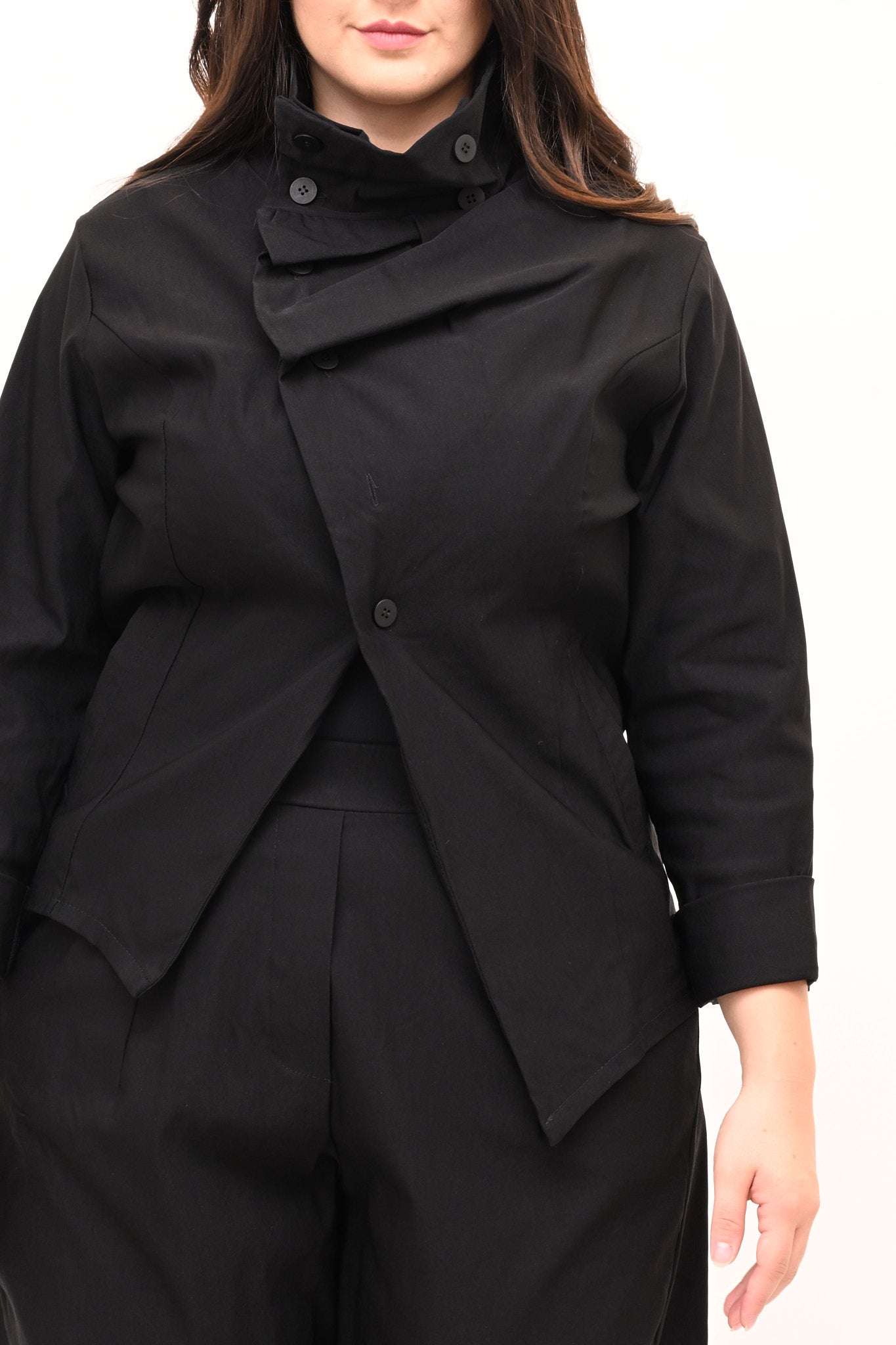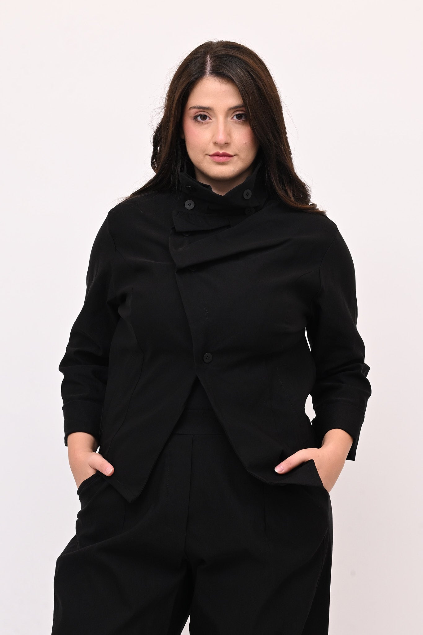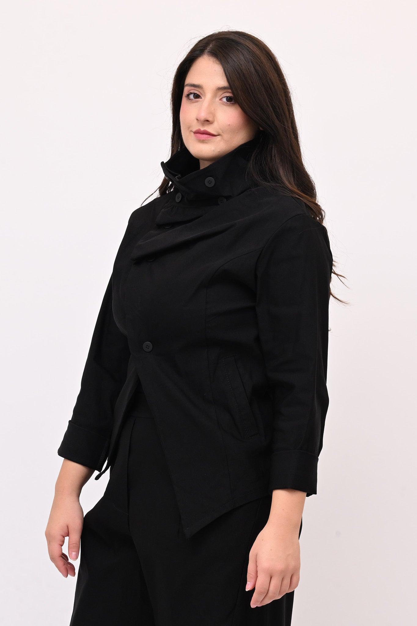 Giacca stile gotico, in bengalina elasticizzata, con chiusura diagonale fino al collo che forma morbide pinces quando è completamente abbottonata. Lo stile contemporaneo di questo capo è ideale per un look audace e stiloso.