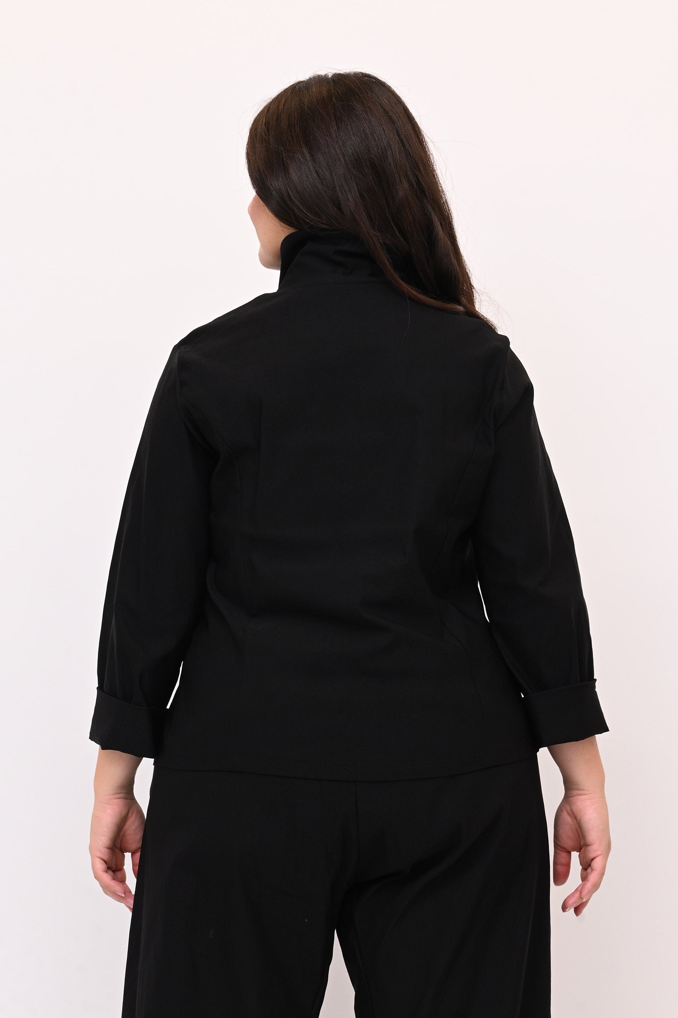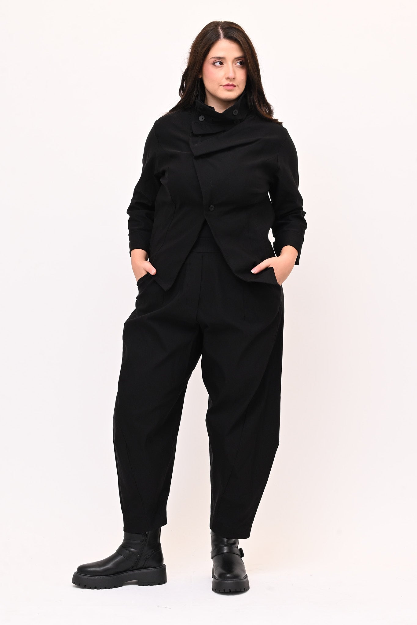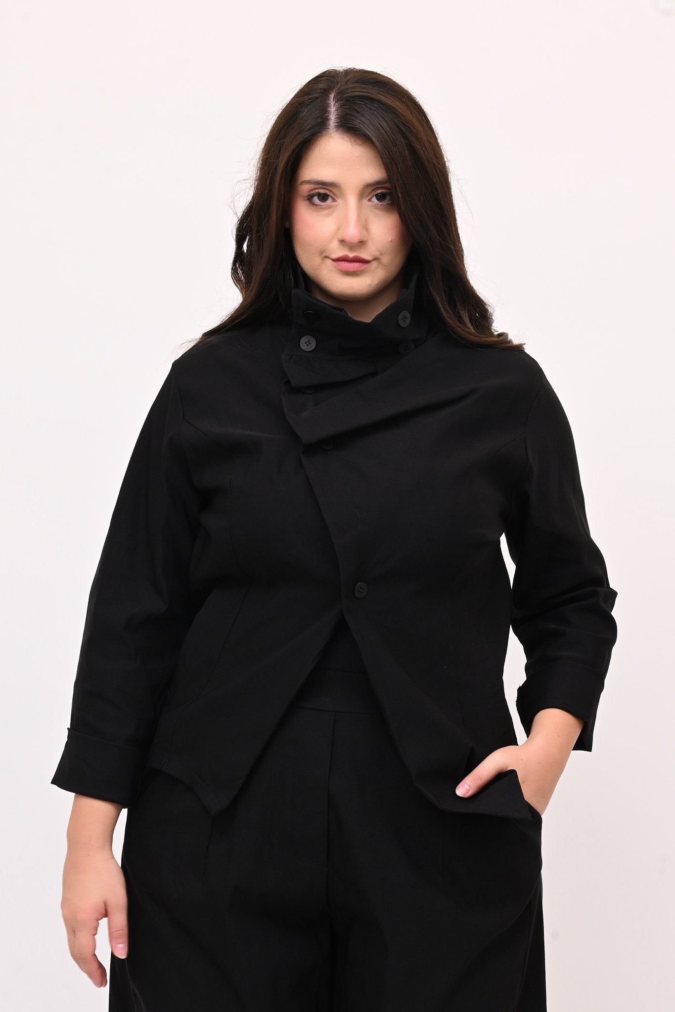 Giacca stile gotico, in bengalina elasticizzata, con chiusura diagonale fino al collo che forma morbide pinces quando è completamente abbottonata. Lo stile contemporaneo di questo capo è ideale per un look audace e stiloso.