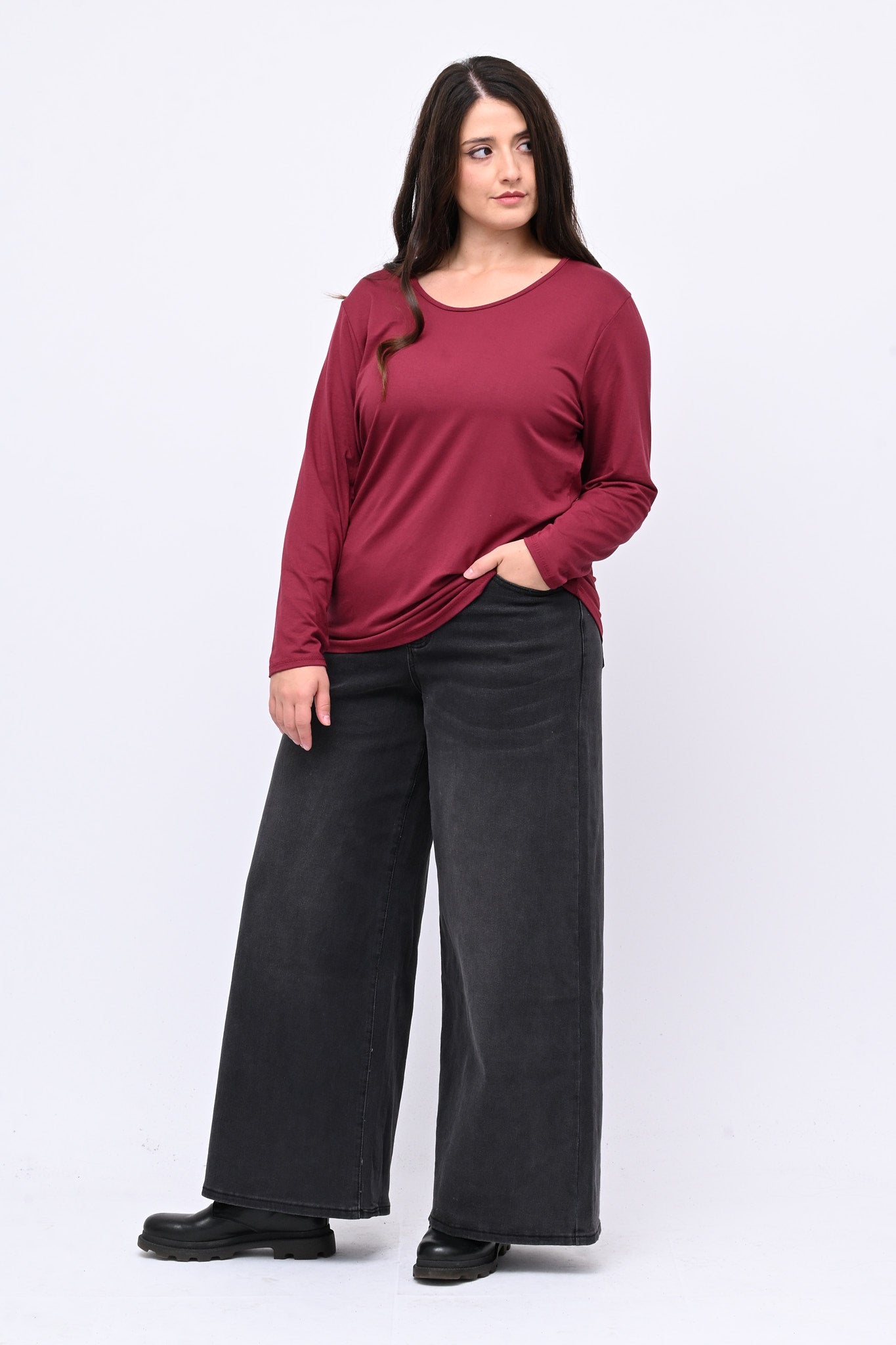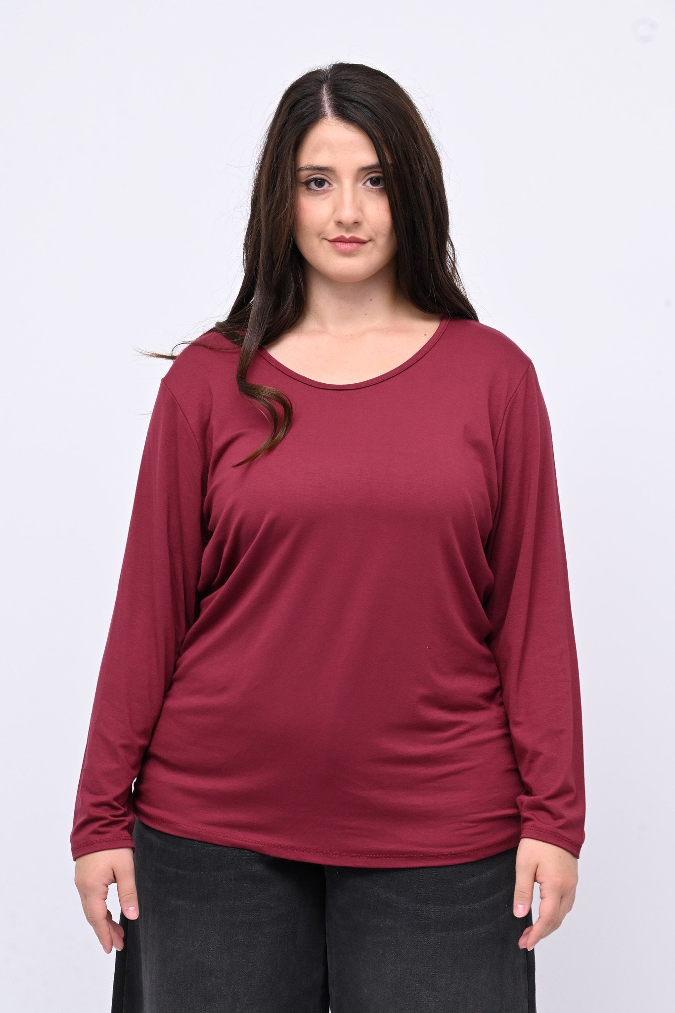 Maglia basica in viscosa elasticizzata, girocollo, manica lunga. Perfetta come capo sottotutto, un vero must have per chi cerca stile, praticità e comfort senza rinunciare a un look versatile.