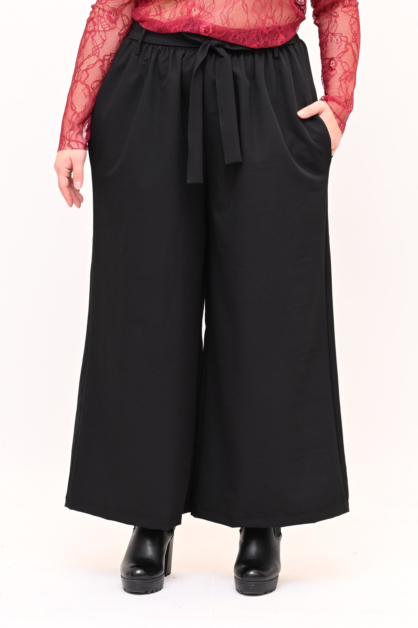Pantalone a palazzo, con elastico in vita, laccio integrato, piccole pinces e tasche laterali. Un modello dalla linea classica, che unisce femminilità e comfort. Perfetto per chi ricerca un capo versatile da indossare in molteplici occasioni.