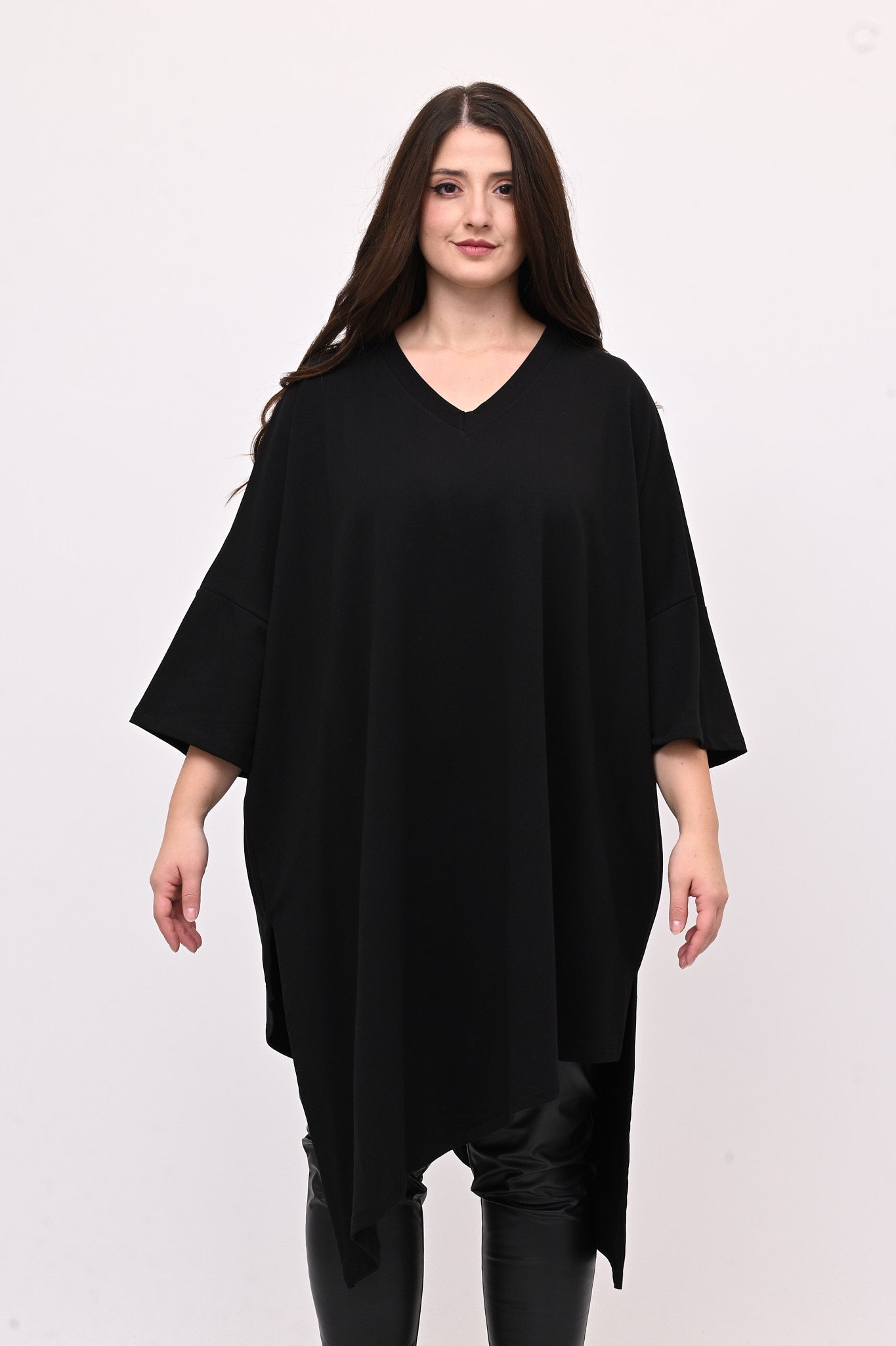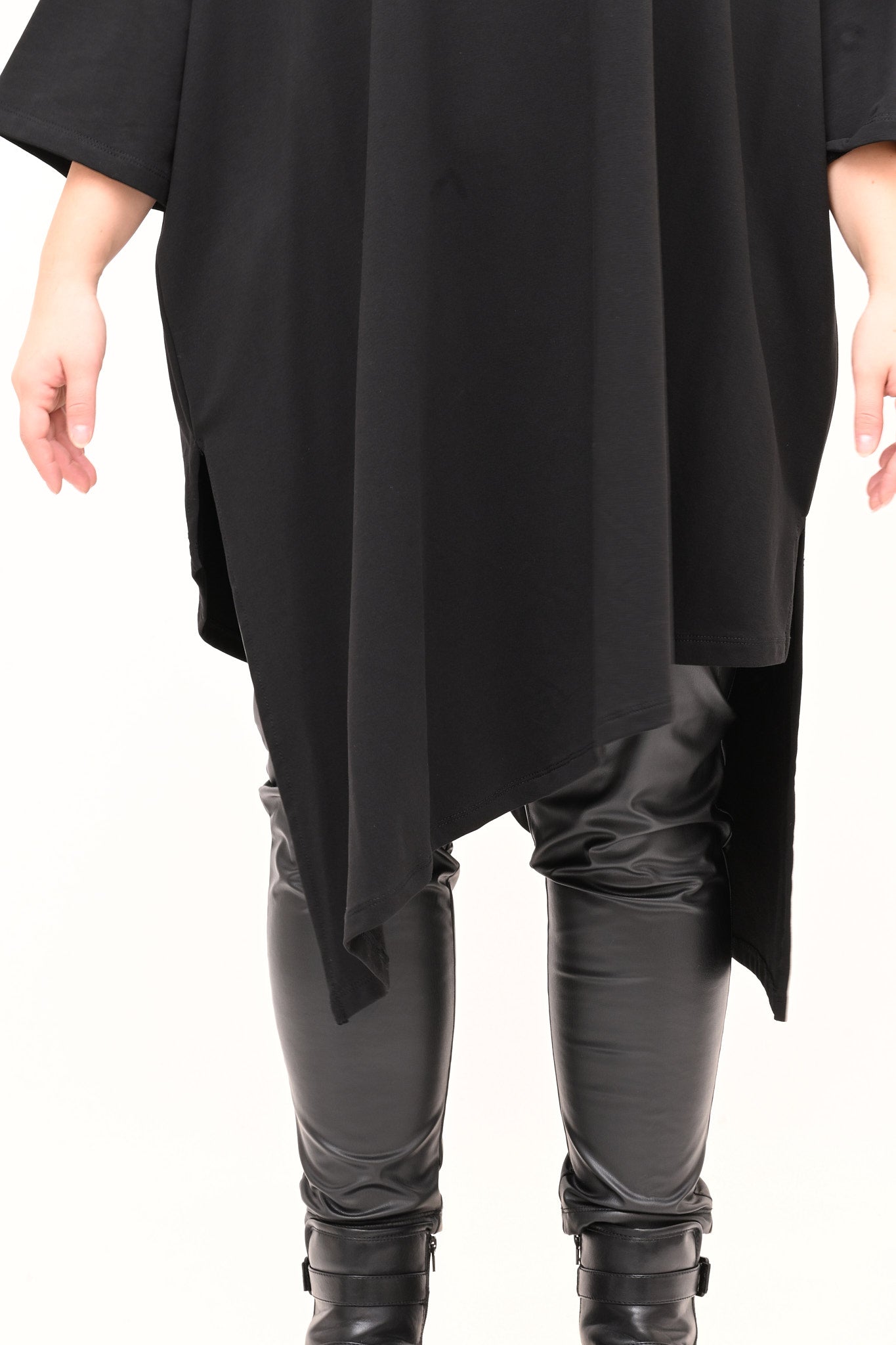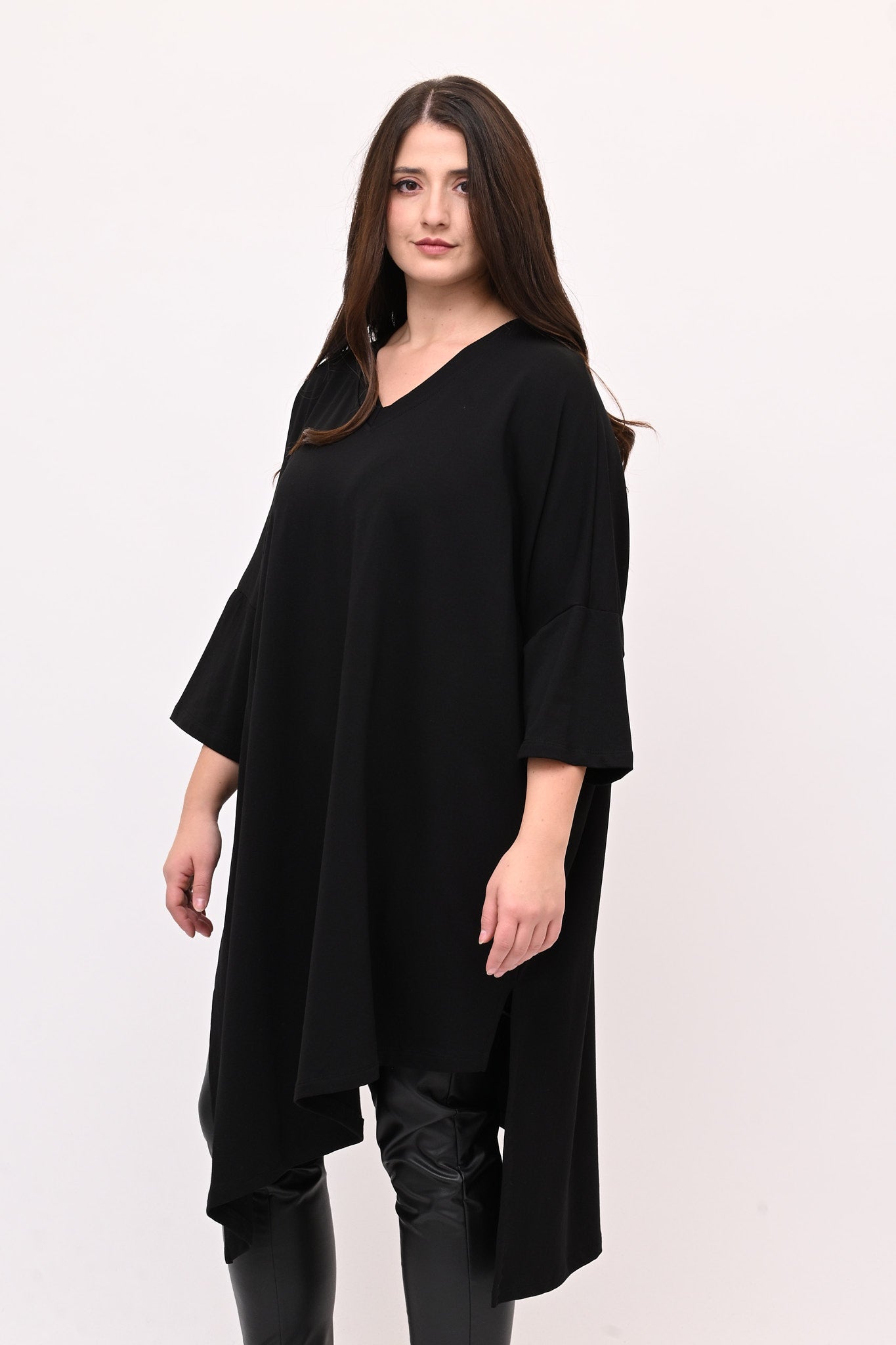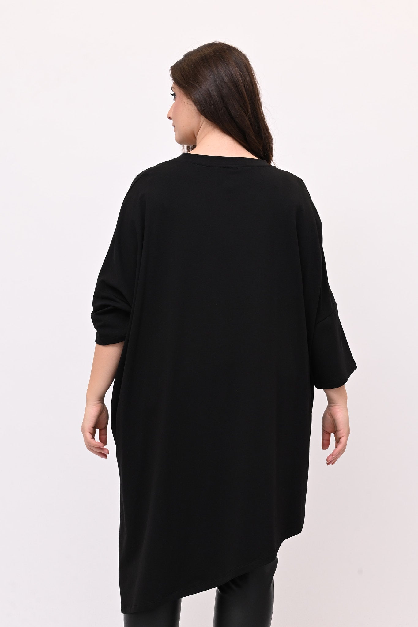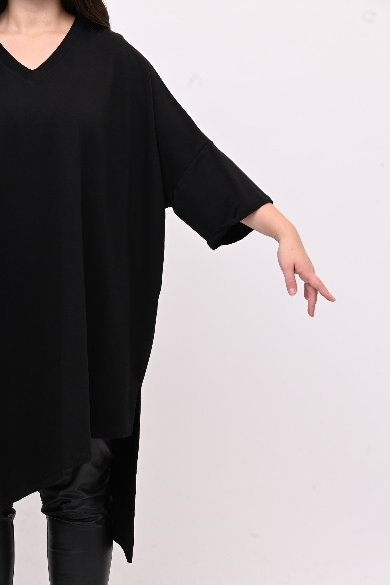 Maxi maglia, in maglina di cotone elasticizzato, scollo a V e maniche 7/8 con polso alto. Il design asimmetrico del fondo crea giochi di spacchi e punte che donano movimento e personalità al capo. Perfetta per chi ricerca uno stile moderno e femminile senza rinunciare al comfort quotidiano.