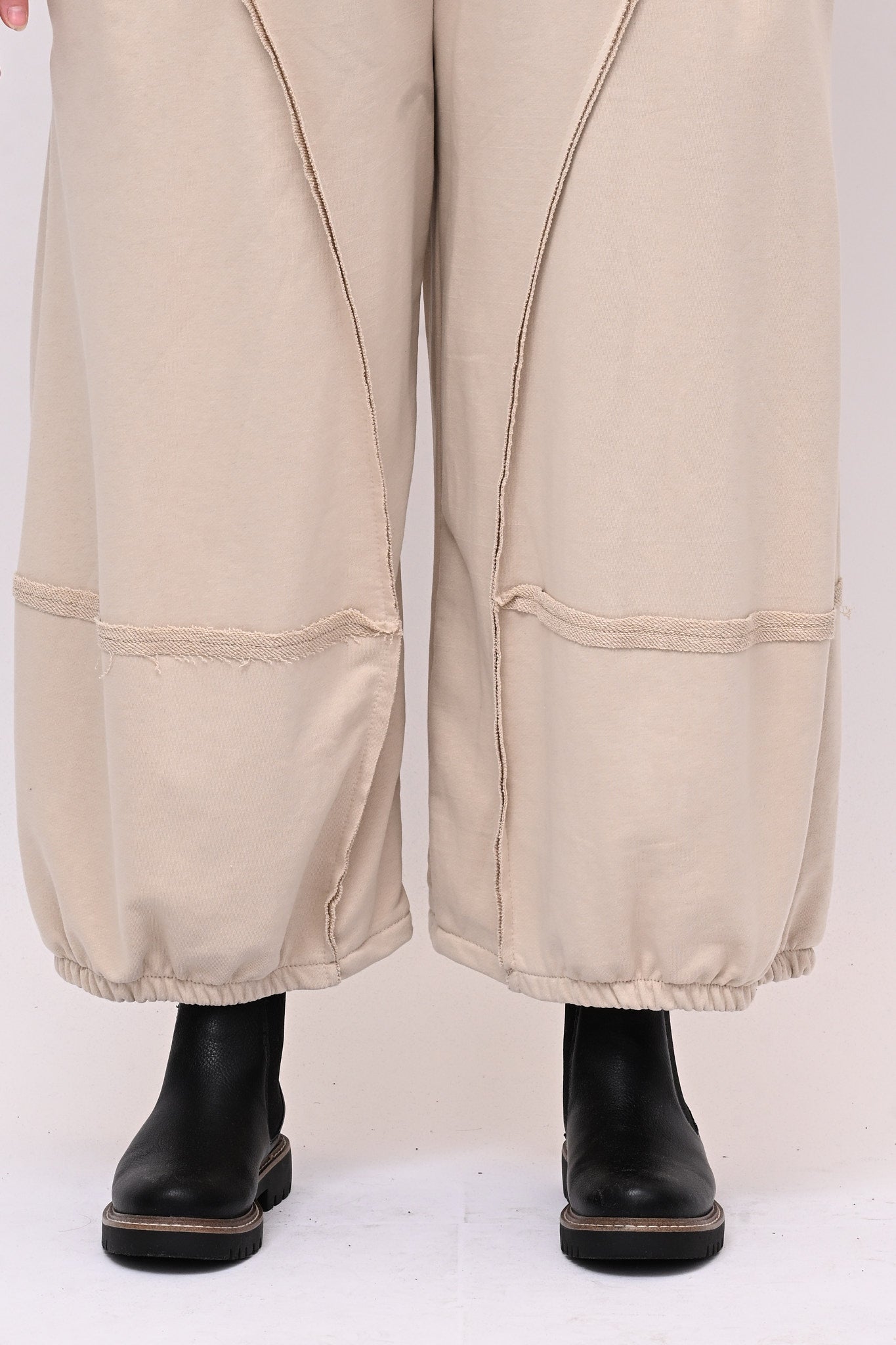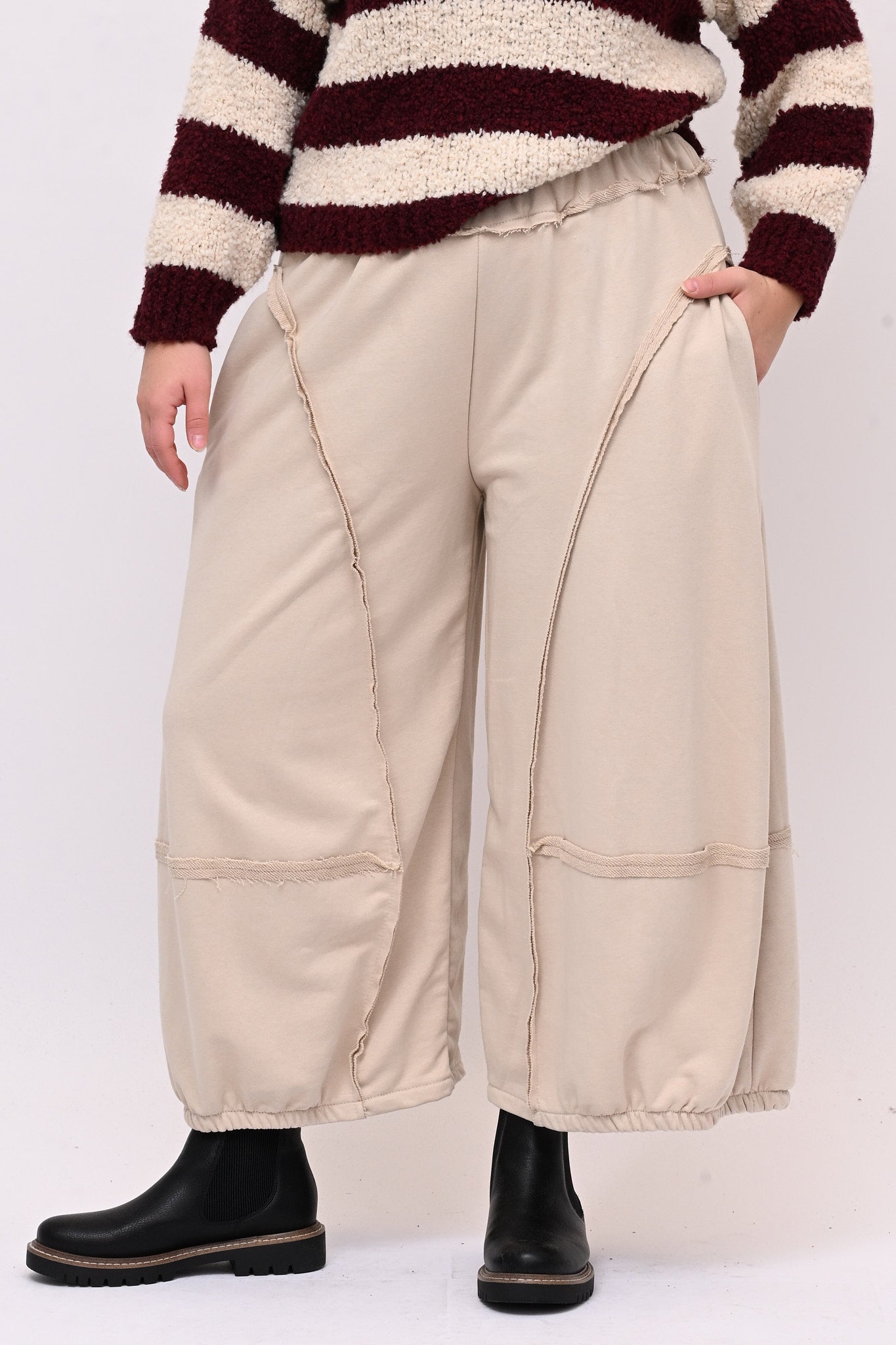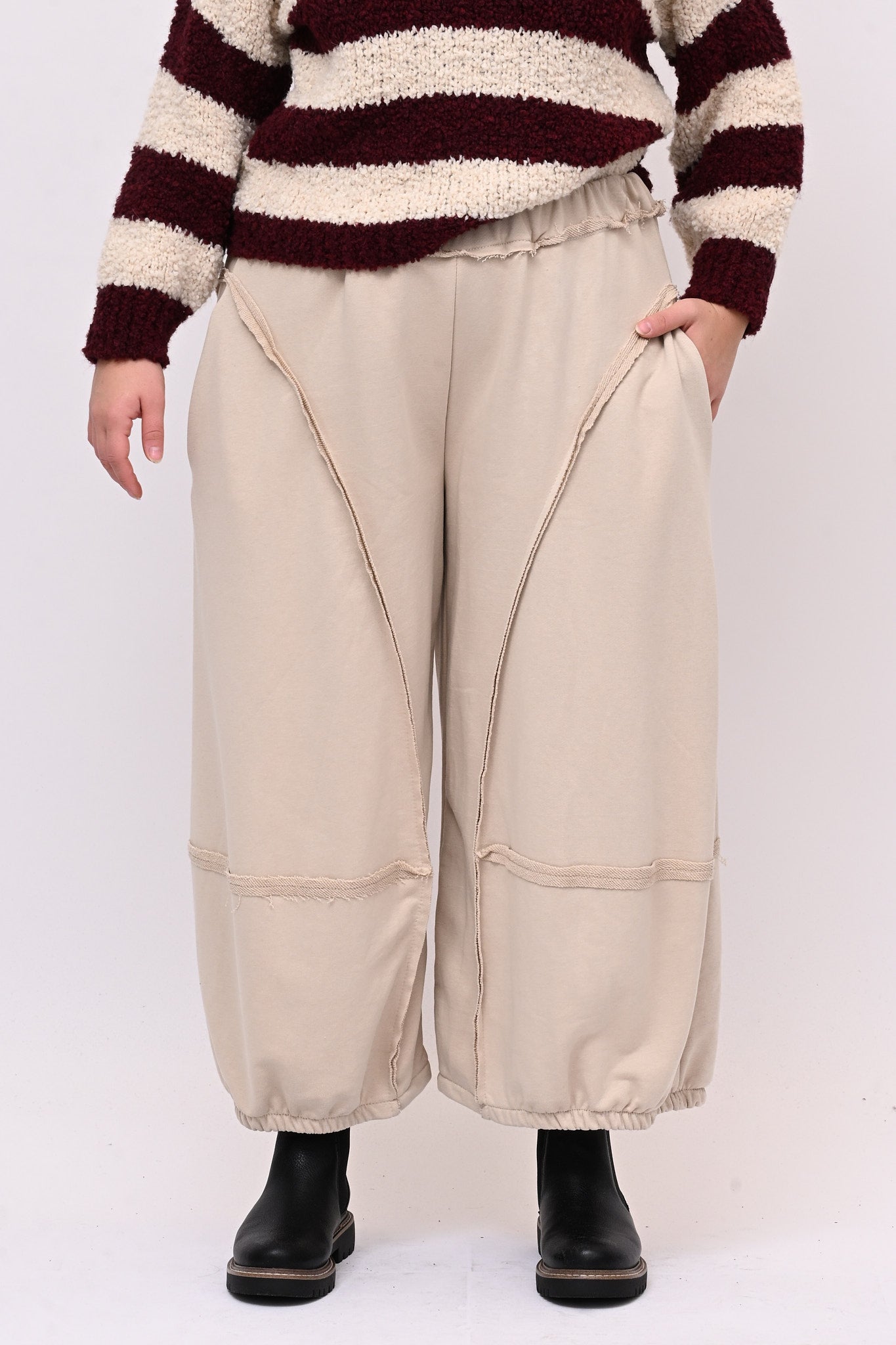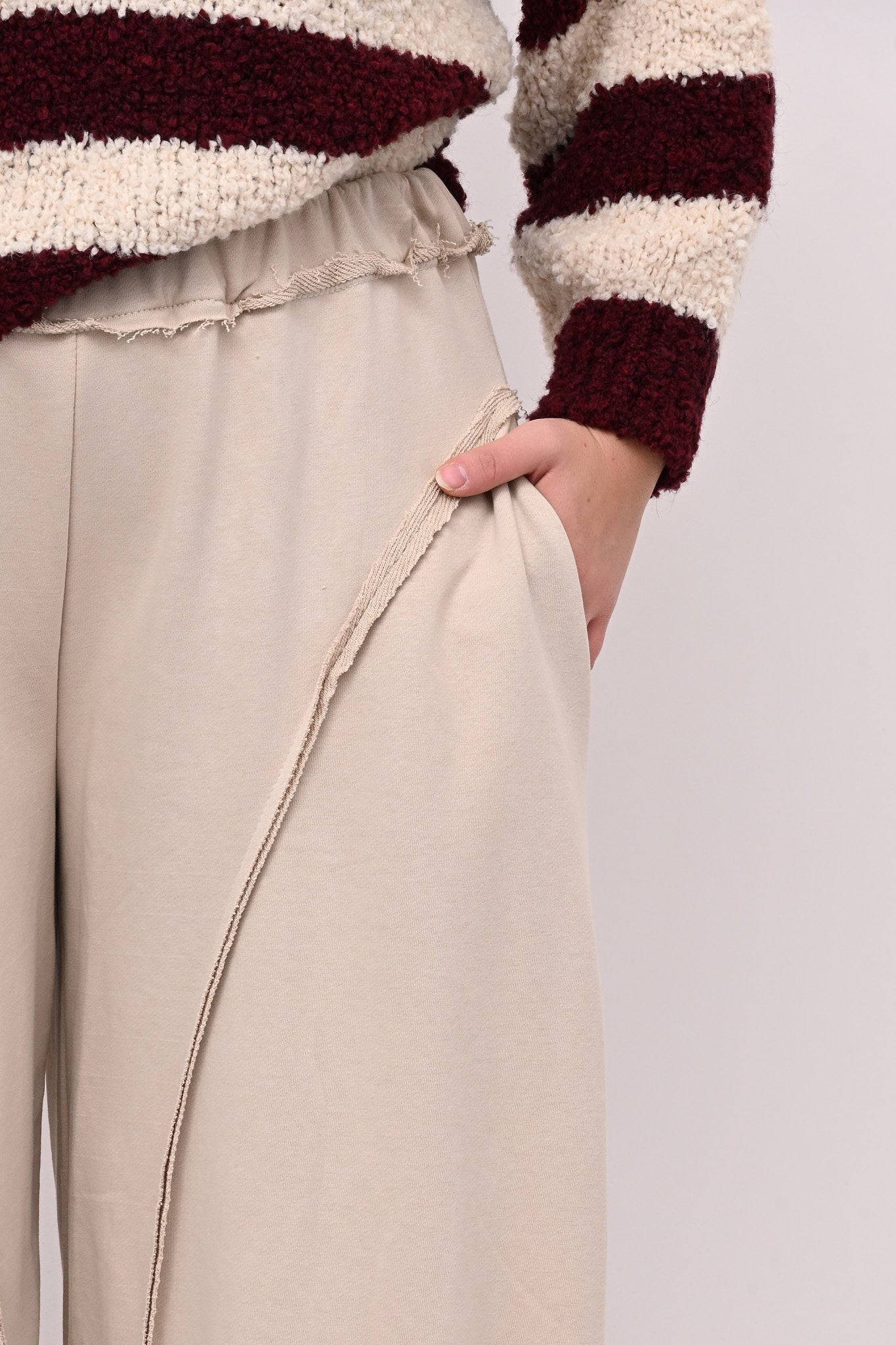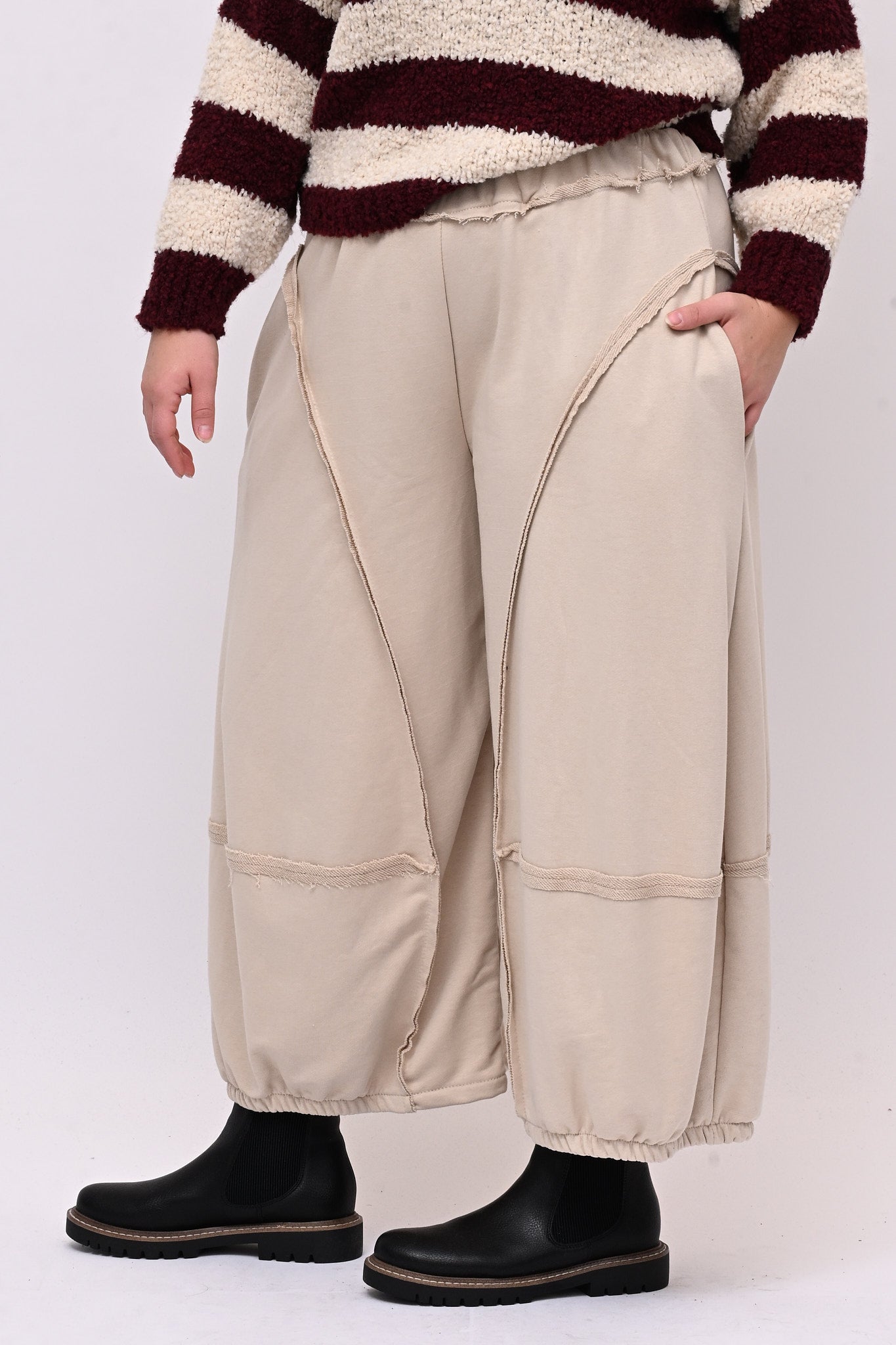Pantalone modello balloon, in felpa, con elastico in vita, tasche laterali e gamba ampia che si stringe alla caviglia. Cuciture decorative aggiungono carattere a questo capo comodo e versatile, perfetto per uno stile casual e contemporaneo.