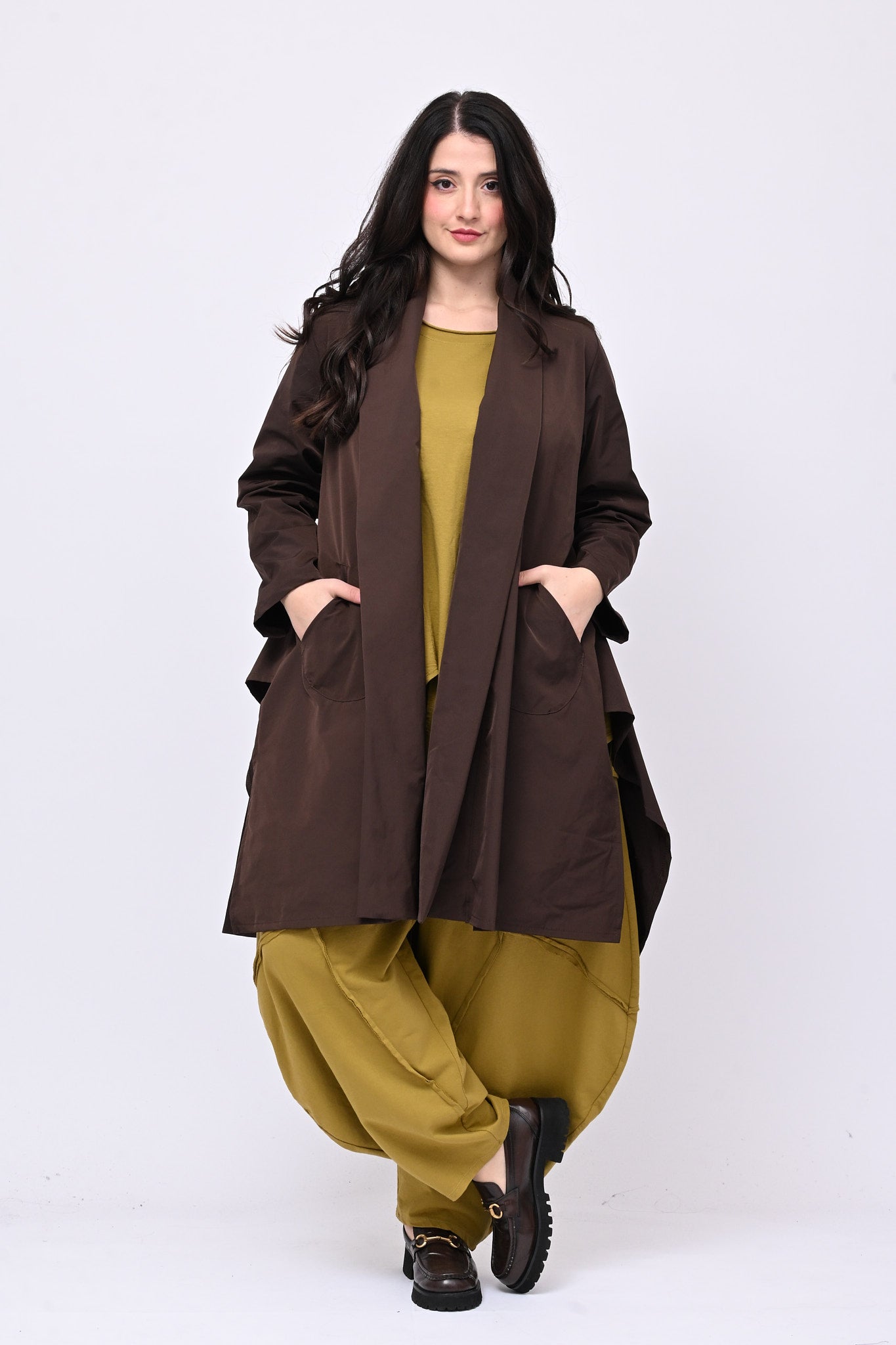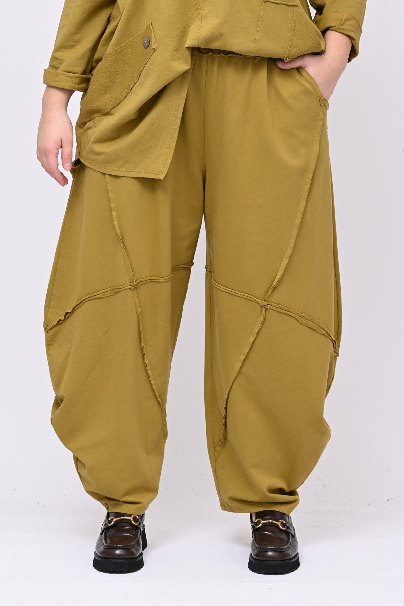 Completo in felpa garzata, composto da: maglia girocollo, tasca e applicazioni frontali e fondo asimmetrico che crea giochi di punte e pantalone modello ballon, con gamba larga ed elastico in vita. Pratico, versatile e moderno, è perfetto per chi ricerca un look contemporaneo e confortevole.