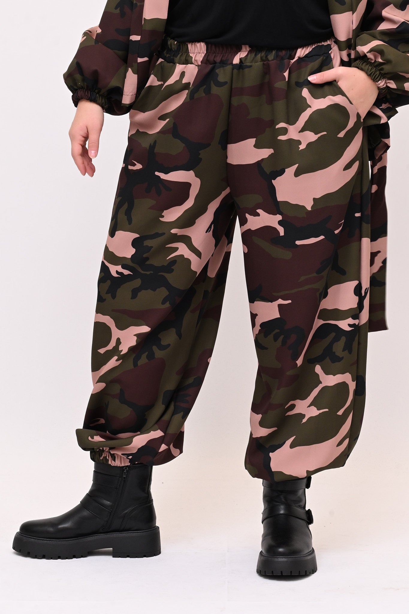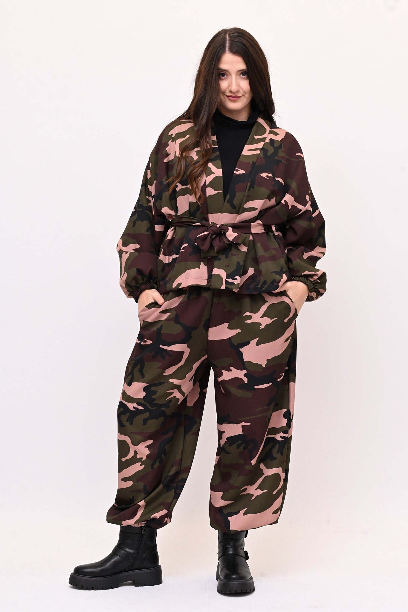 Completo fantasia camouflage composto da: giacca kimono, priva di rever e bottoni, con cinta e maniche a palloncino con elastico al polso. Il pantalone, ha elastico in vita, tasche laterali ed elastico sul fondo. Perfetto indossato insieme, è molto versatile anche spezzato per creare look sporty chic, che combinino comfort e stile.
