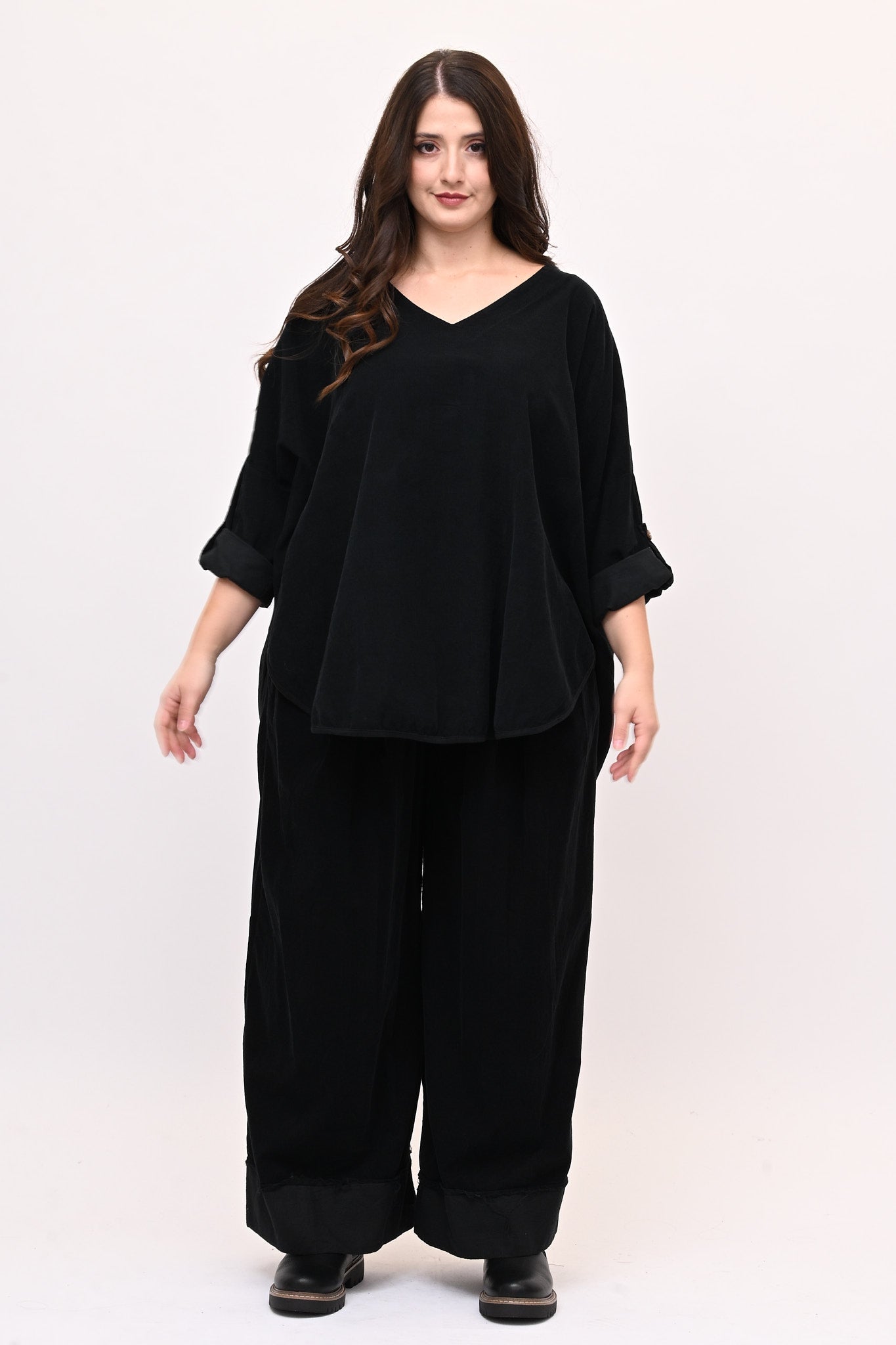 Completo in velluto a costine millerighe, composto da: blusa scollo a V, maniche lunghe regolabili con bottoncino e fondo stondato più lungo dietro. Il pantalone palazzo ha elastico in vita, pinces, tasche e gamba ampia. Comfort e libertà di movimento in un abbinamento versatile, perfetto per chi ricerca stile contemporaneo dal design sporty chic.