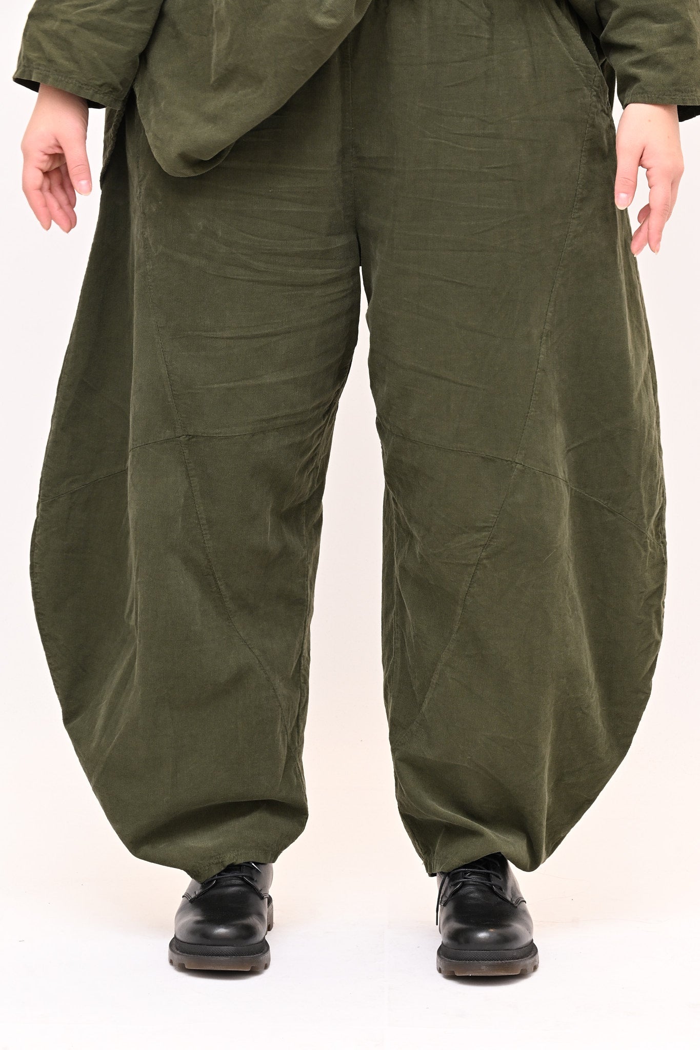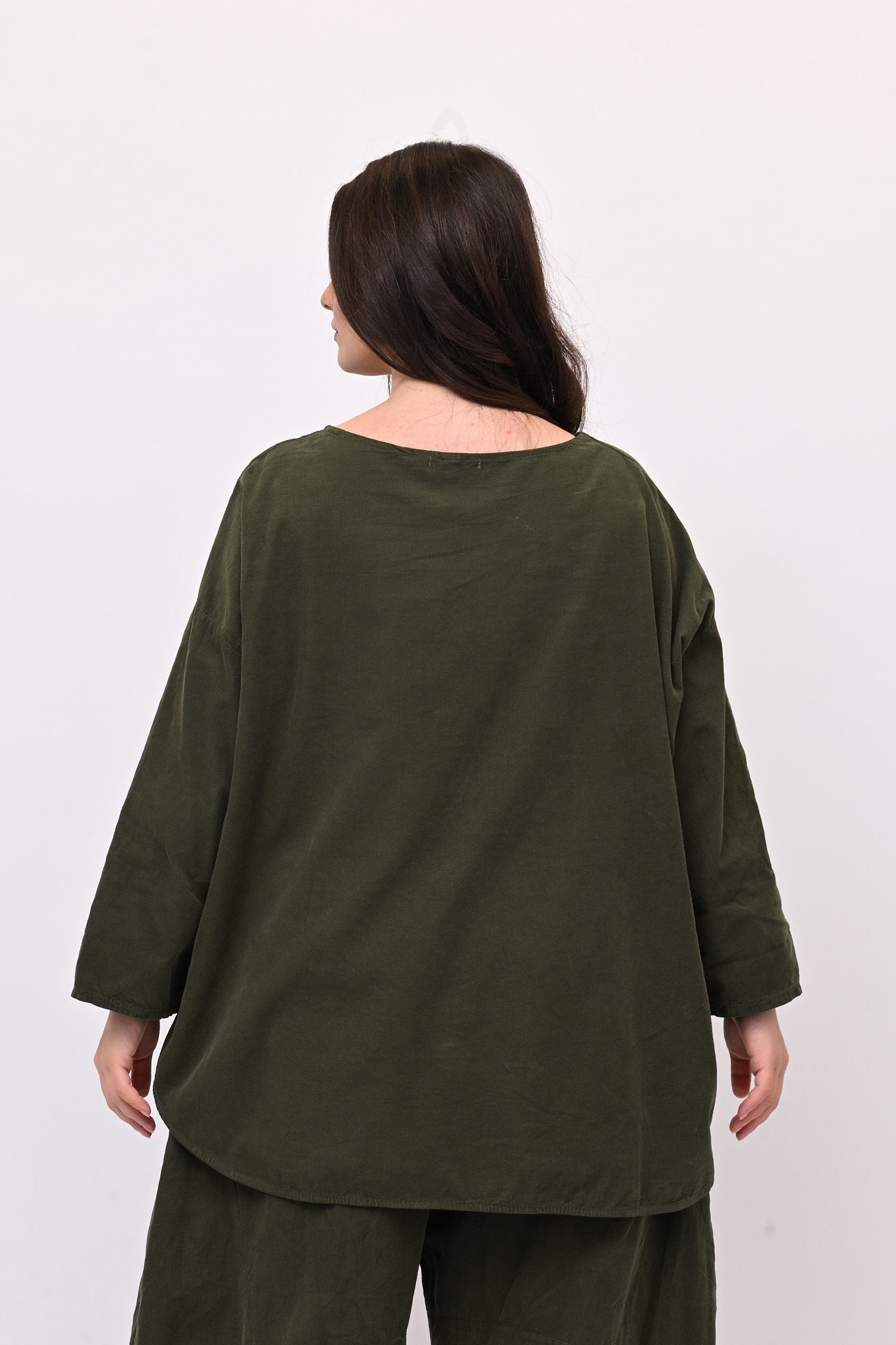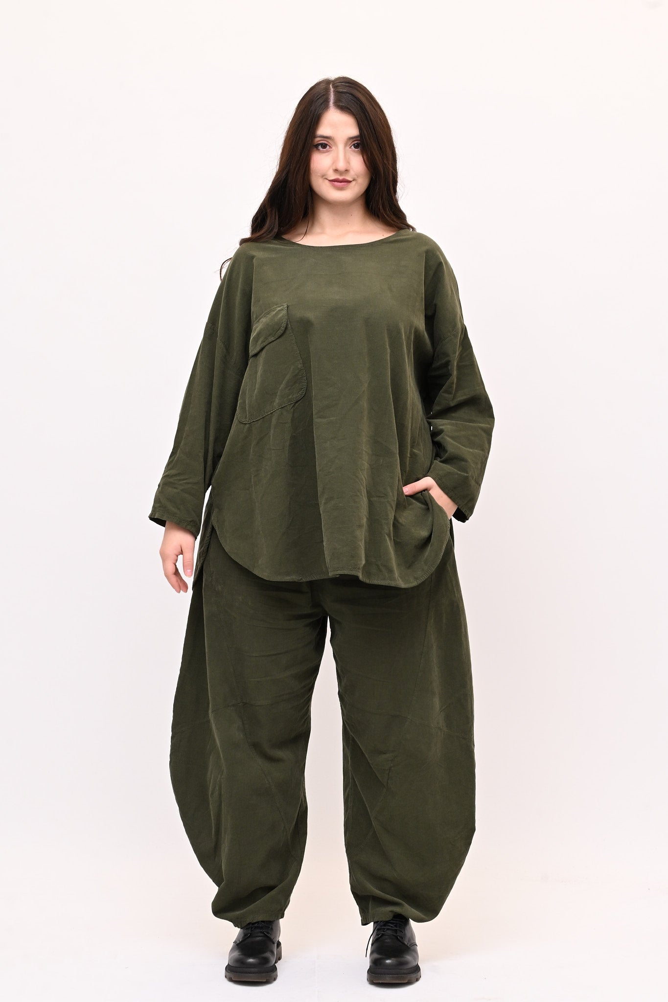 Completo in velluto a costine millerighe, composto da: blusa girocollo, maniche lunghe e fondo stondato. Il pantalone è modello baloon, con elastico in vita, tasche e gamba ampia. Comfort e libertà di movimento in un abbinamento pratico e moderno, perfetto per chi ricerca stile e femminilità dal design sporty chic.