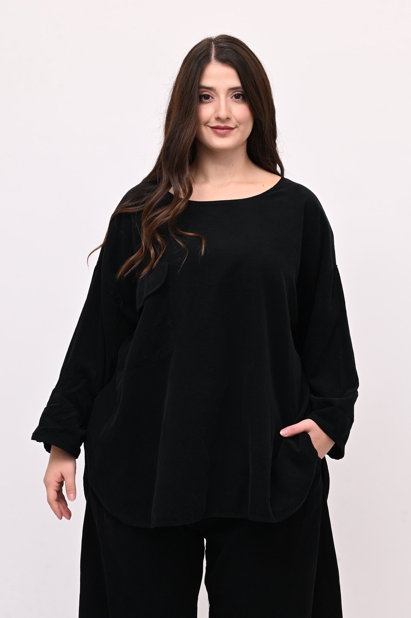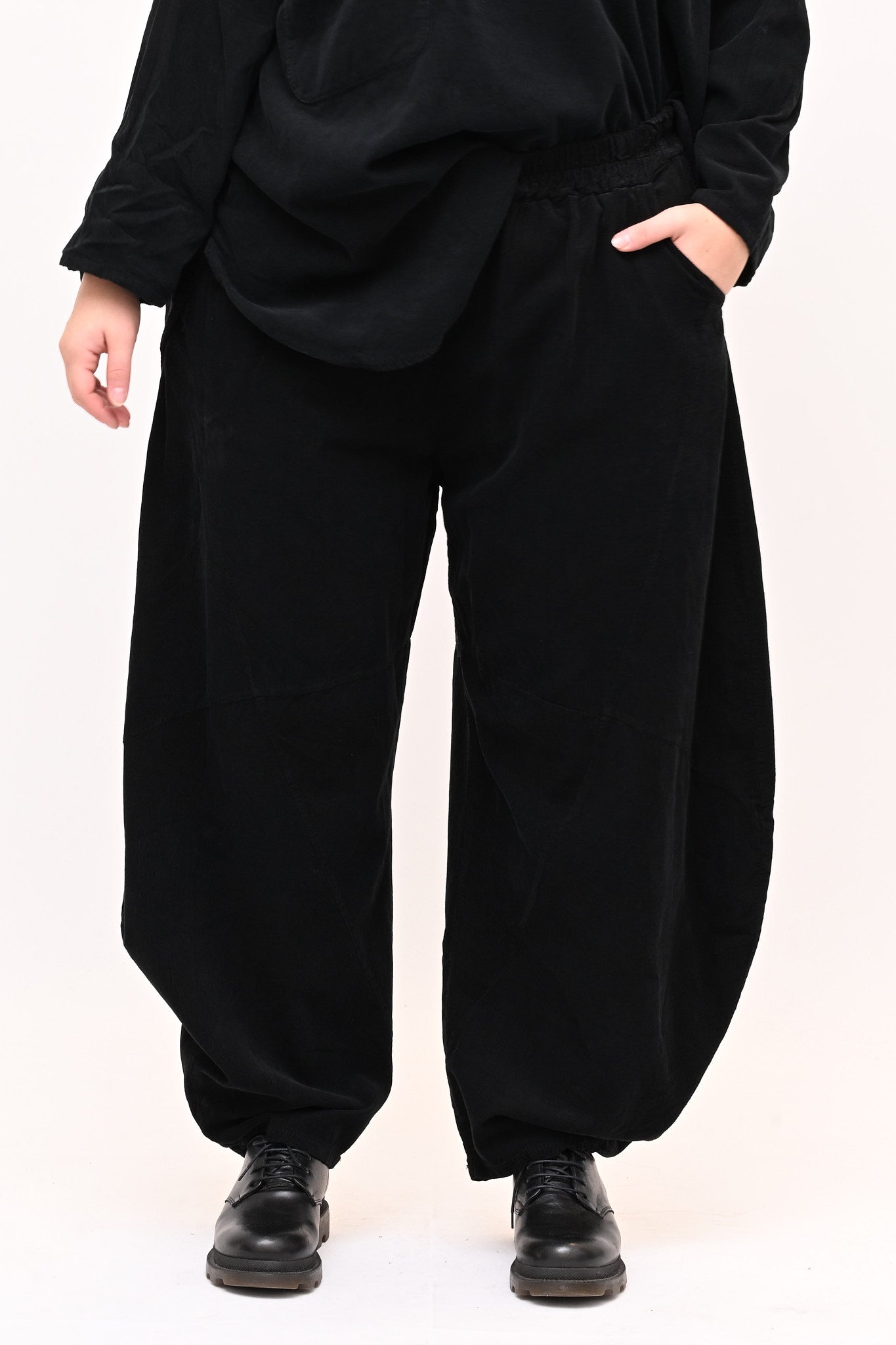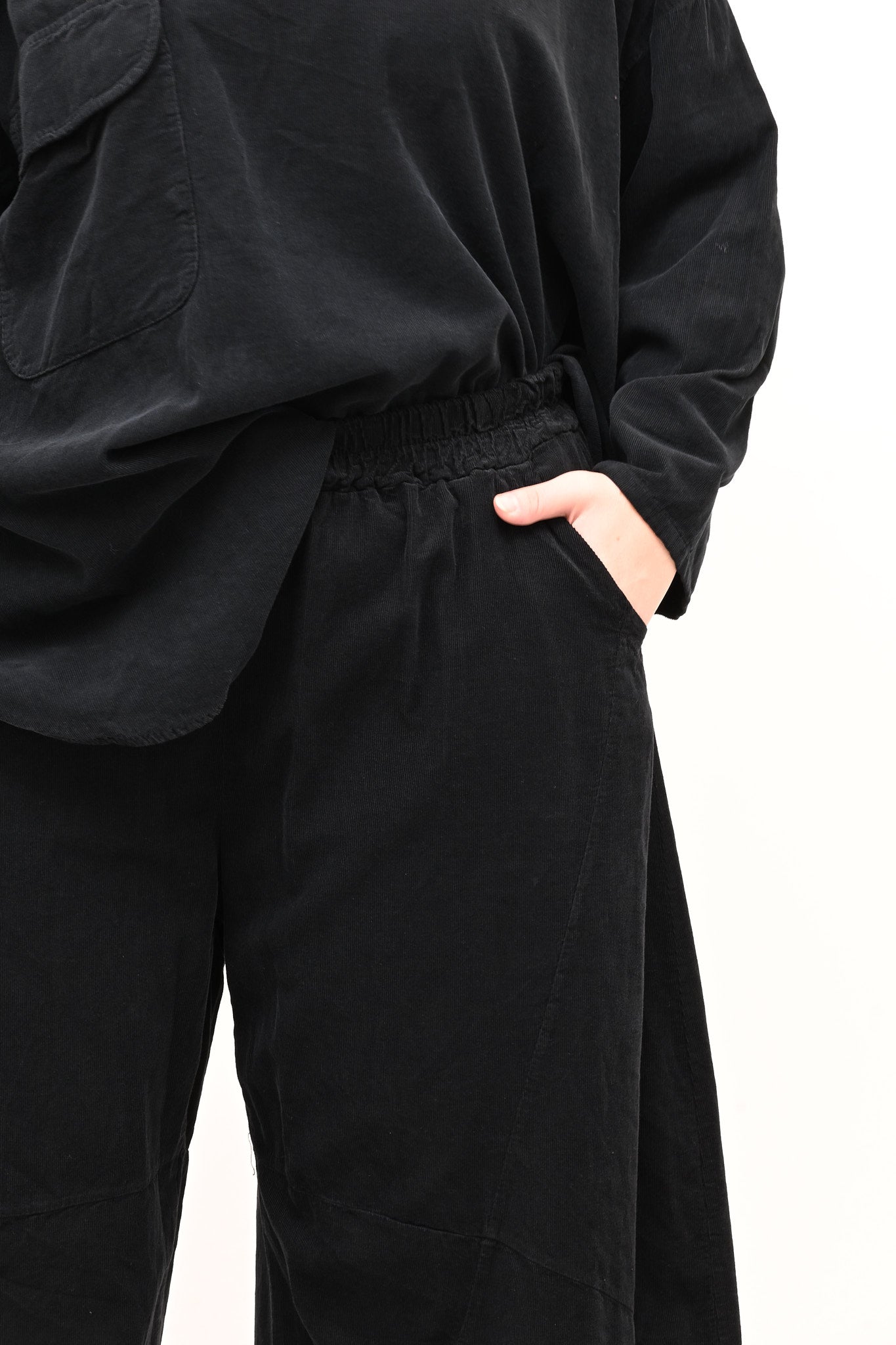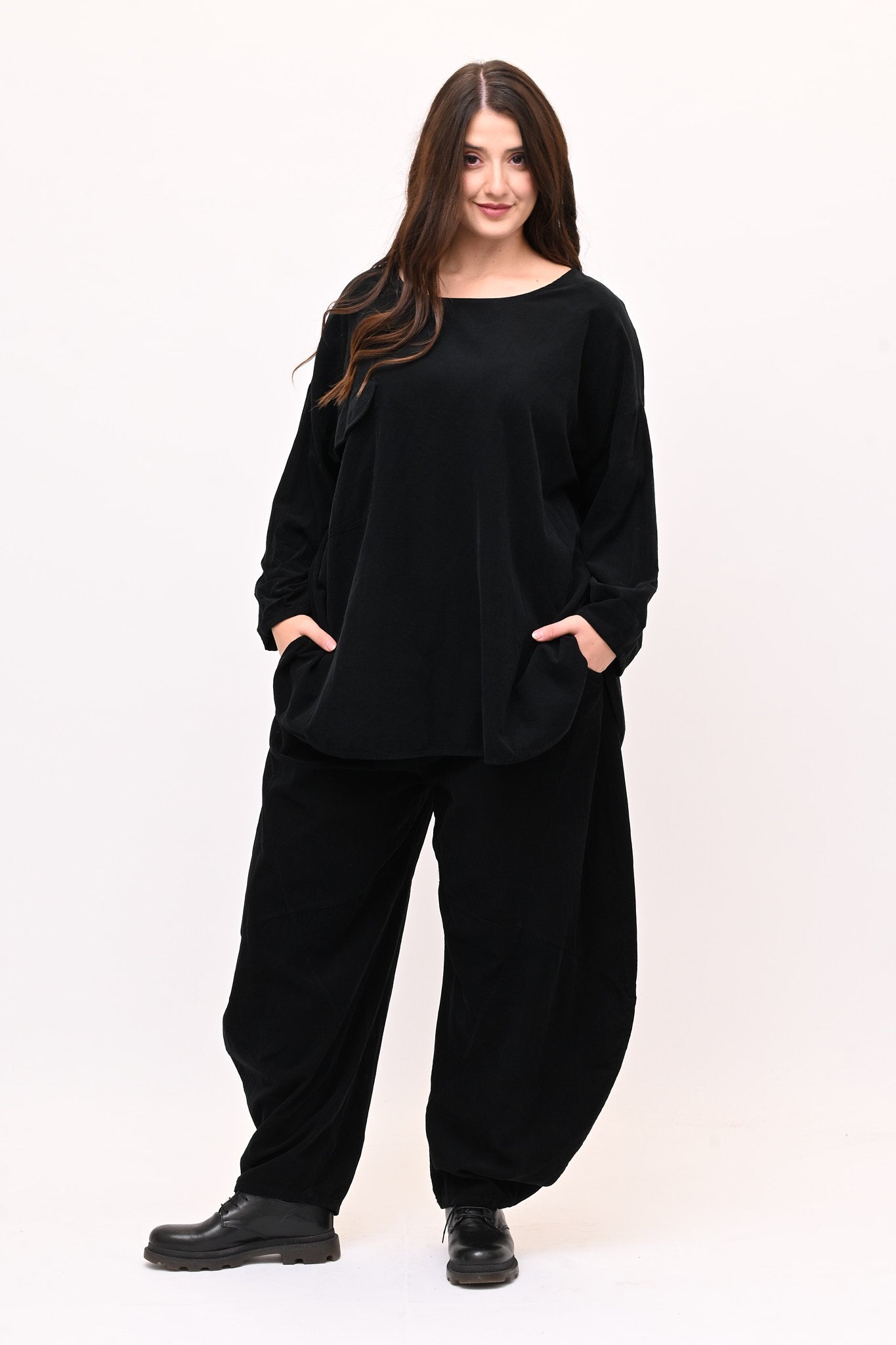 Completo in velluto a costine millerighe, composto da: blusa girocollo, maniche lunghe e fondo stondato. Il pantalone è modello baloon, con elastico in vita, tasche e gamba ampia. Comfort e libertà di movimento in un abbinamento pratico e moderno, perfetto per chi ricerca stile e femminilità dal design sporty chic.