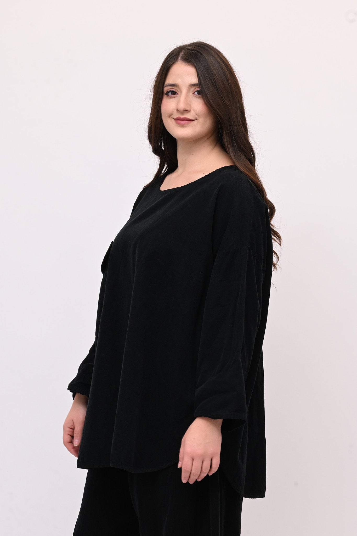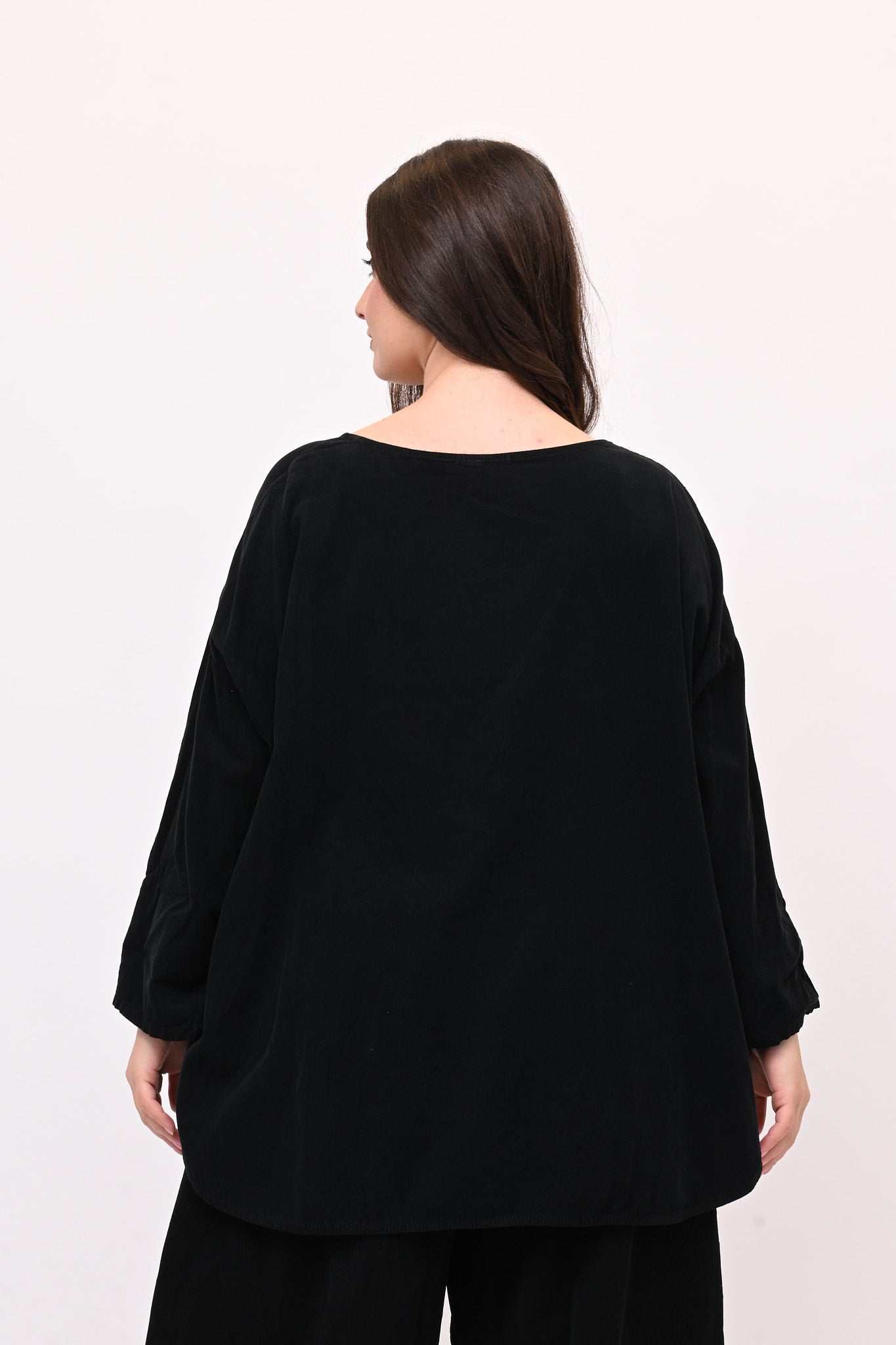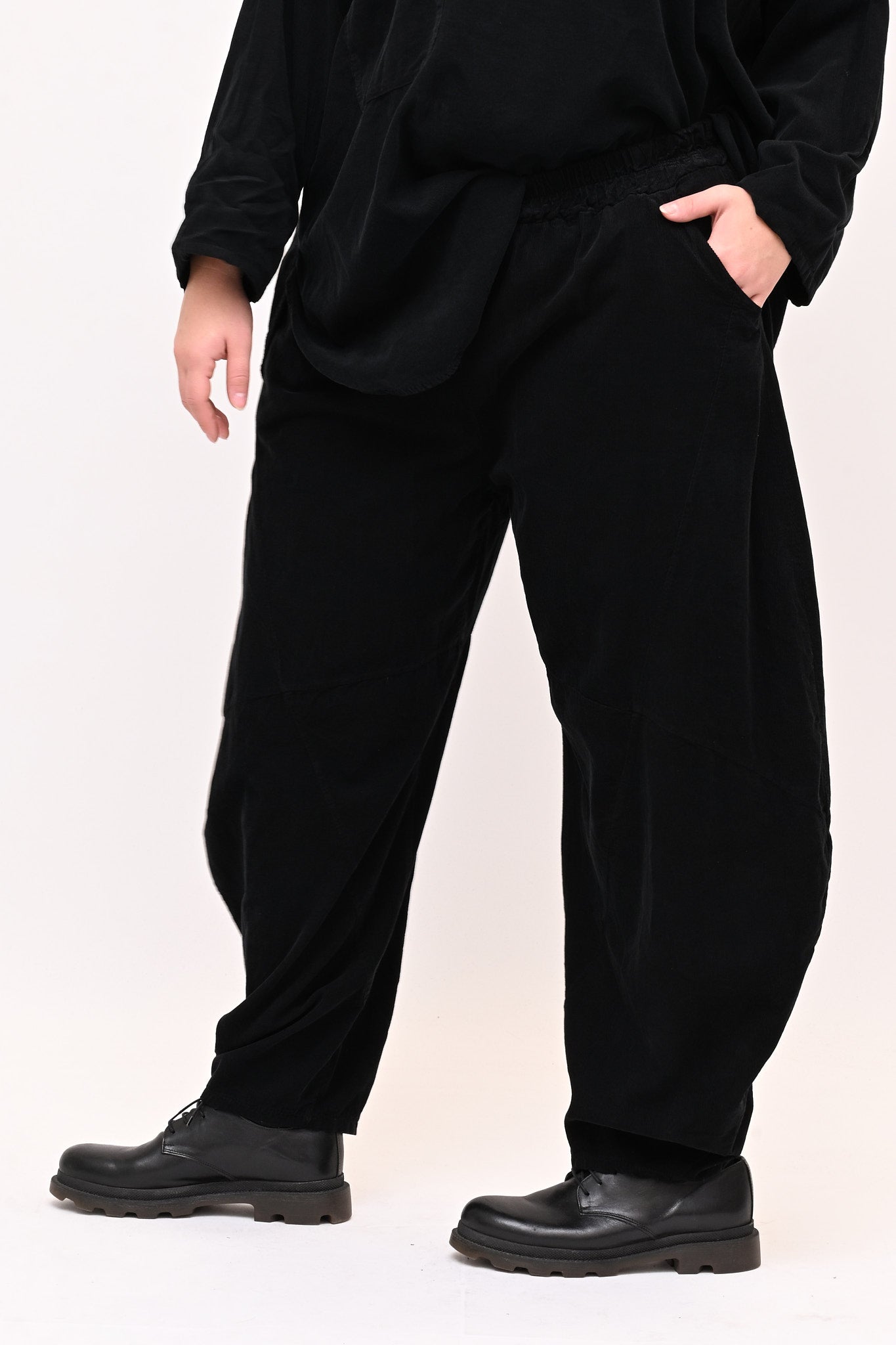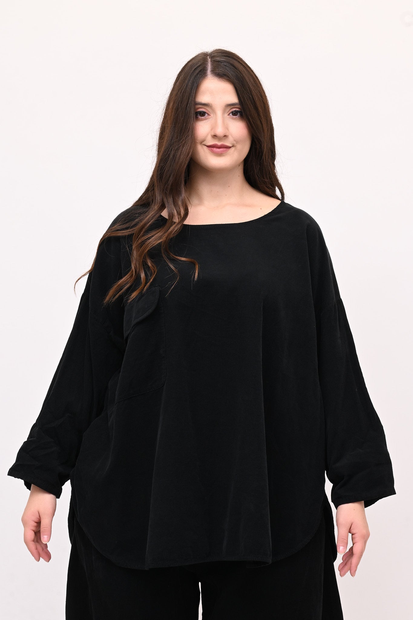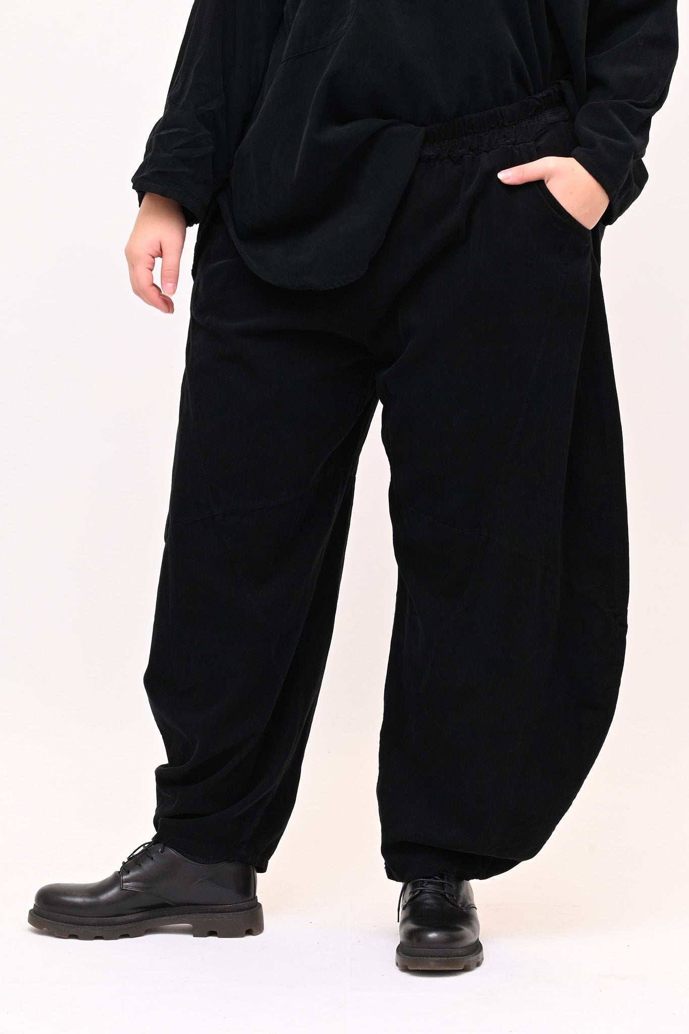 Completo in velluto a costine millerighe, composto da: blusa girocollo, maniche lunghe e fondo stondato. Il pantalone è modello baloon, con elastico in vita, tasche e gamba ampia. Comfort e libertà di movimento in un abbinamento pratico e moderno, perfetto per chi ricerca stile e femminilità dal design sporty chic.