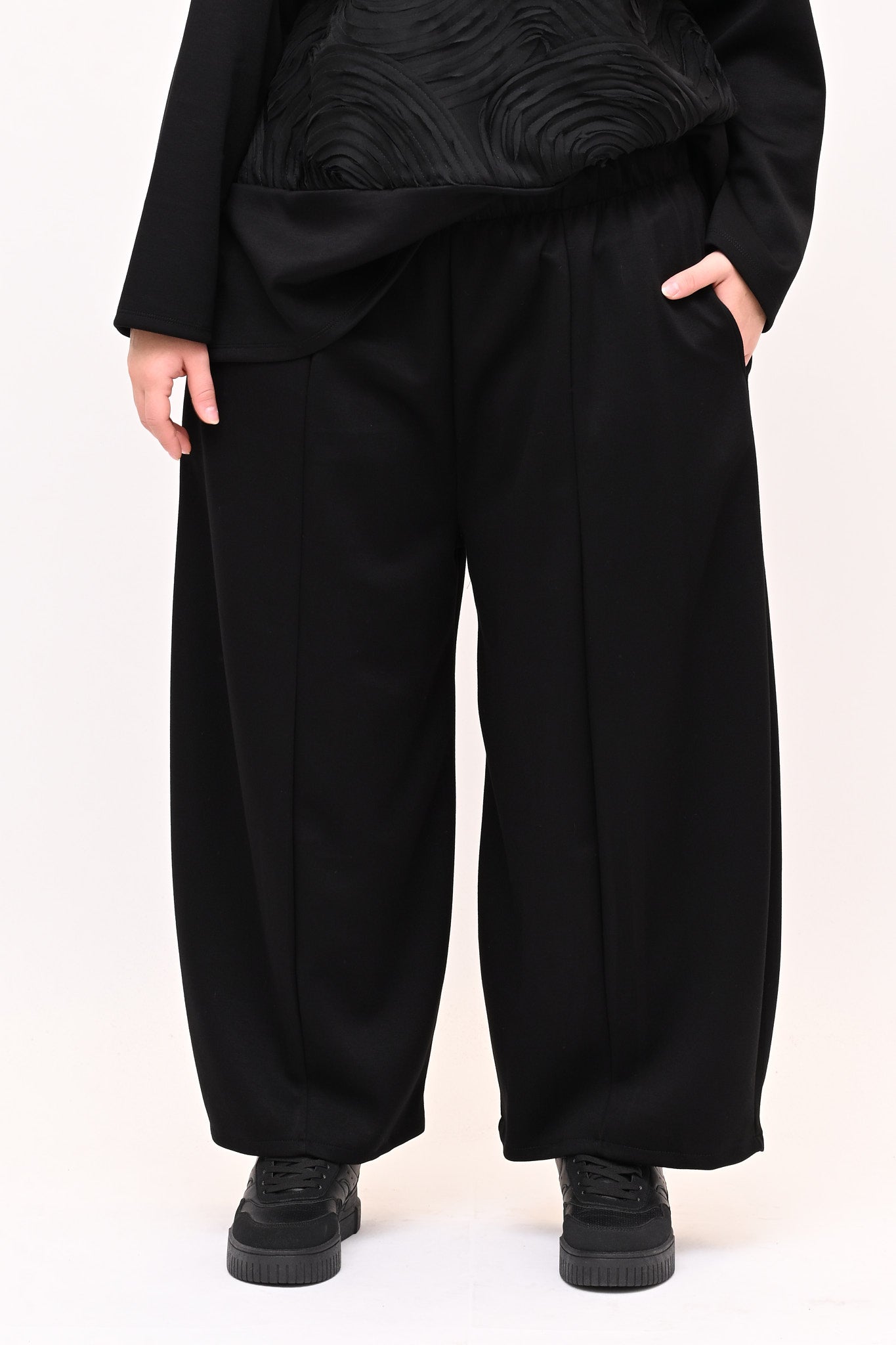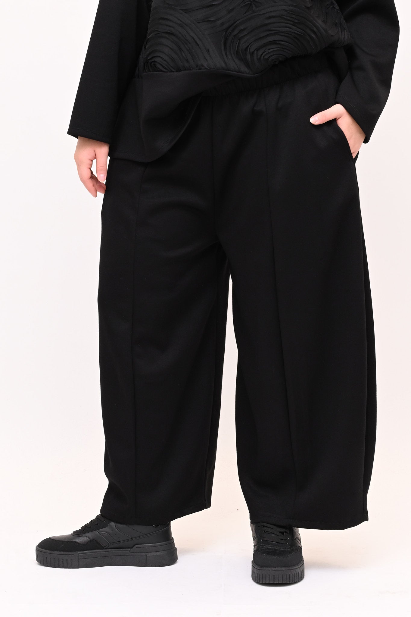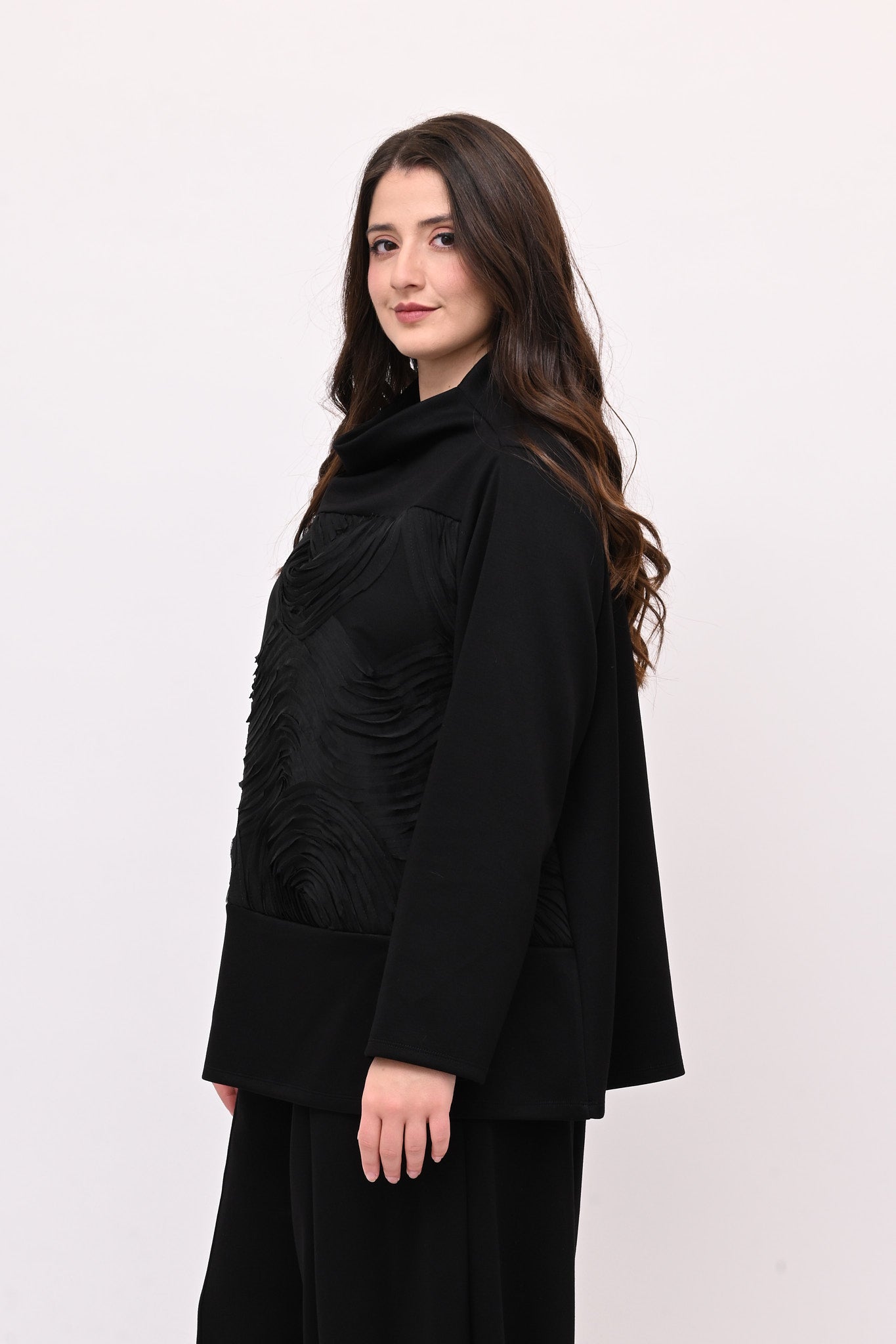 Completo in neoprene composto da: felpa con collo a vulcano, vestibilità ad A e pantalone modello carota con elastico in vita e tasche laterali. Il ricamo in taftà e tulle sul davanti dona un raffinato tocco sporty chic al coordinato, rendendolo ideale per chi cerca un outfit elegante ma pratico.