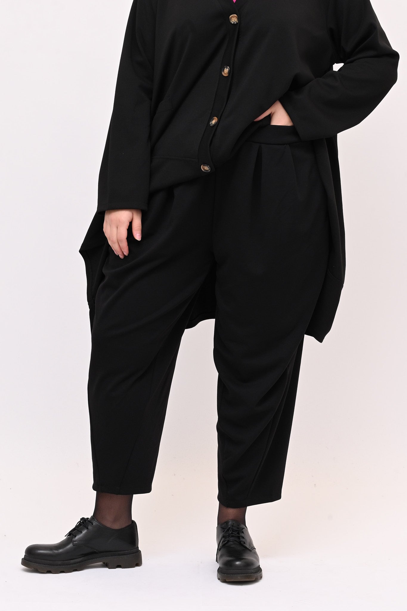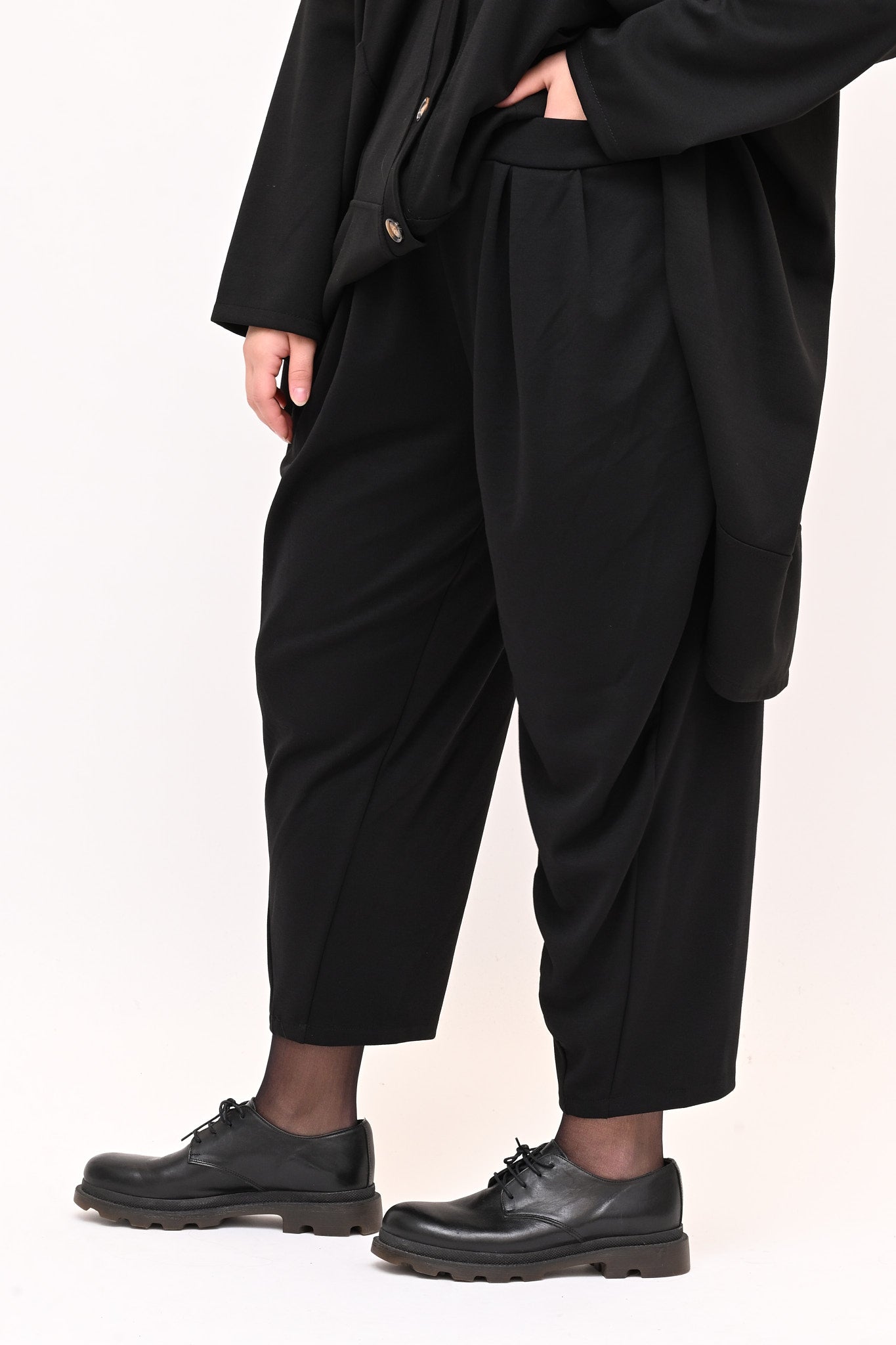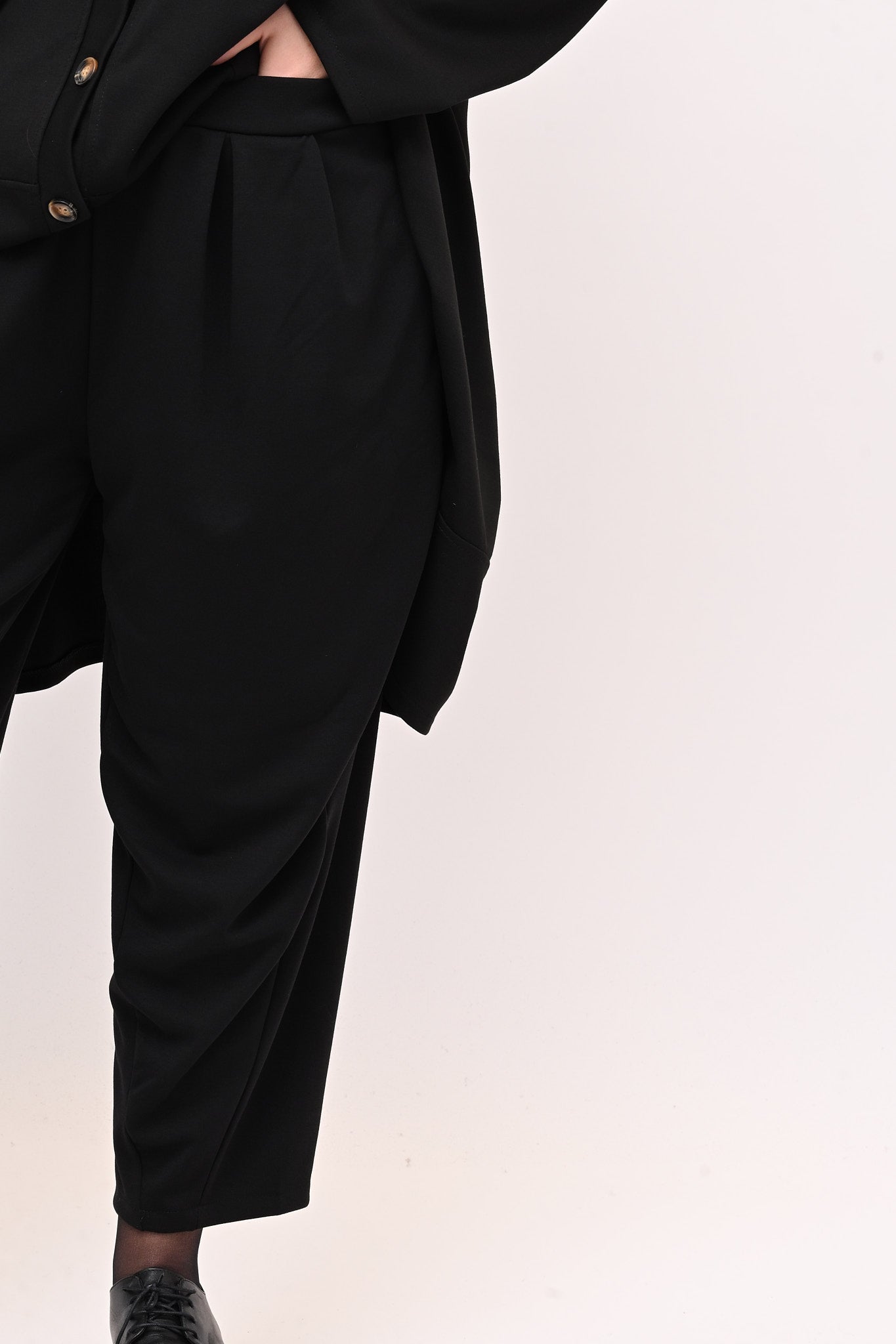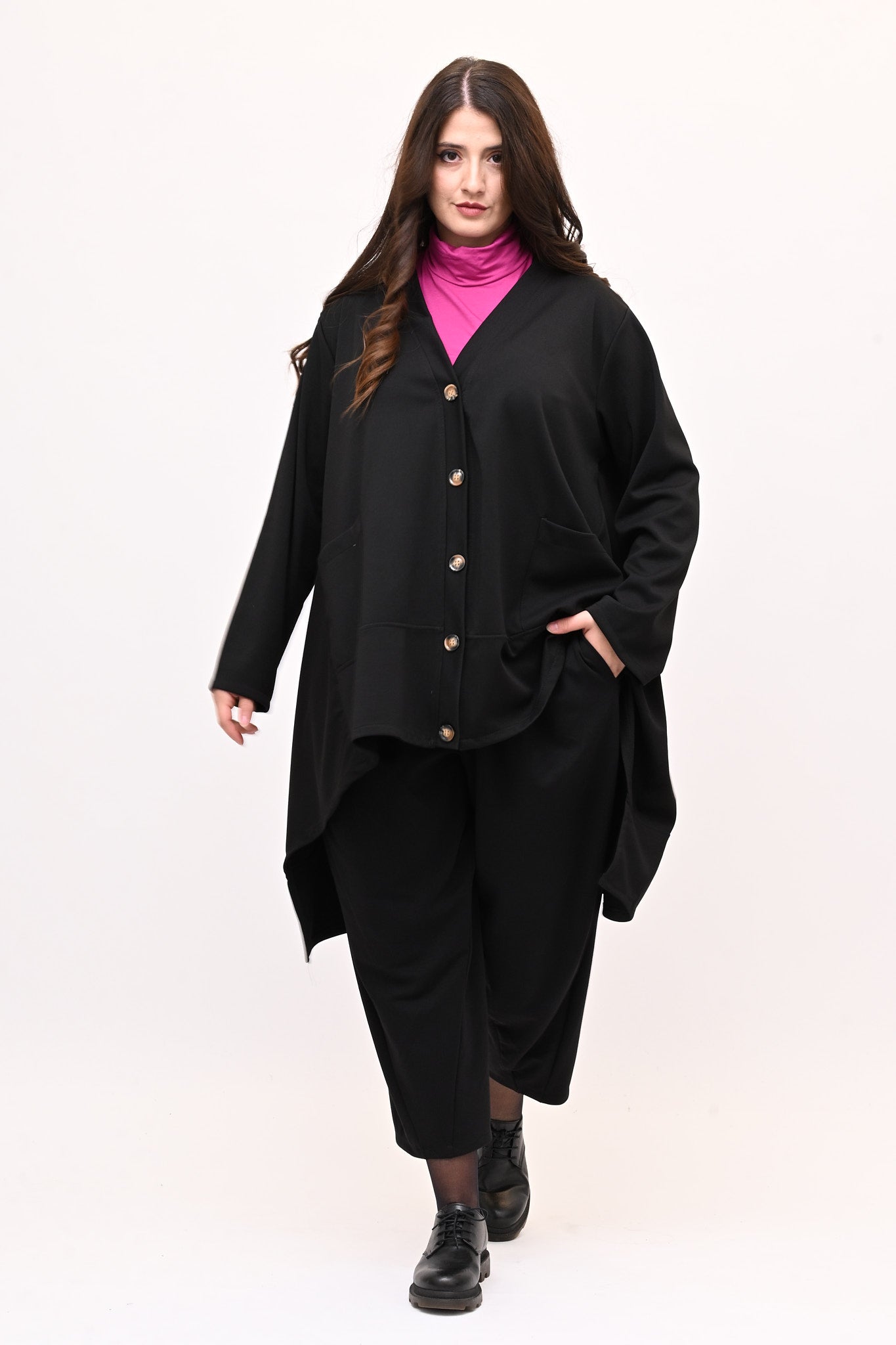 Completo composto da: giacca modello frack senza rever, con bordo alto, taglio svasato, più lunga dietro e pantalone modello crop con elastico in vita, pinces e tasche. Ideale per outfit pratici e sofisticati e look moderni che garantiscono comfort e una vestibilità perfetta.