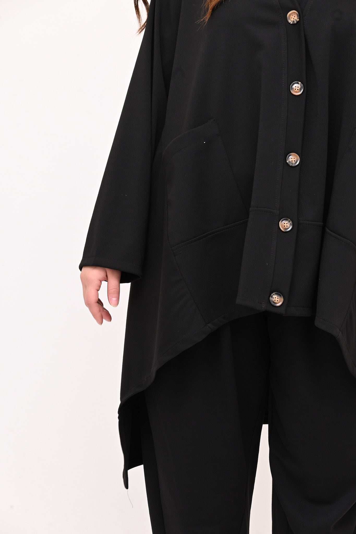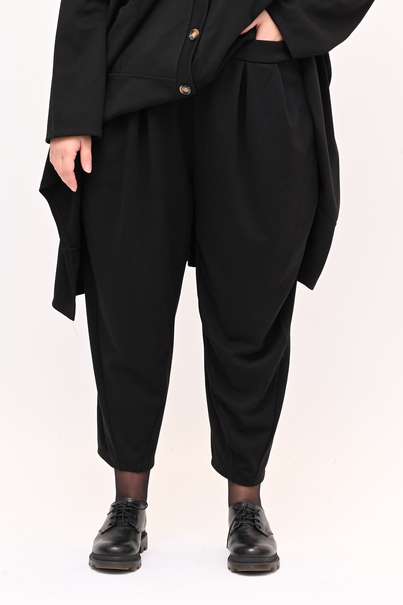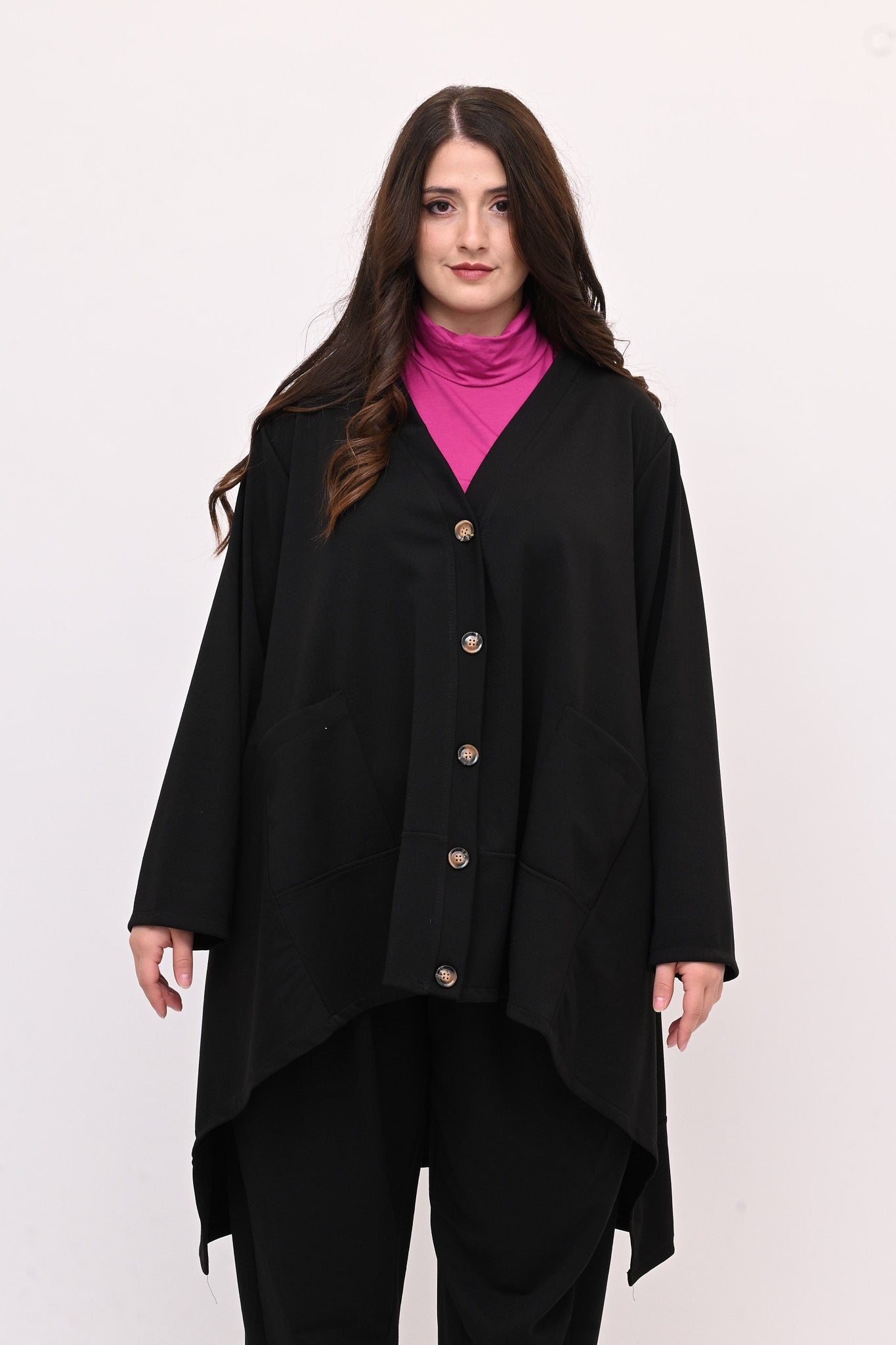 Completo composto da: giacca modello frack senza rever, con bordo alto, taglio svasato, più lunga dietro e pantalone modello crop con elastico in vita, pinces e tasche. Ideale per outfit pratici e sofisticati e look moderni che garantiscono comfort e una vestibilità perfetta.