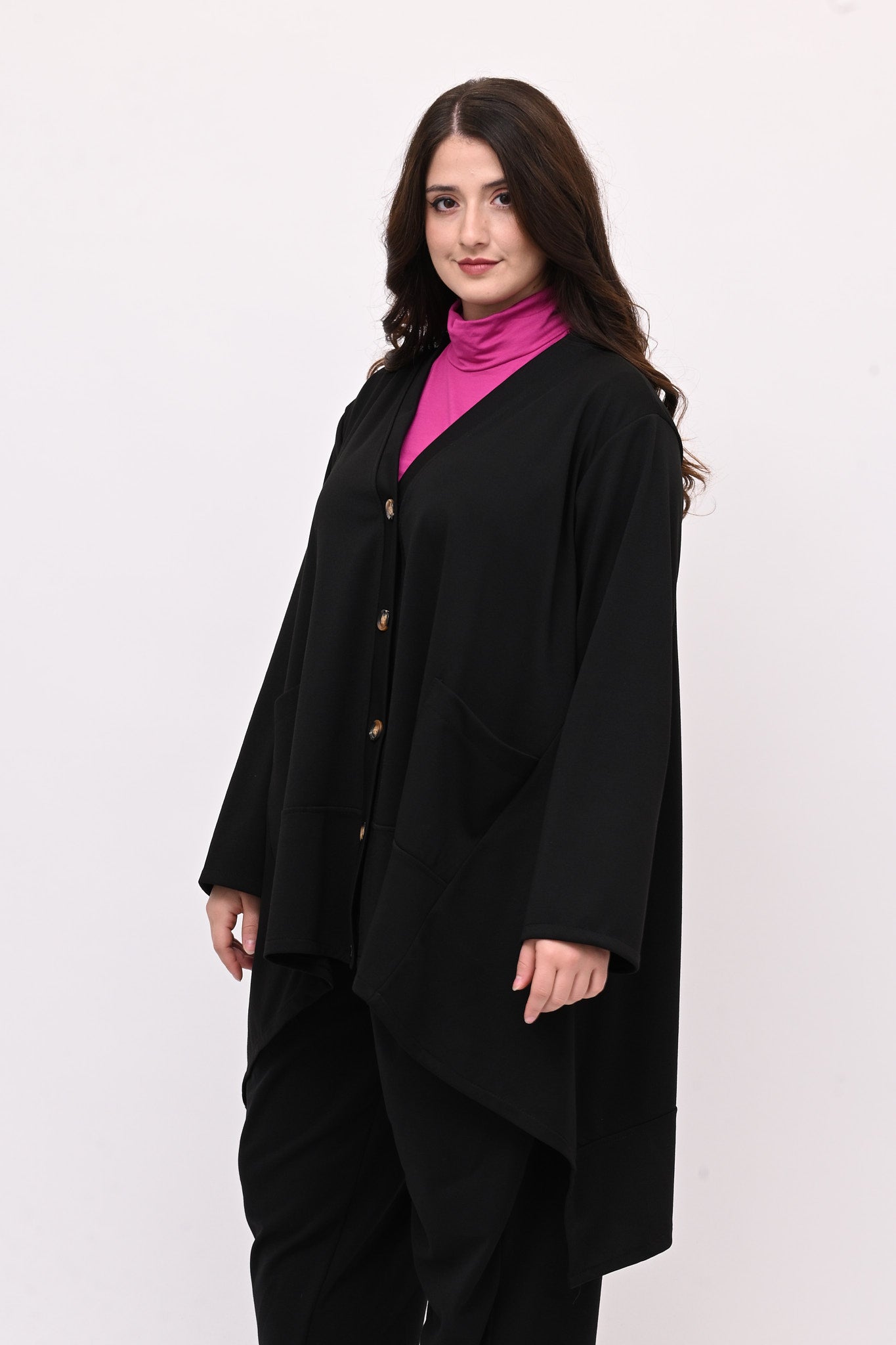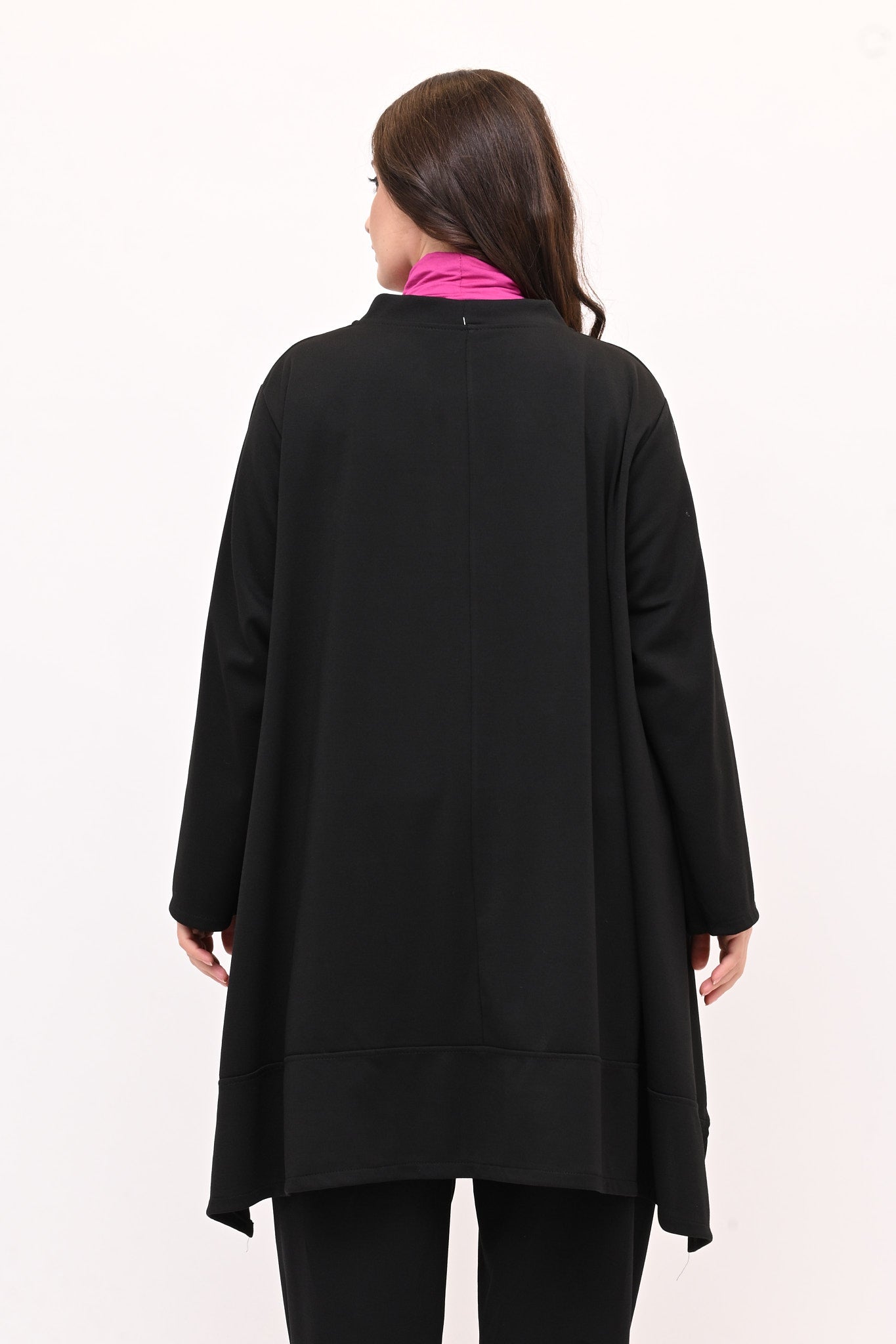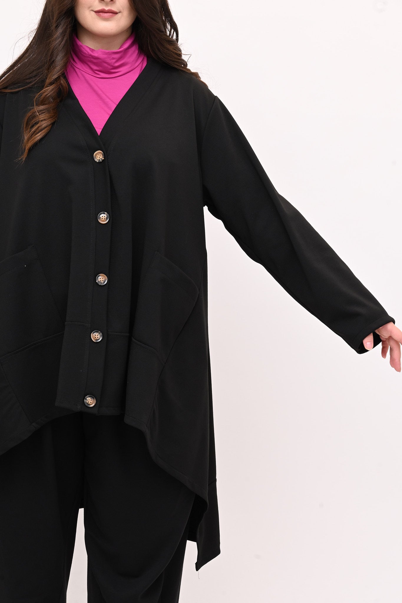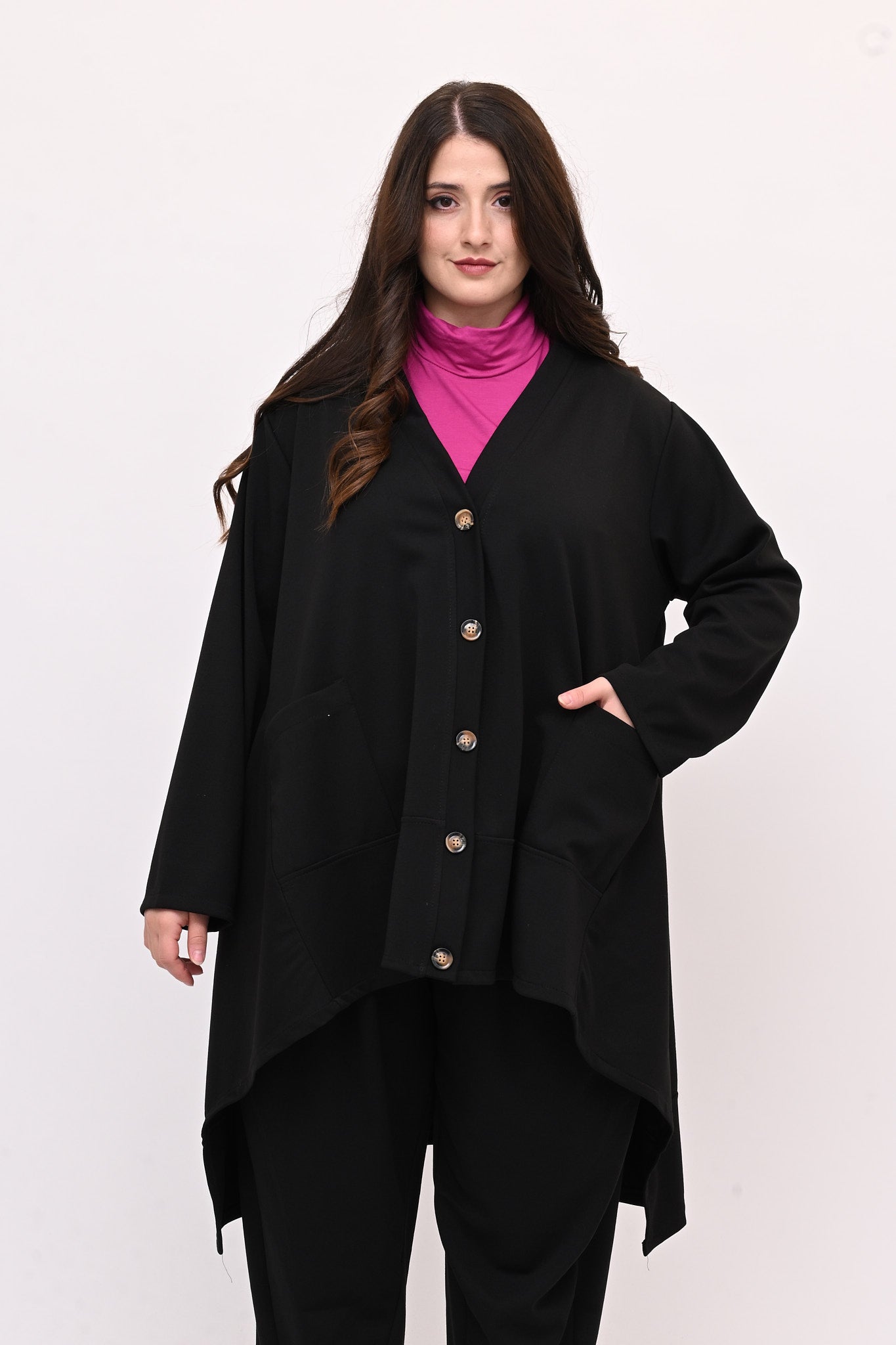 Completo composto da: giacca modello frack senza rever, con bordo alto, taglio svasato, più lunga dietro e pantalone modello crop con elastico in vita, pinces e tasche. Ideale per outfit pratici e sofisticati e look moderni che garantiscono comfort e una vestibilità perfetta.