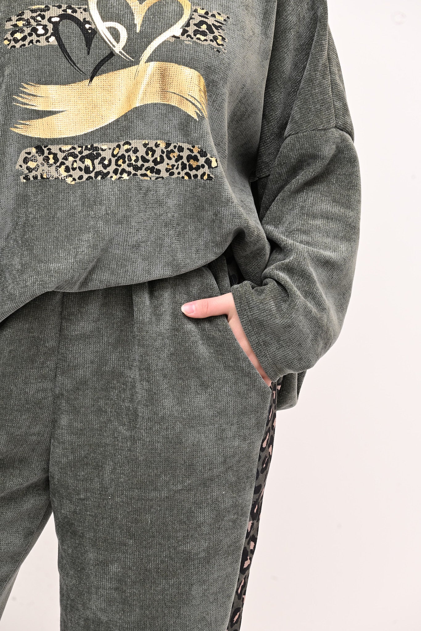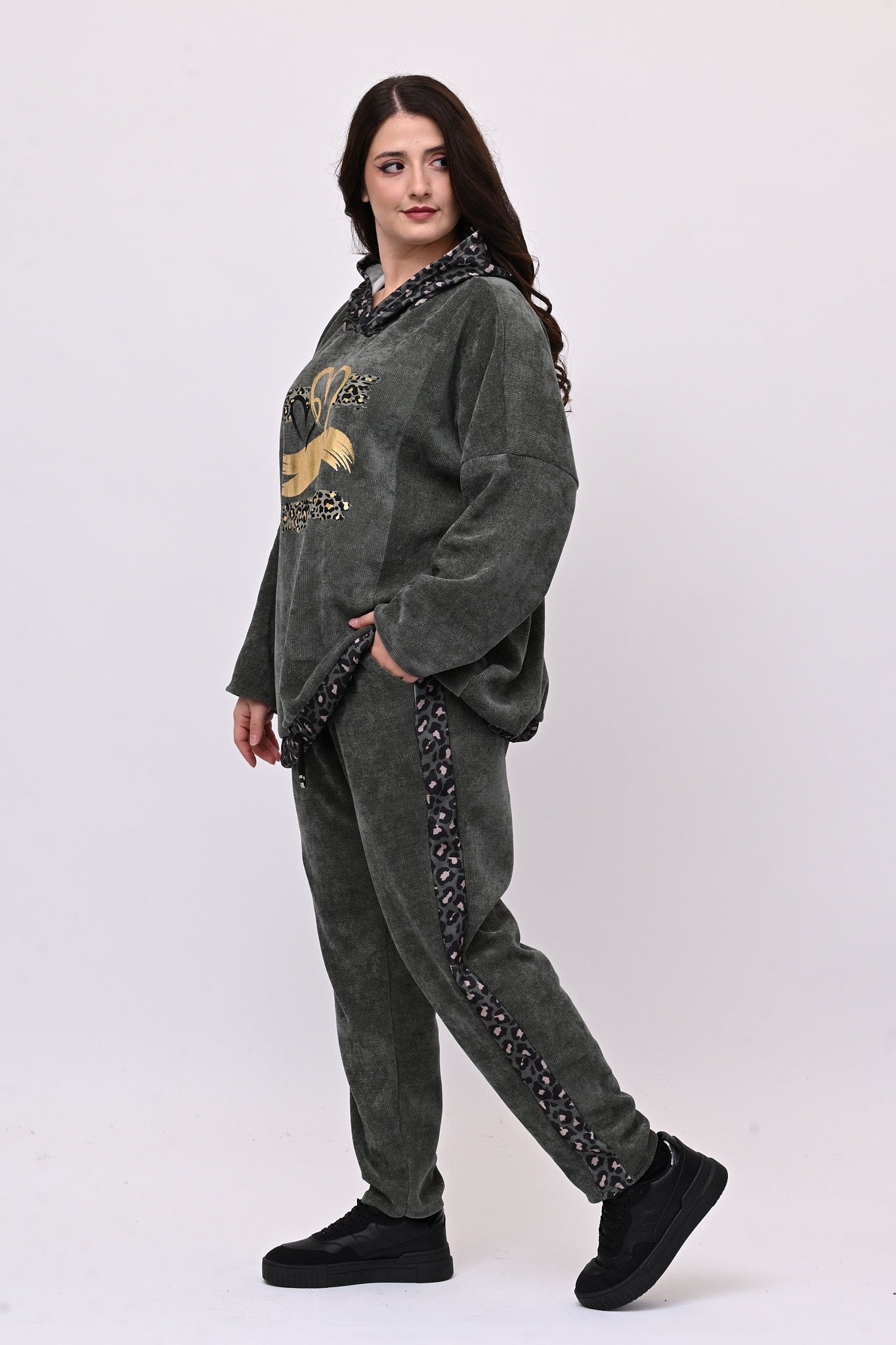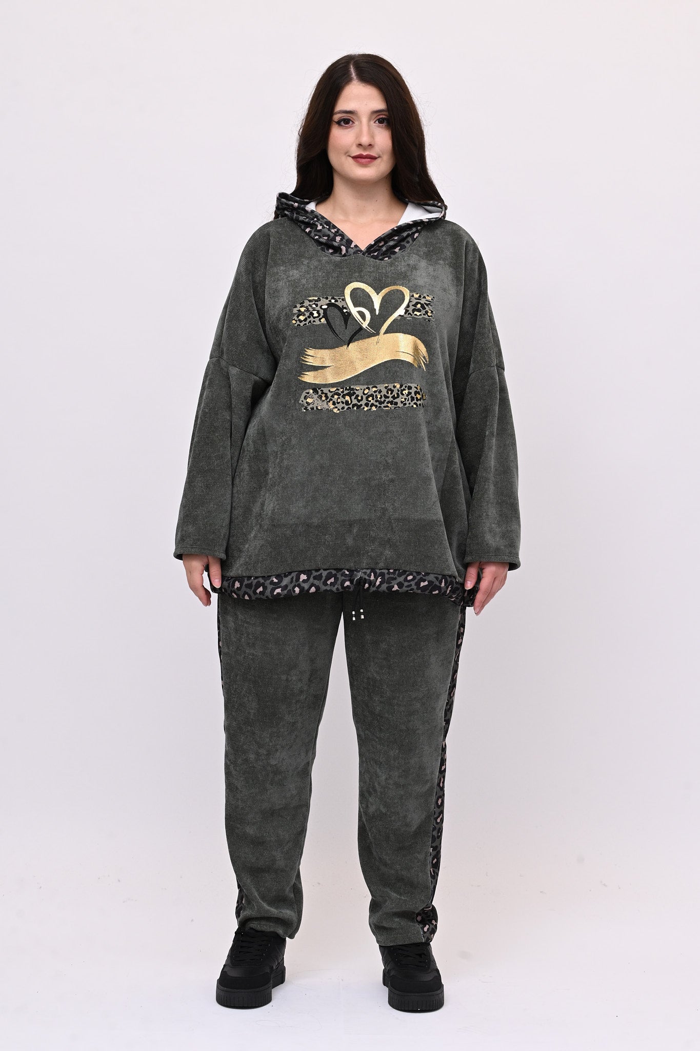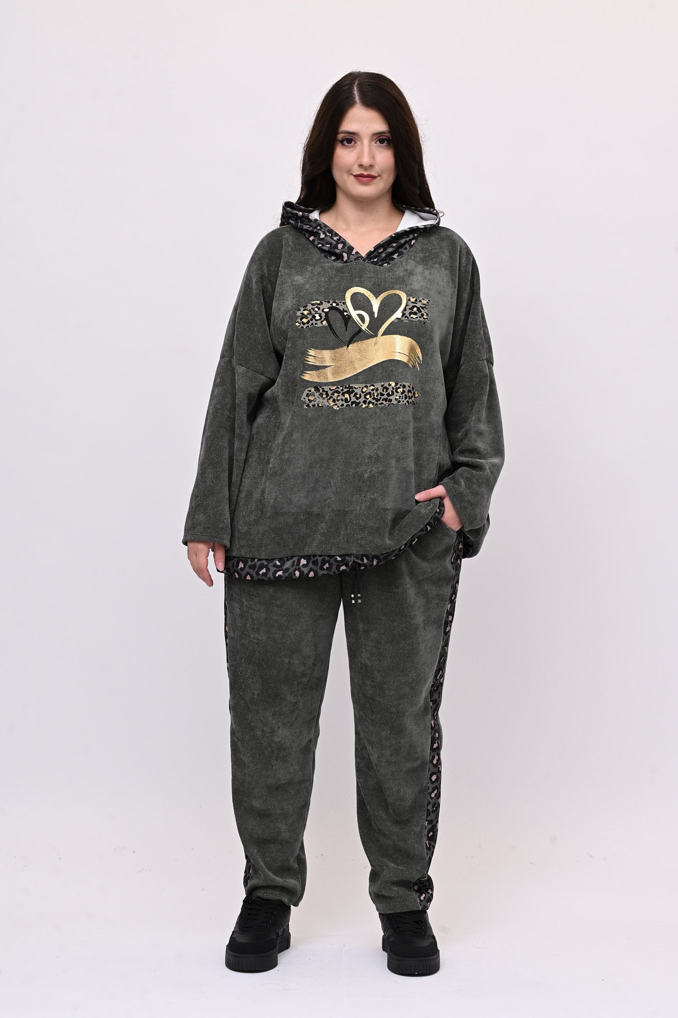 Tuta in ciniglia composta da: felpa con cappuccio e stampa animalier e cuori, con bordo regolabile fantasia e pantaloni con elastico in vita e banda animalier laterale. Perfetta per chi cerca un outfit versatile e sporty chic, senza rinunciare alla comodità.