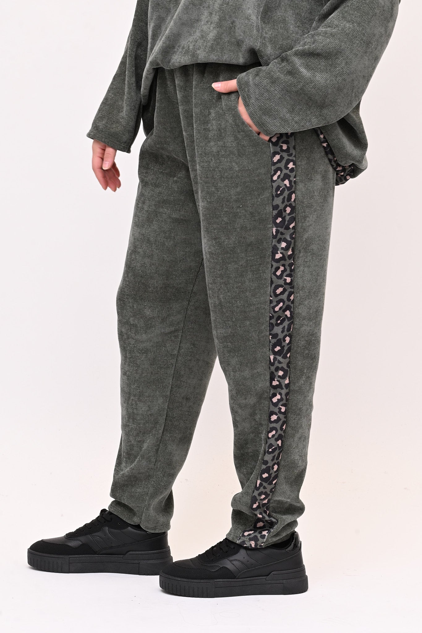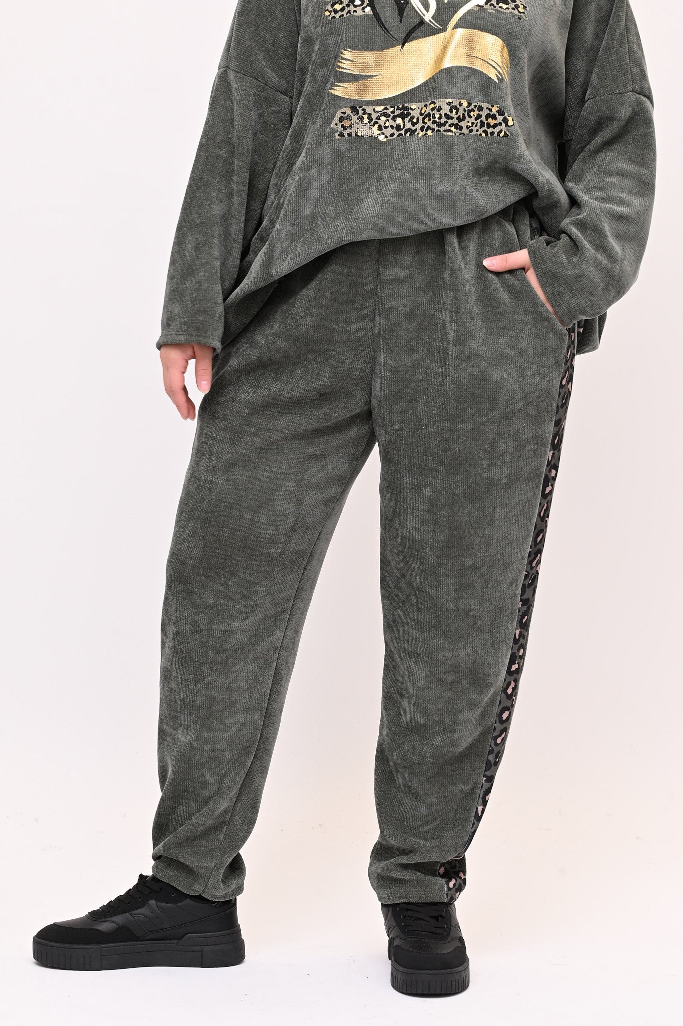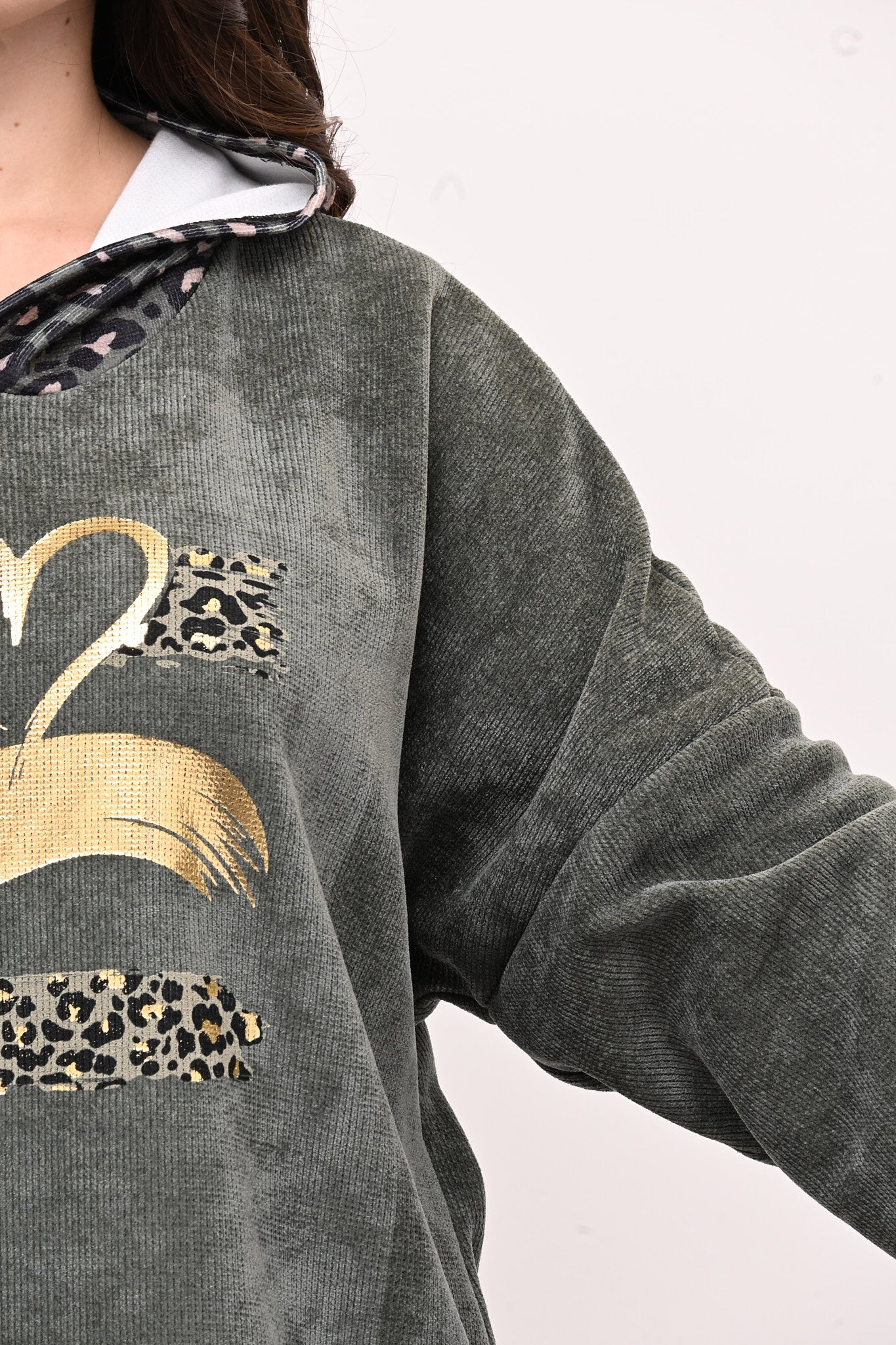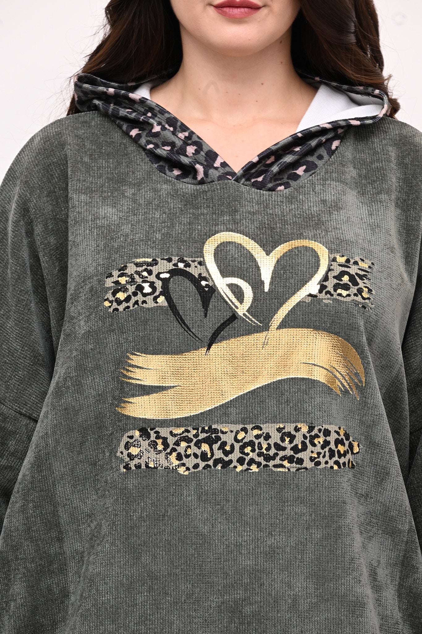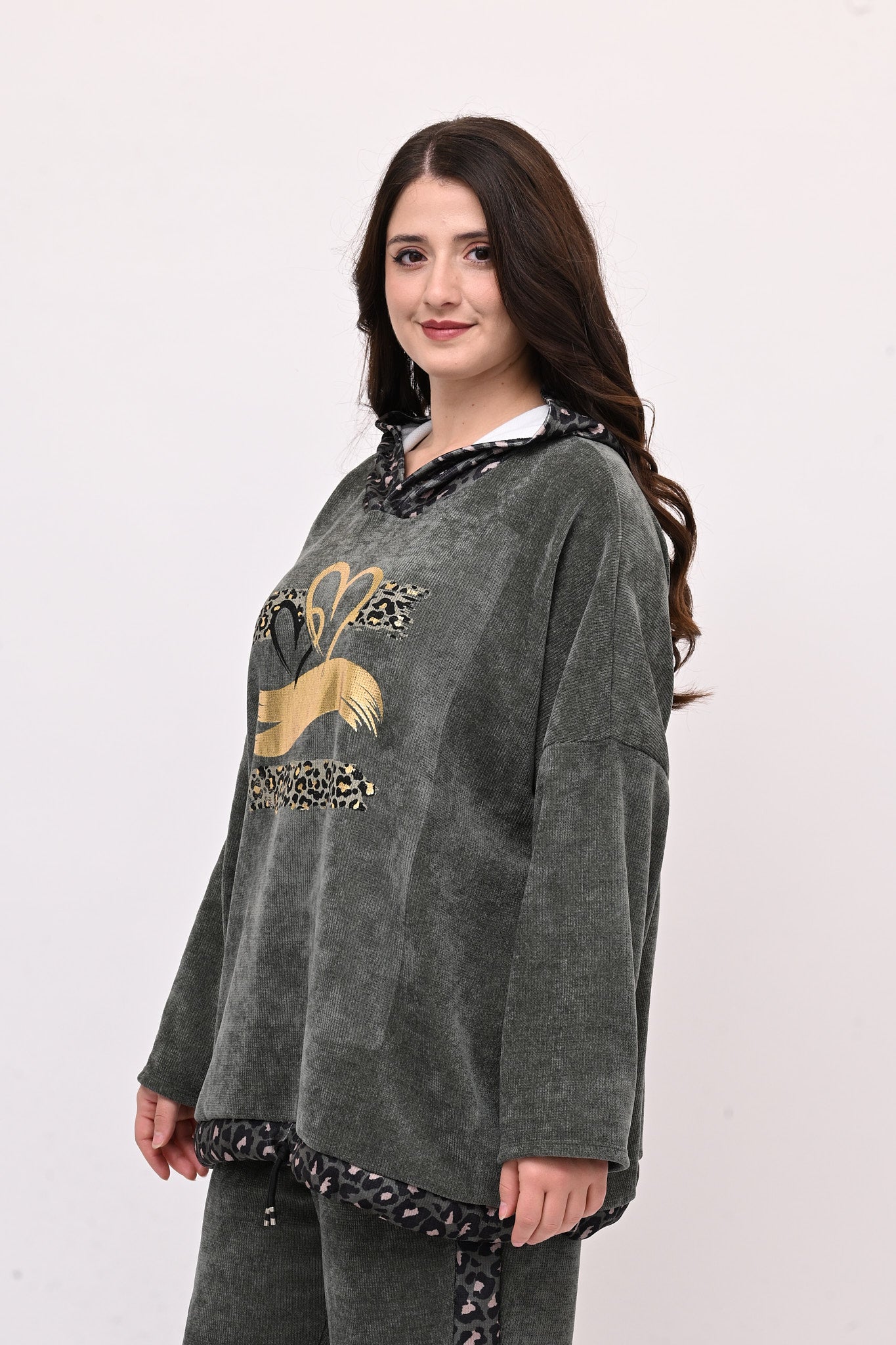 Tuta in ciniglia composta da: felpa con cappuccio e stampa animalier e cuori, con bordo regolabile fantasia e pantaloni con elastico in vita e banda animalier laterale. Perfetta per chi cerca un outfit versatile e sporty chic, senza rinunciare alla comodità.
