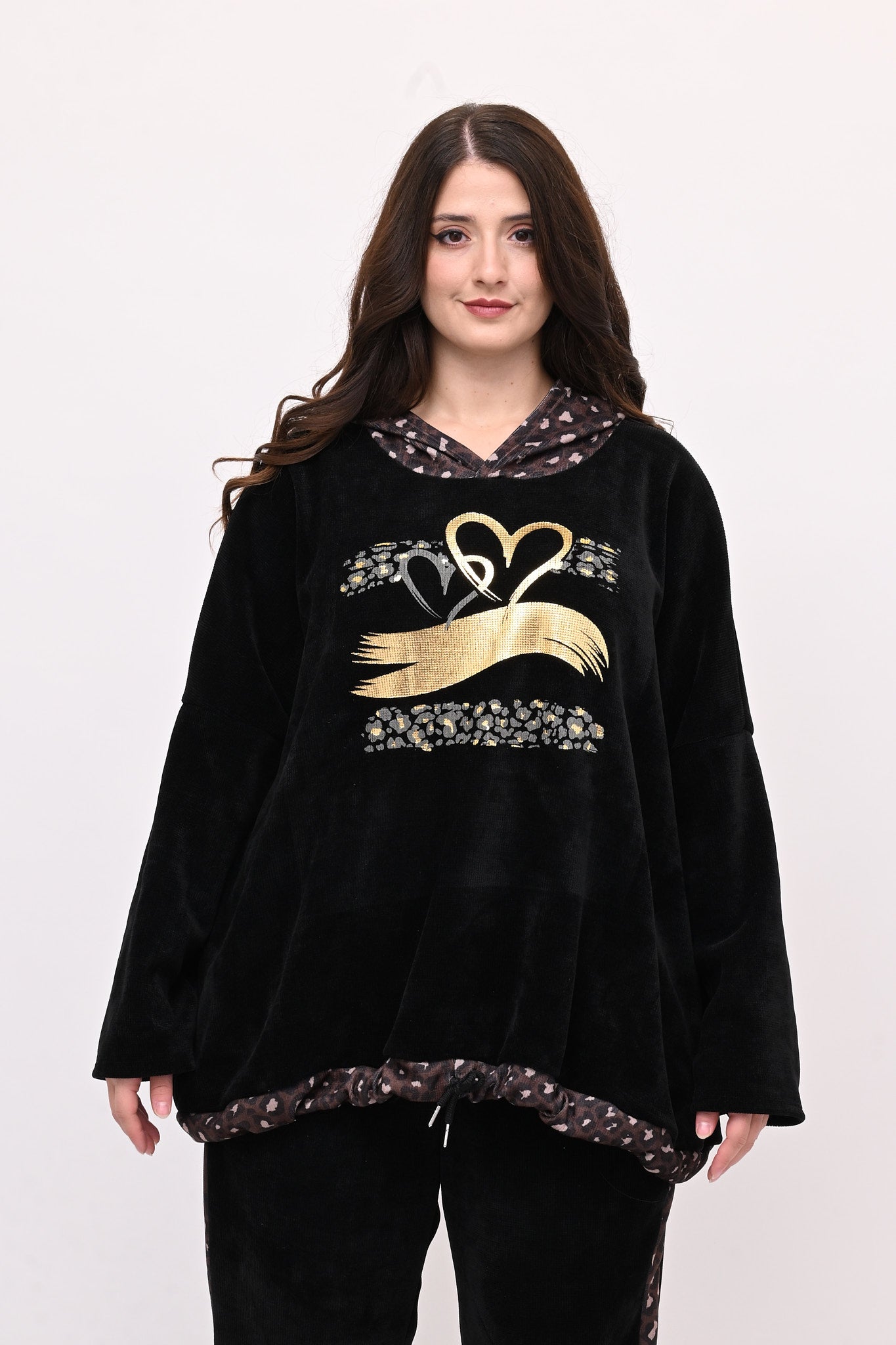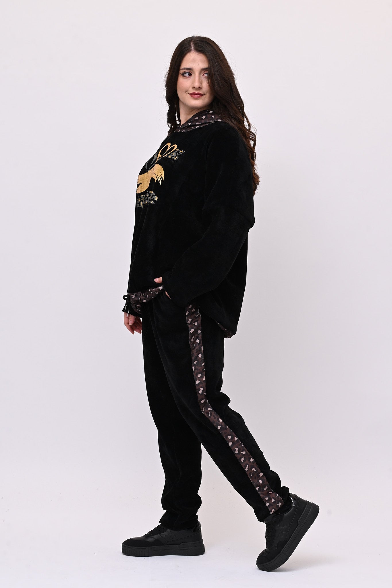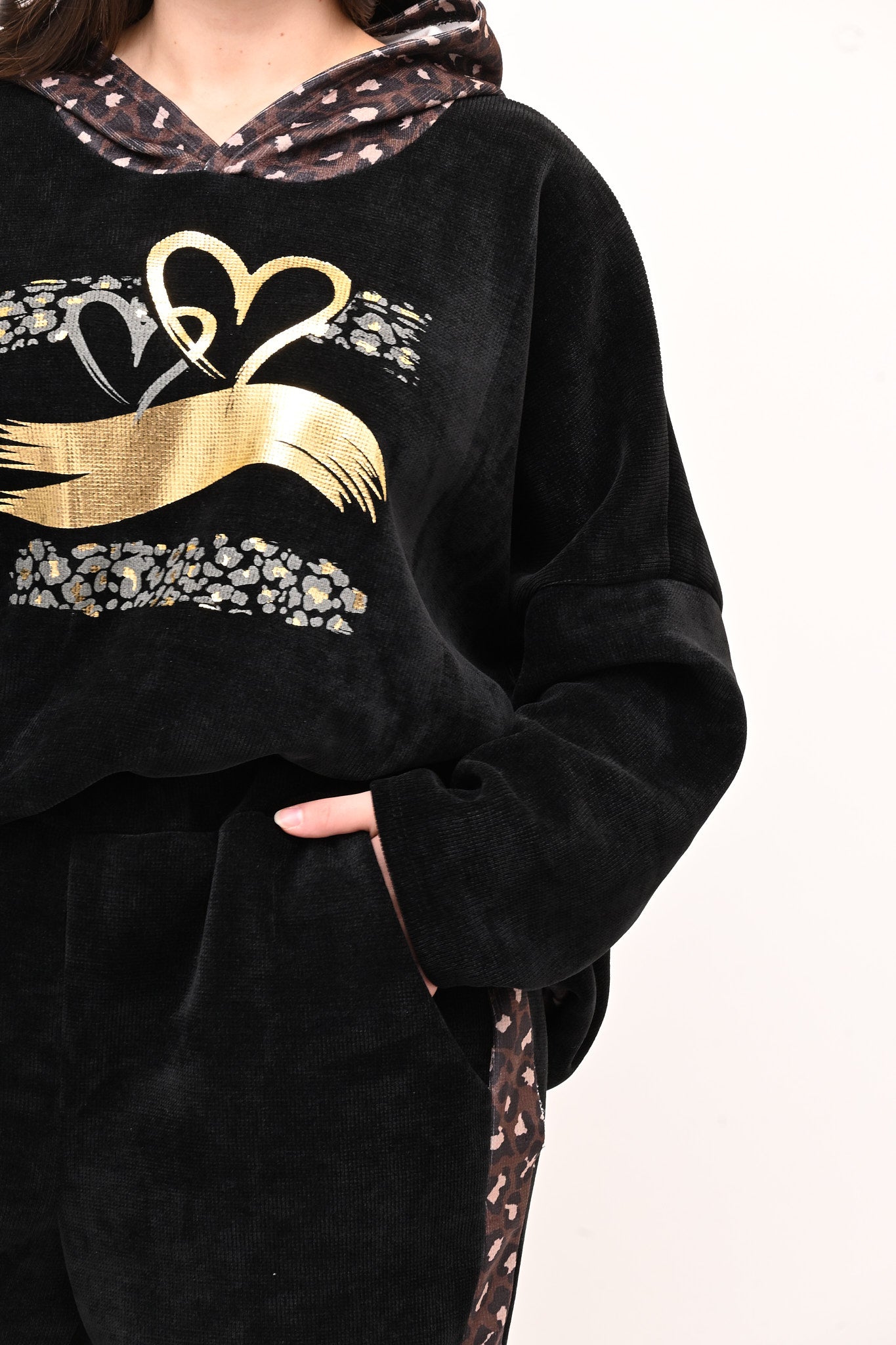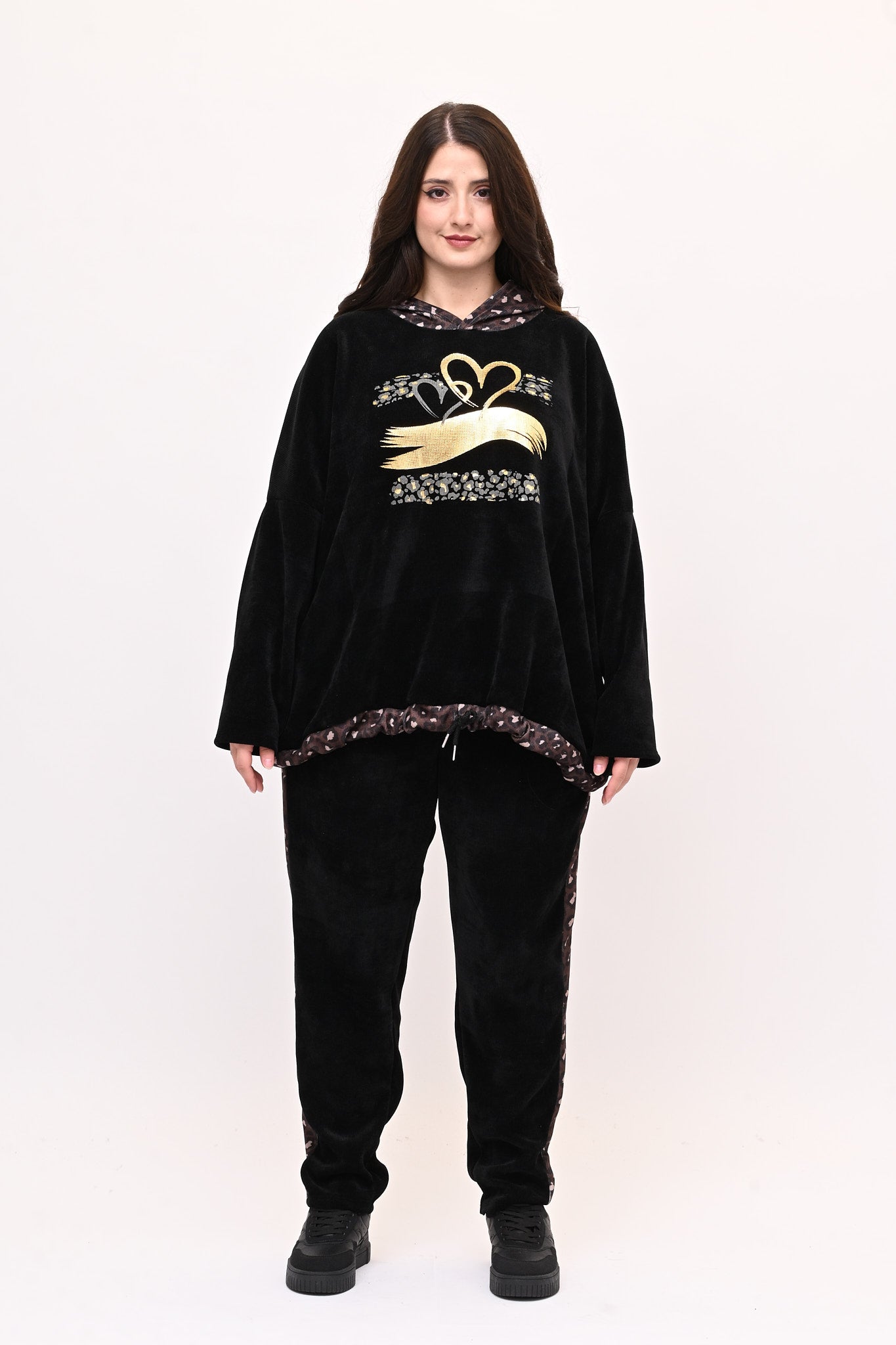 Tuta in ciniglia composta da: felpa con cappuccio e stampa animalier e cuori, con bordo regolabile fantasia e pantaloni con elastico in vita e banda animalier laterale. Perfetta per chi cerca un outfit versatile e sporty chic, senza rinunciare alla comodità.