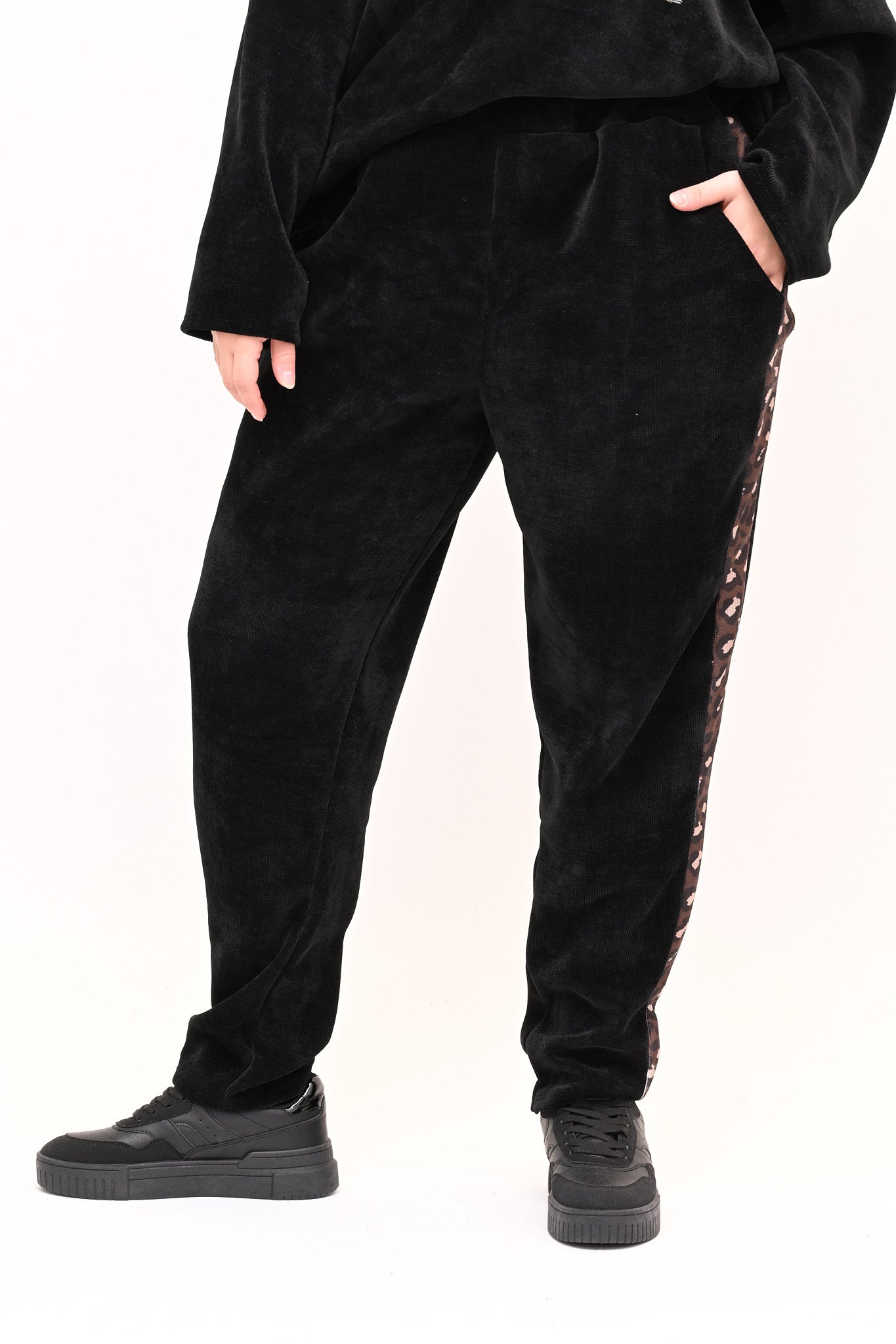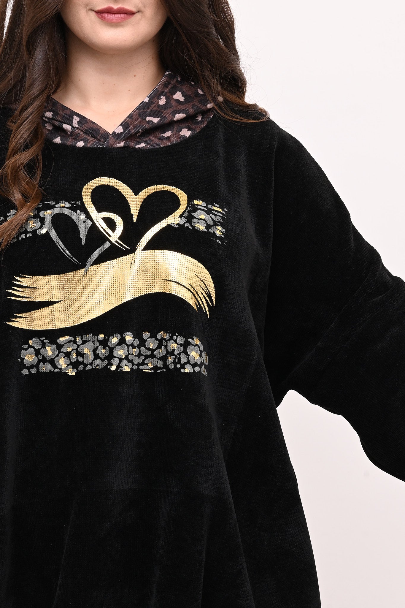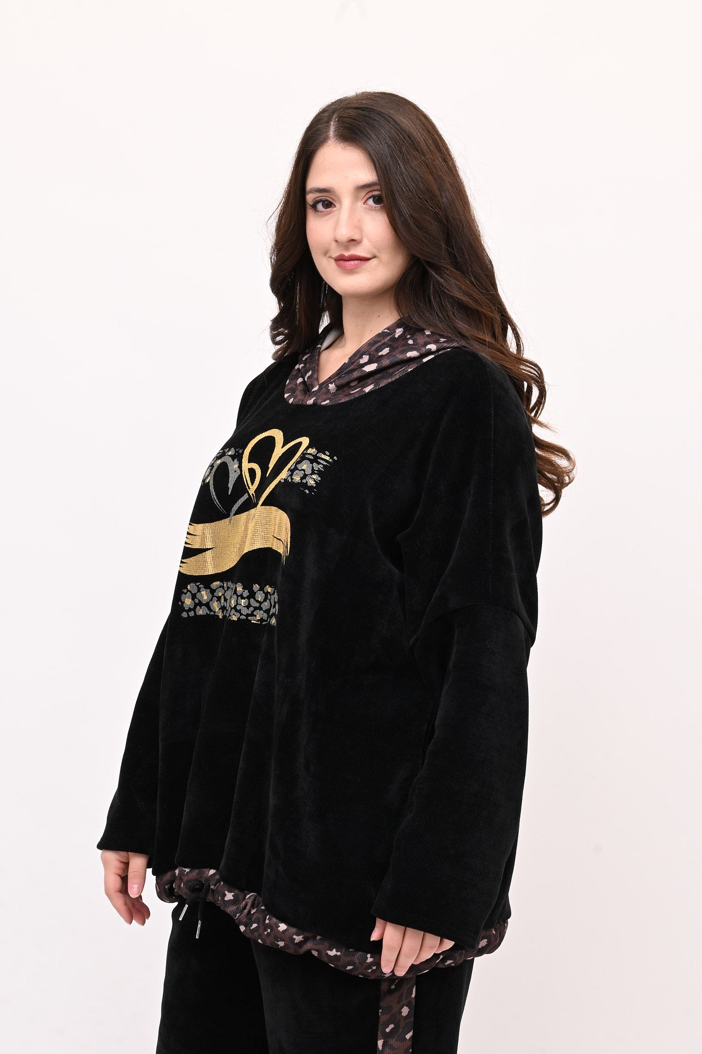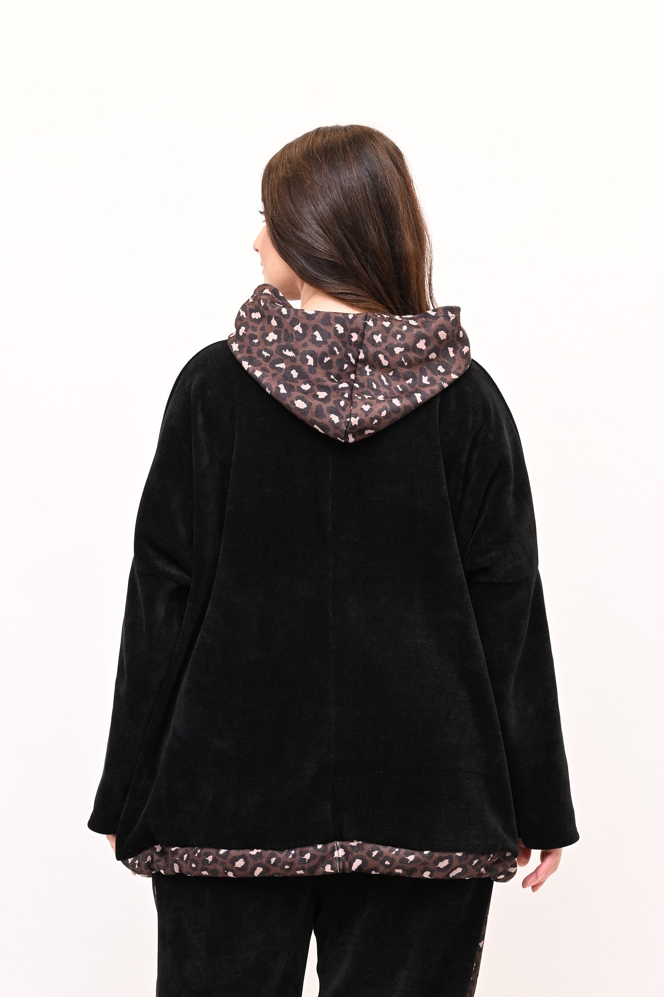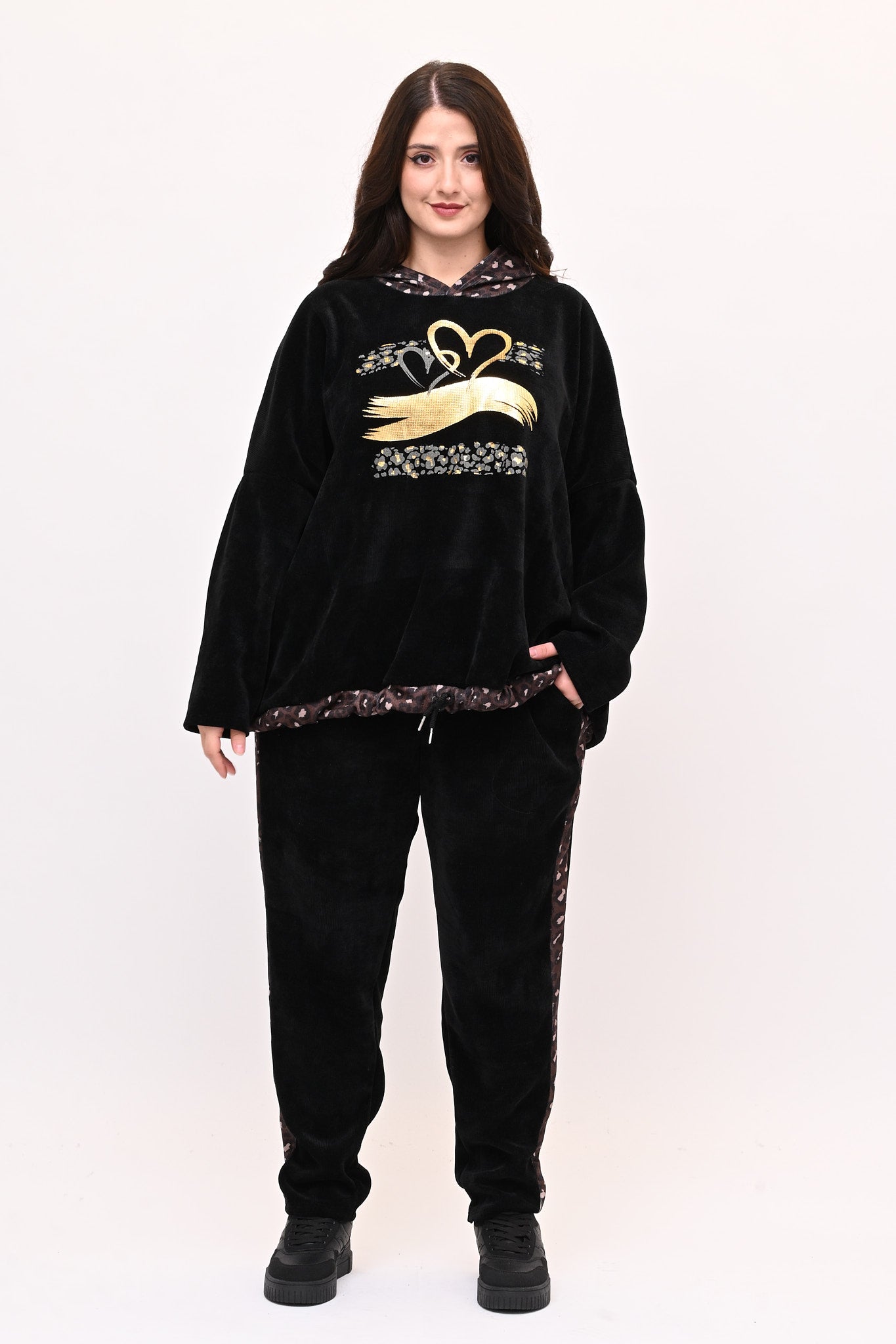 Tuta in ciniglia composta da: felpa con cappuccio e stampa animalier e cuori, con bordo regolabile fantasia e pantaloni con elastico in vita e banda animalier laterale. Perfetta per chi cerca un outfit versatile e sporty chic, senza rinunciare alla comodità.