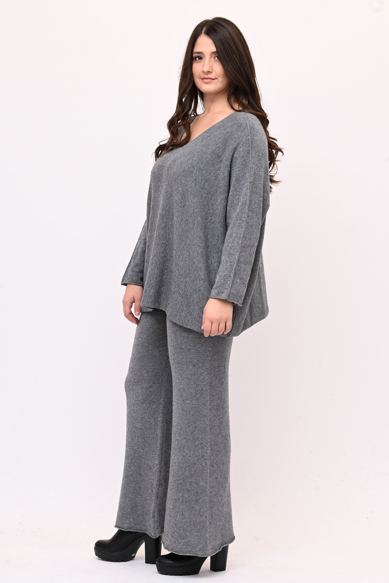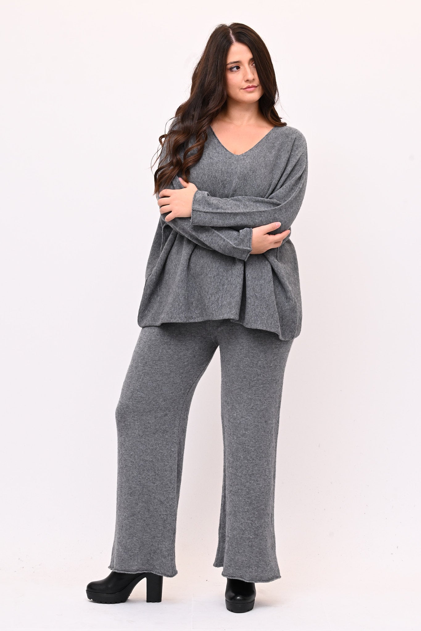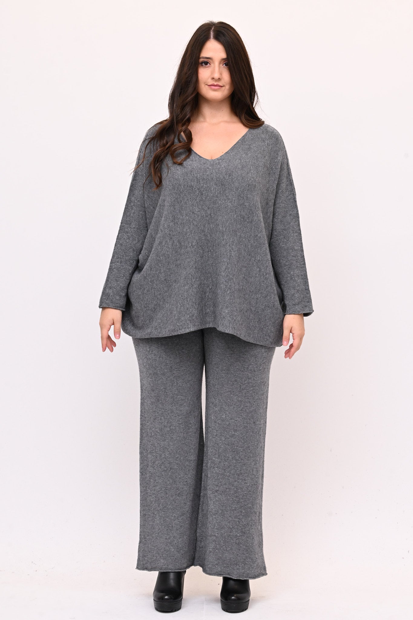 Completo in calda viscosa dal comfort che avvolge senza costringere. La maglia ha scollo a V,  spalle scese, linea a scatoletta e il pantalone elastico in vita e gambe dritte. Un coordinato rilassato, ideale per chi cerca uno stile versatile e pratico senza rinunciare a un tocco sofisticato.