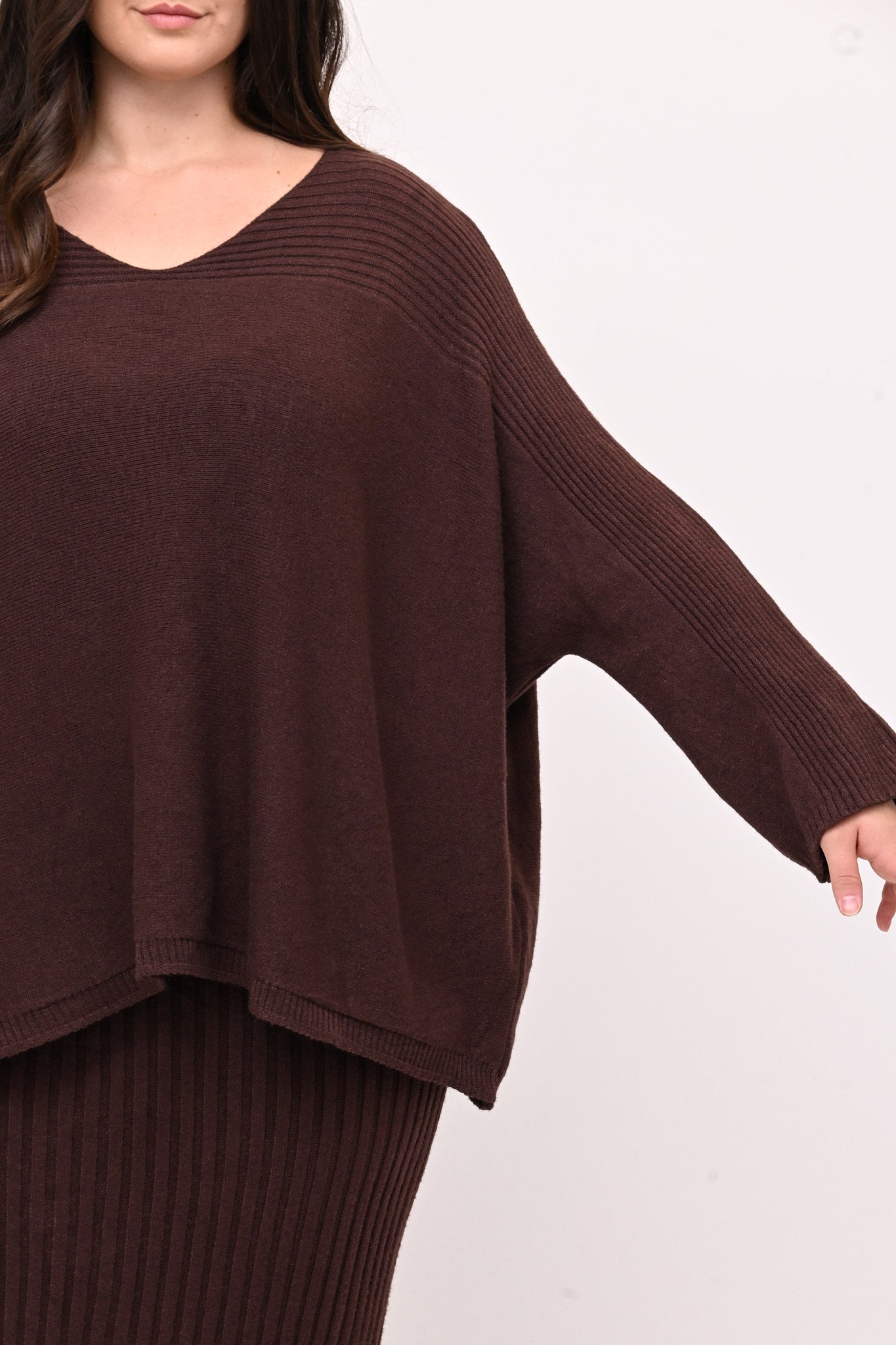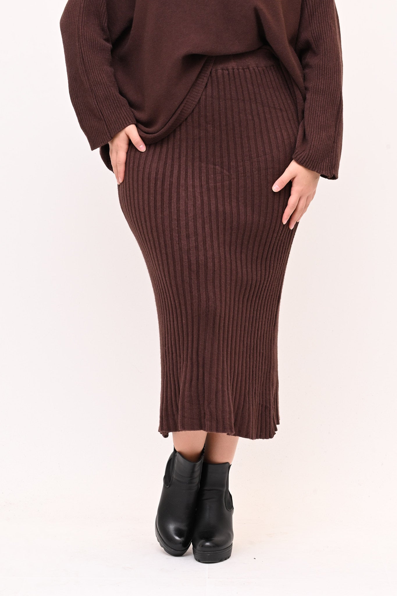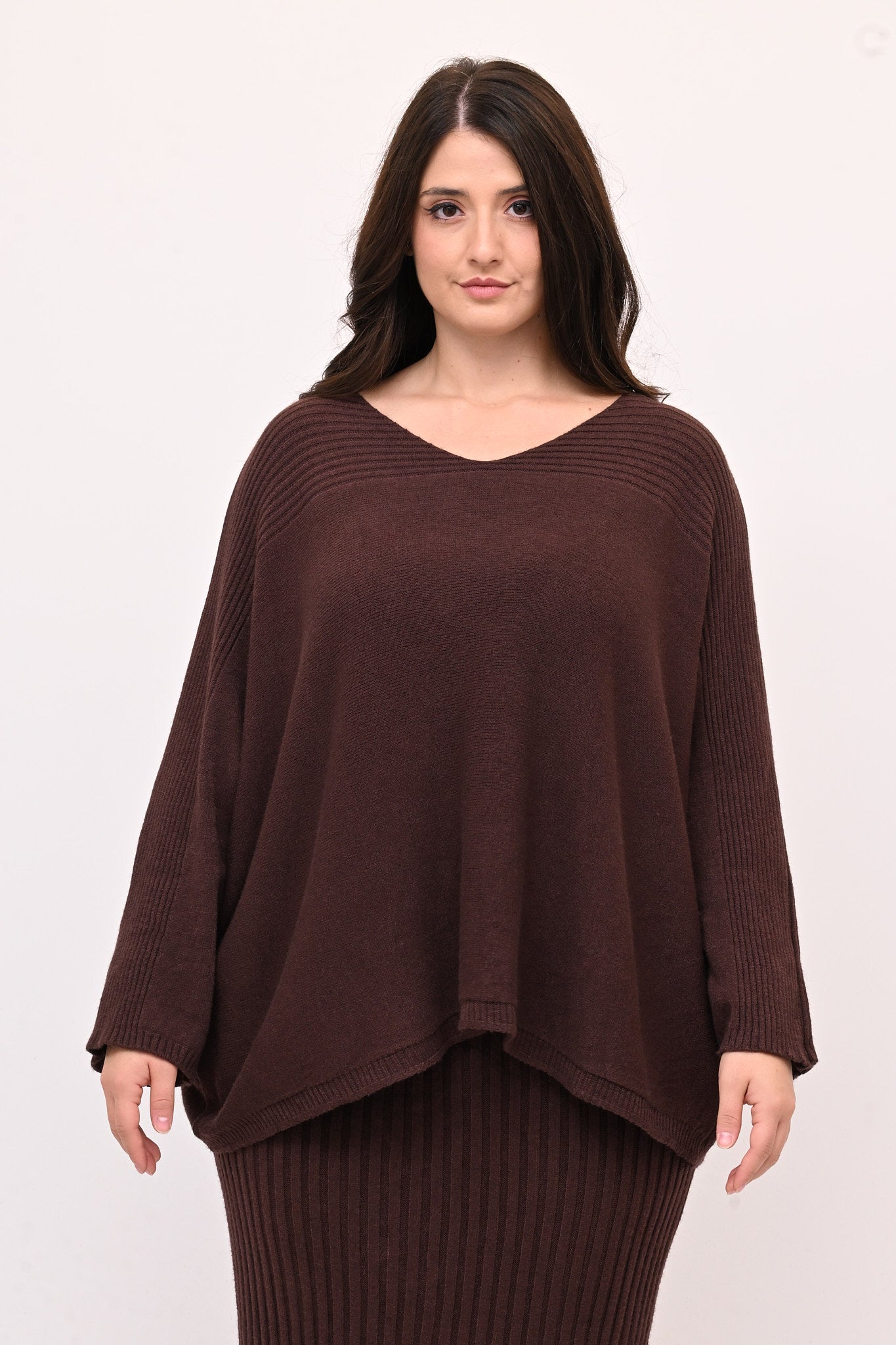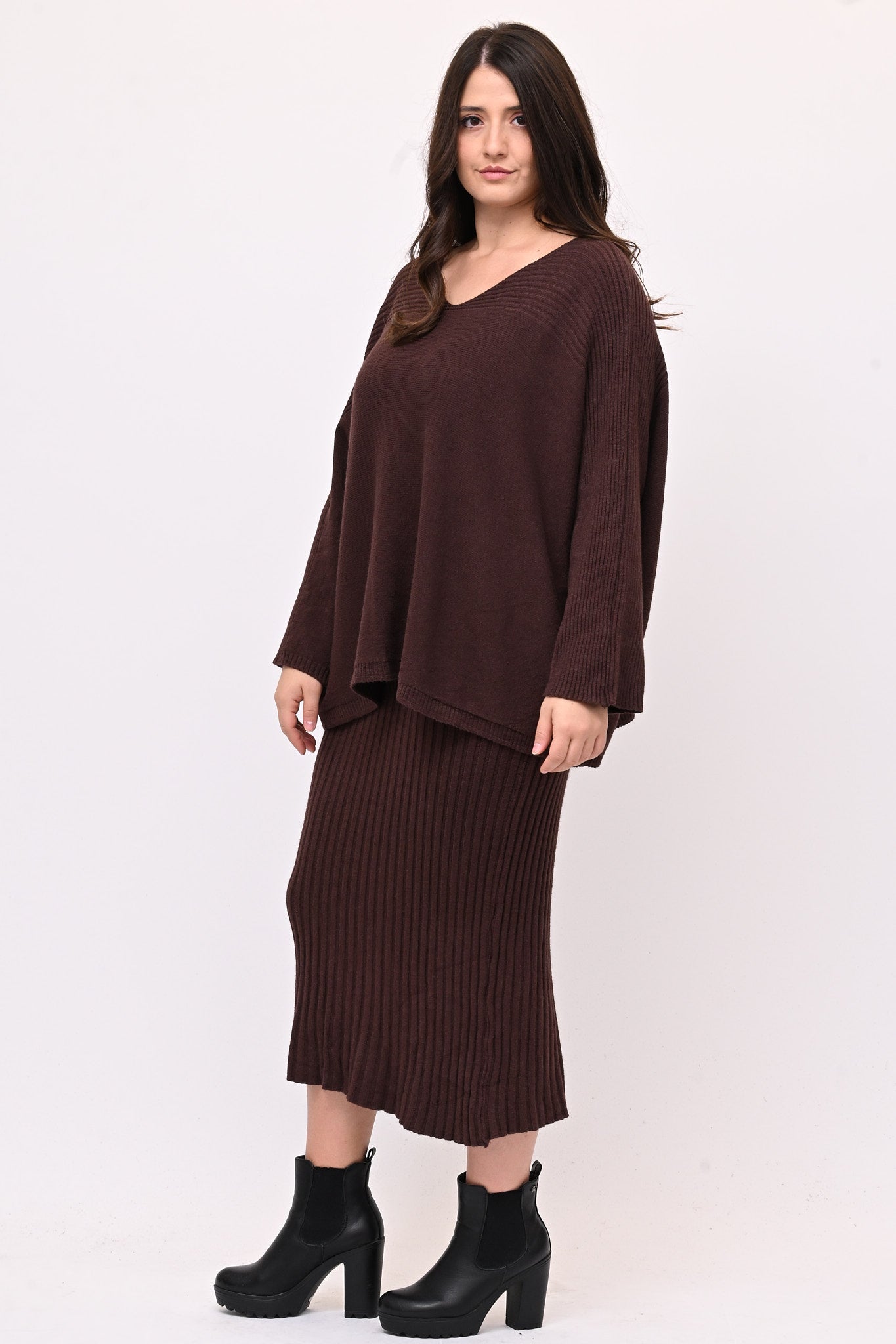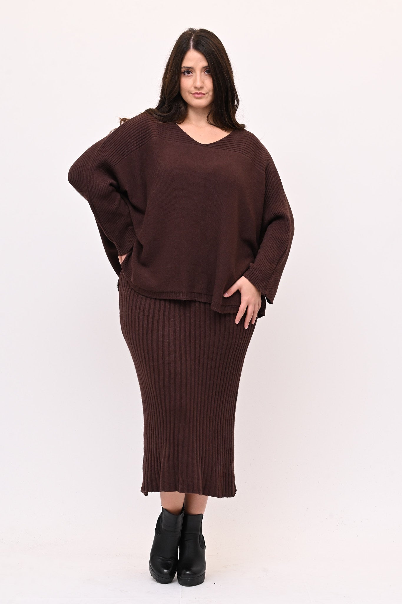 Completo in calda viscosa dal comfort che avvolge senza costringere.  La maglia è a scatoletta con scollo a V e con lavorazione a coste sulle maniche. La gonna a tubino è a coste e lunga fino al polpaccio. Ideale per chi cerca uno stile raffinato, femminile e pratico.