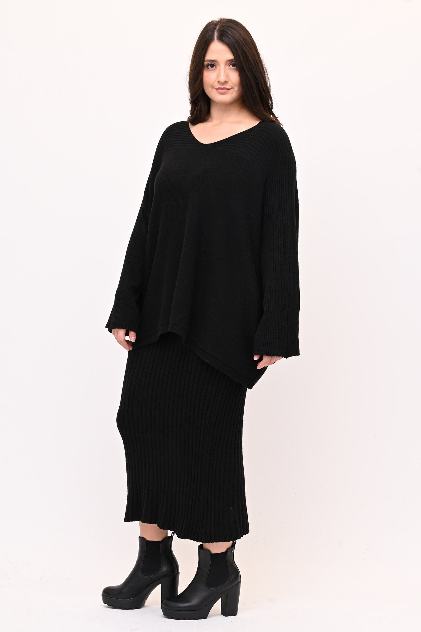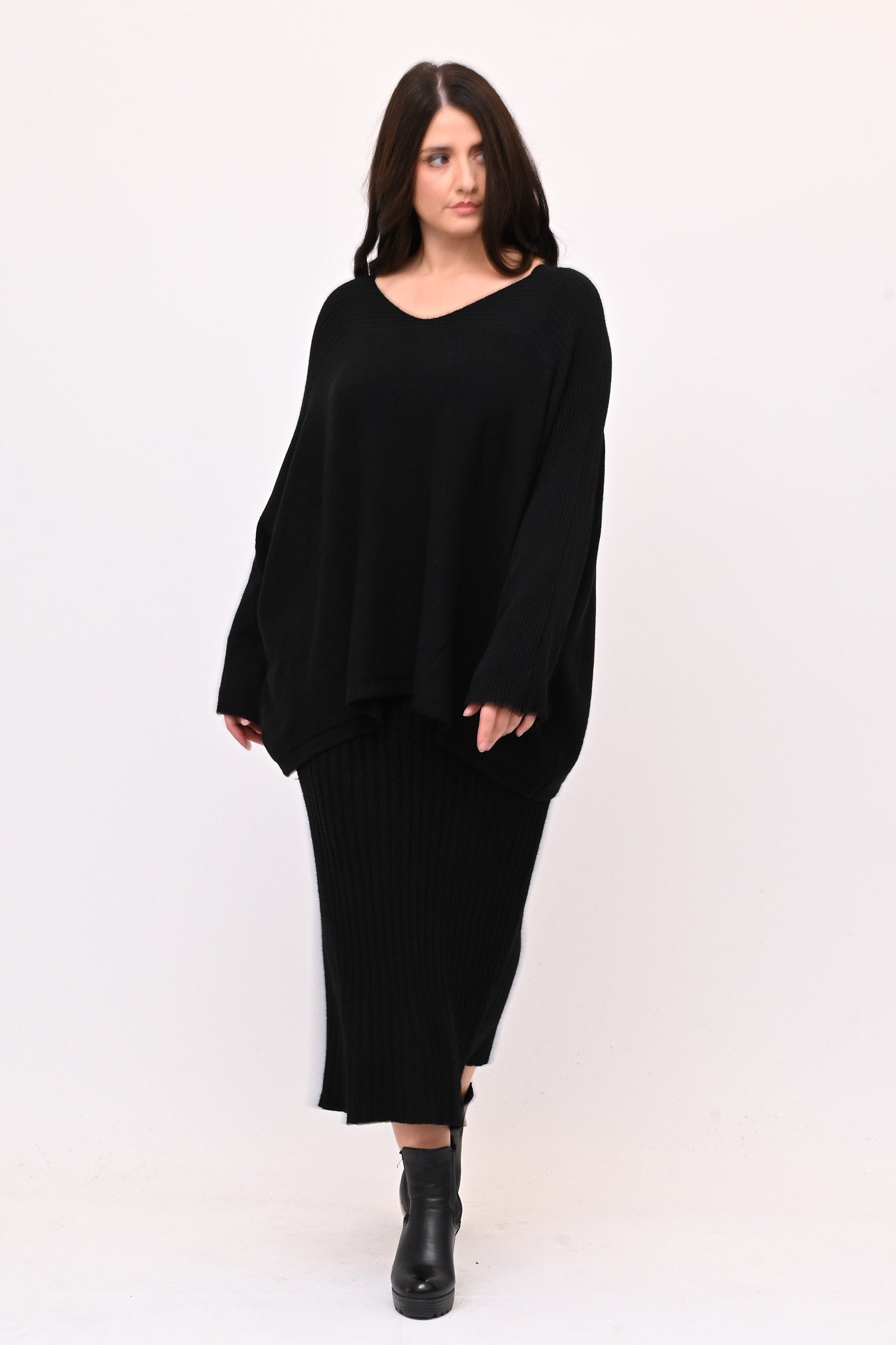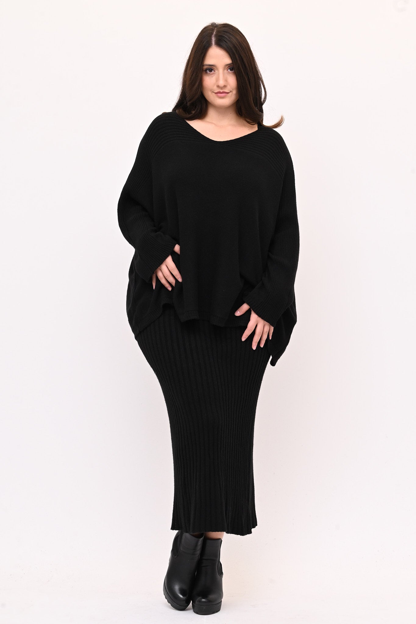 Completo in calda viscosa dal comfort che avvolge senza costringere.  La maglia è a scatoletta con scollo a V e con lavorazione a coste sulle maniche. La gonna a tubino è a coste e lunga fino alla caviglia. Ideale per chi cerca uno stile raffinato, femminile e pratico.