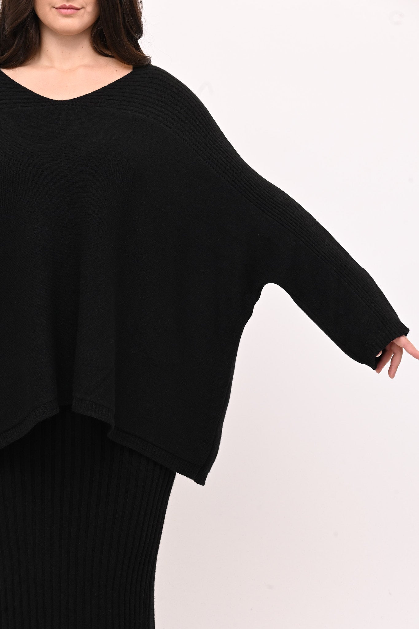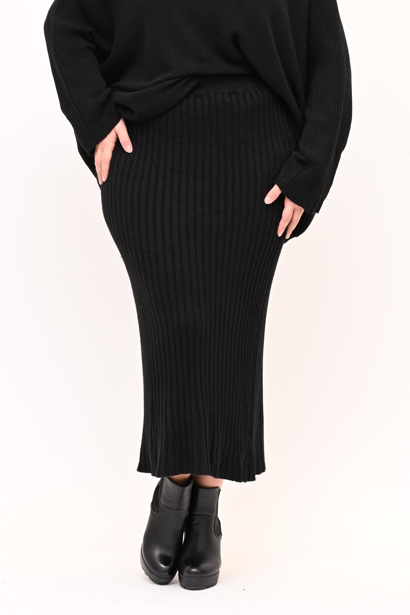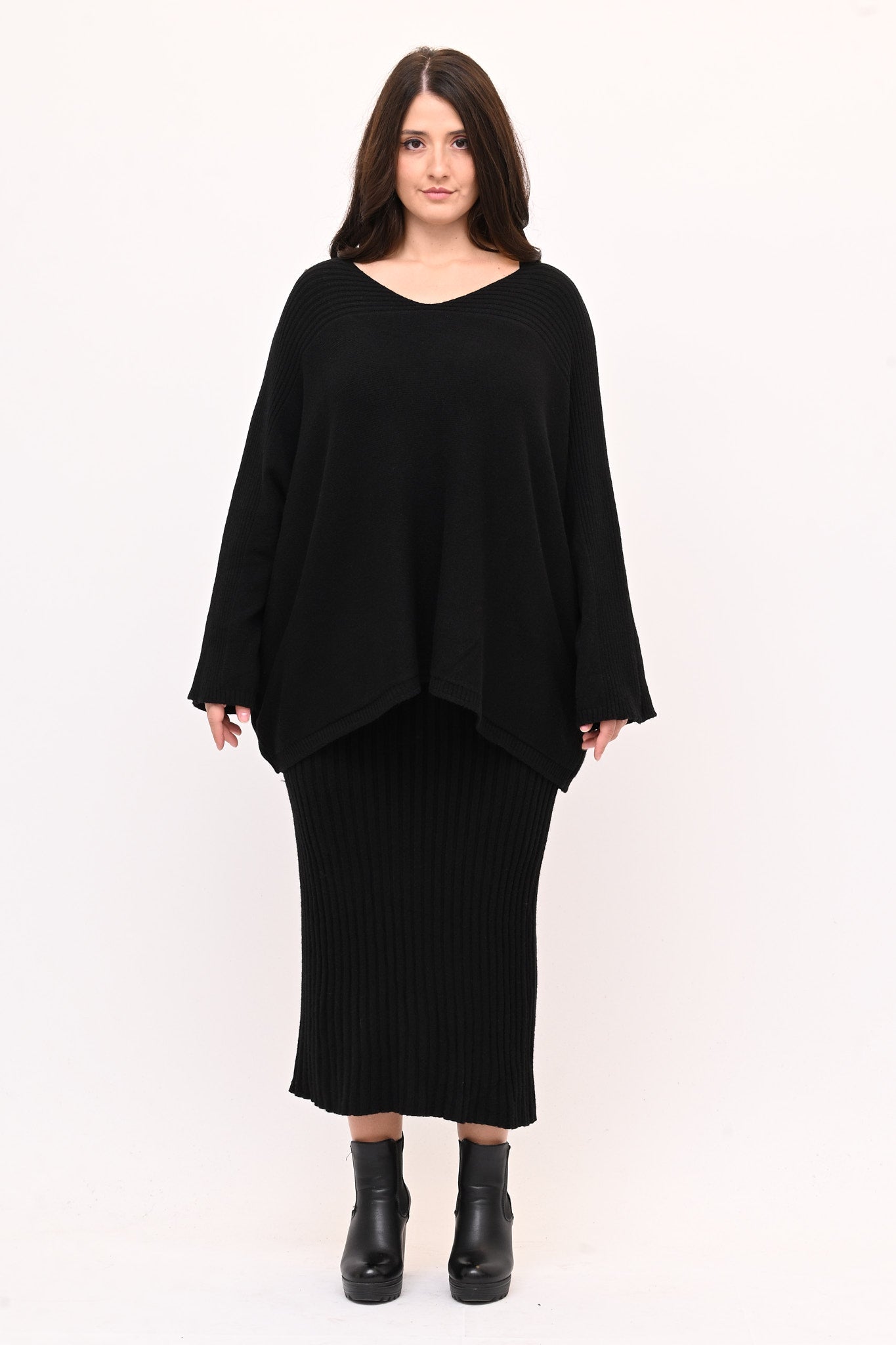 Completo in calda viscosa dal comfort che avvolge senza costringere.  La maglia è a scatoletta con scollo a V e con lavorazione a coste sulle maniche. La gonna a tubino è a coste e lunga fino alla caviglia. Ideale per chi cerca uno stile raffinato, femminile e pratico.