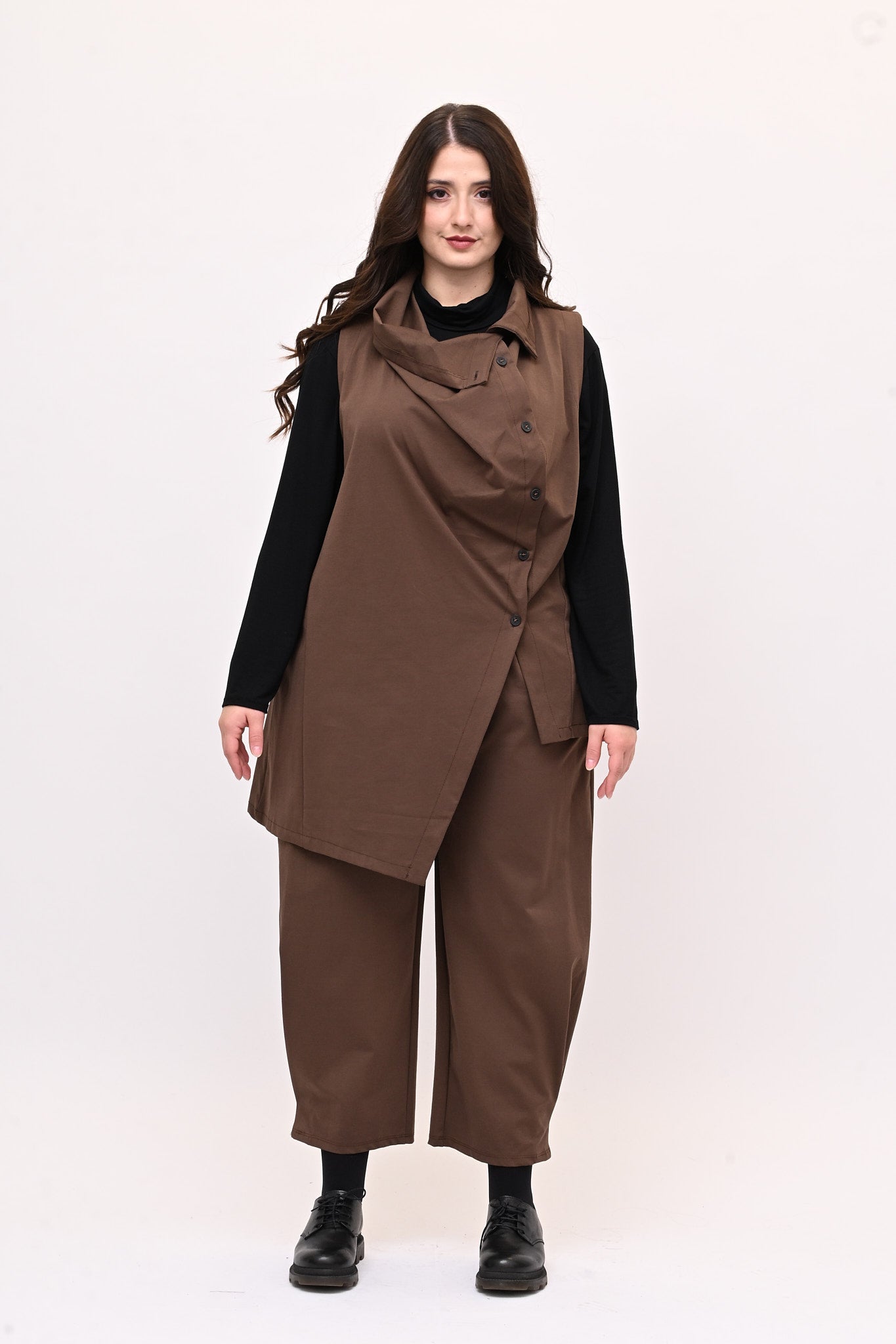 Completo composto da: gilet asimmetrico, con abbottonatura laterale, più lungo su un lato e pantalone modello buggy, con elastico in vita e cuciture sulla caviglia. Una combinazione ideale per chi cerca un outfit easy chic, che coniuga originalità e versatilità in ogni look.