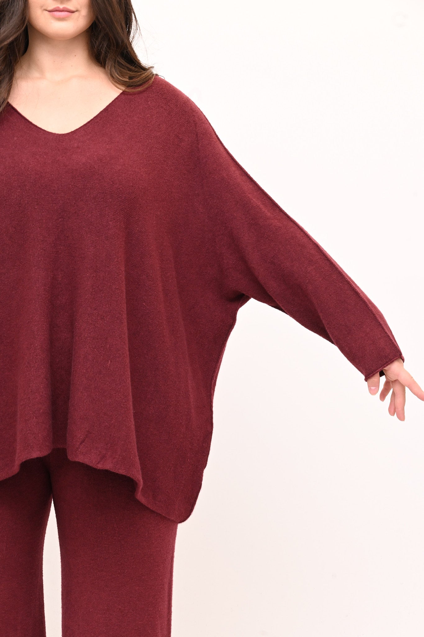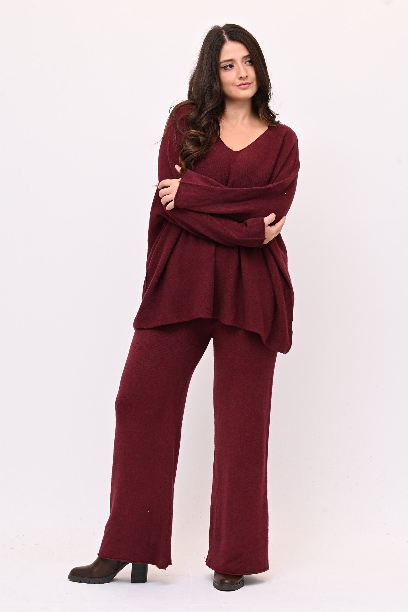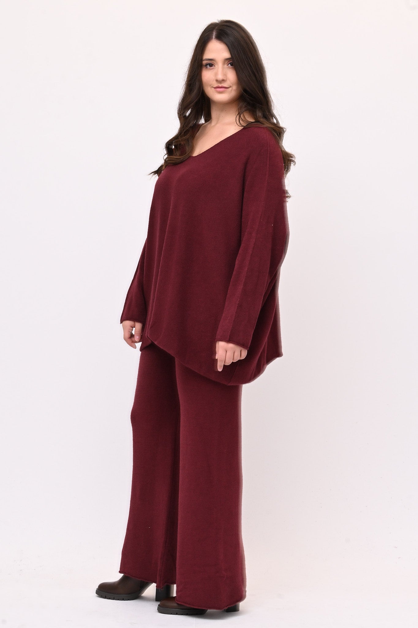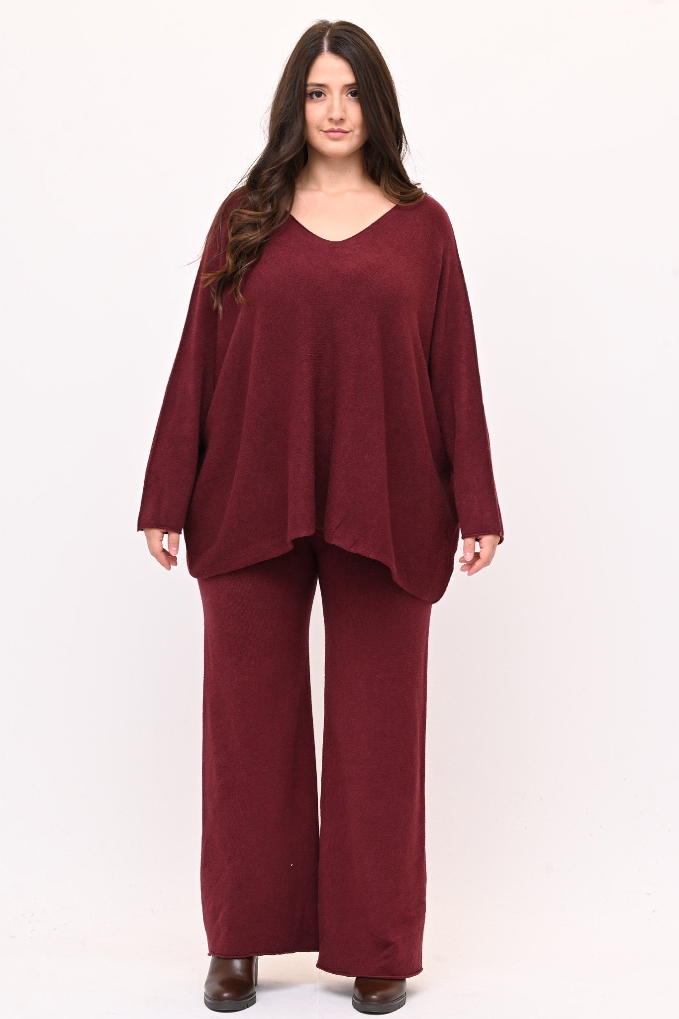 Completo in calda viscosa dal comfort che avvolge senza costringere. La maglia ha scollo a V,  spalle scese, linea a scatoletta e il pantalone elastico in vita e gambe dritte. Un coordinato rilassato, ideale per chi cerca uno stile versatile e pratico senza rinunciare a un tocco sofisticato.