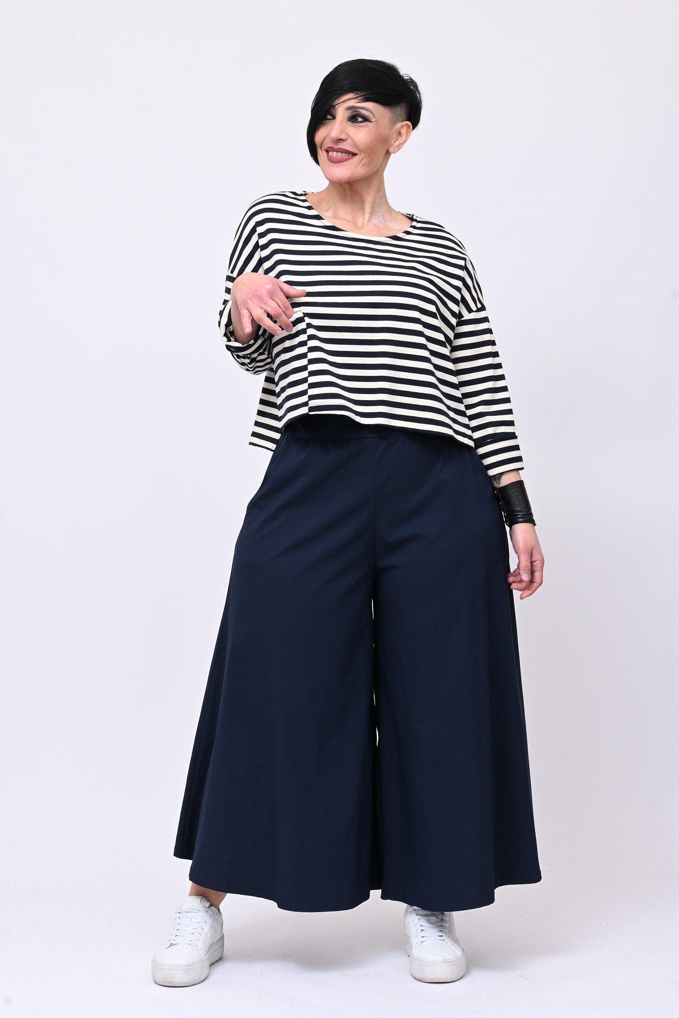 La modella è alta 1,70 cm - Giro seno: 93 cm - Giro vita: 84 cm - Giro fianchi: 128 cm.