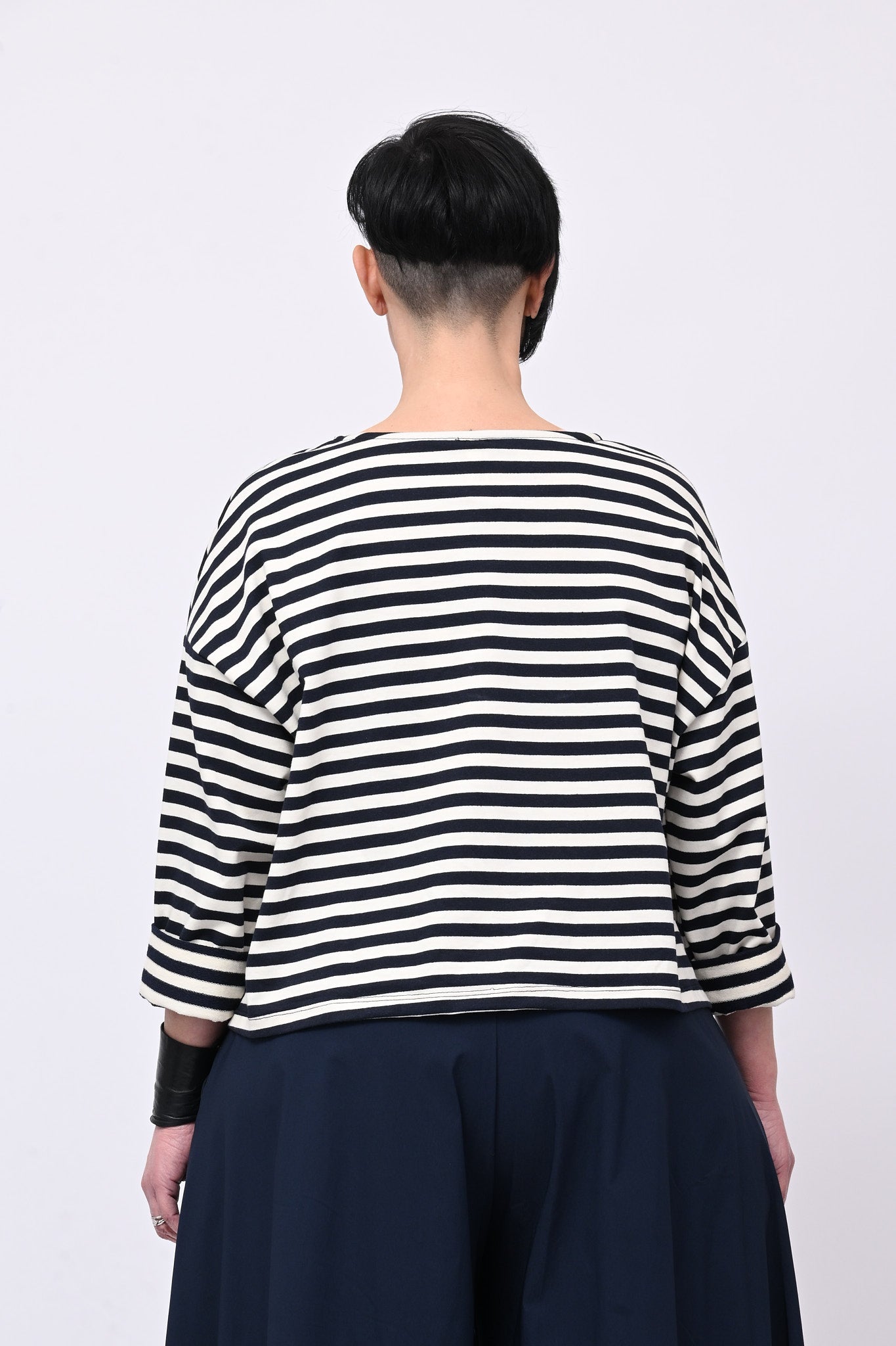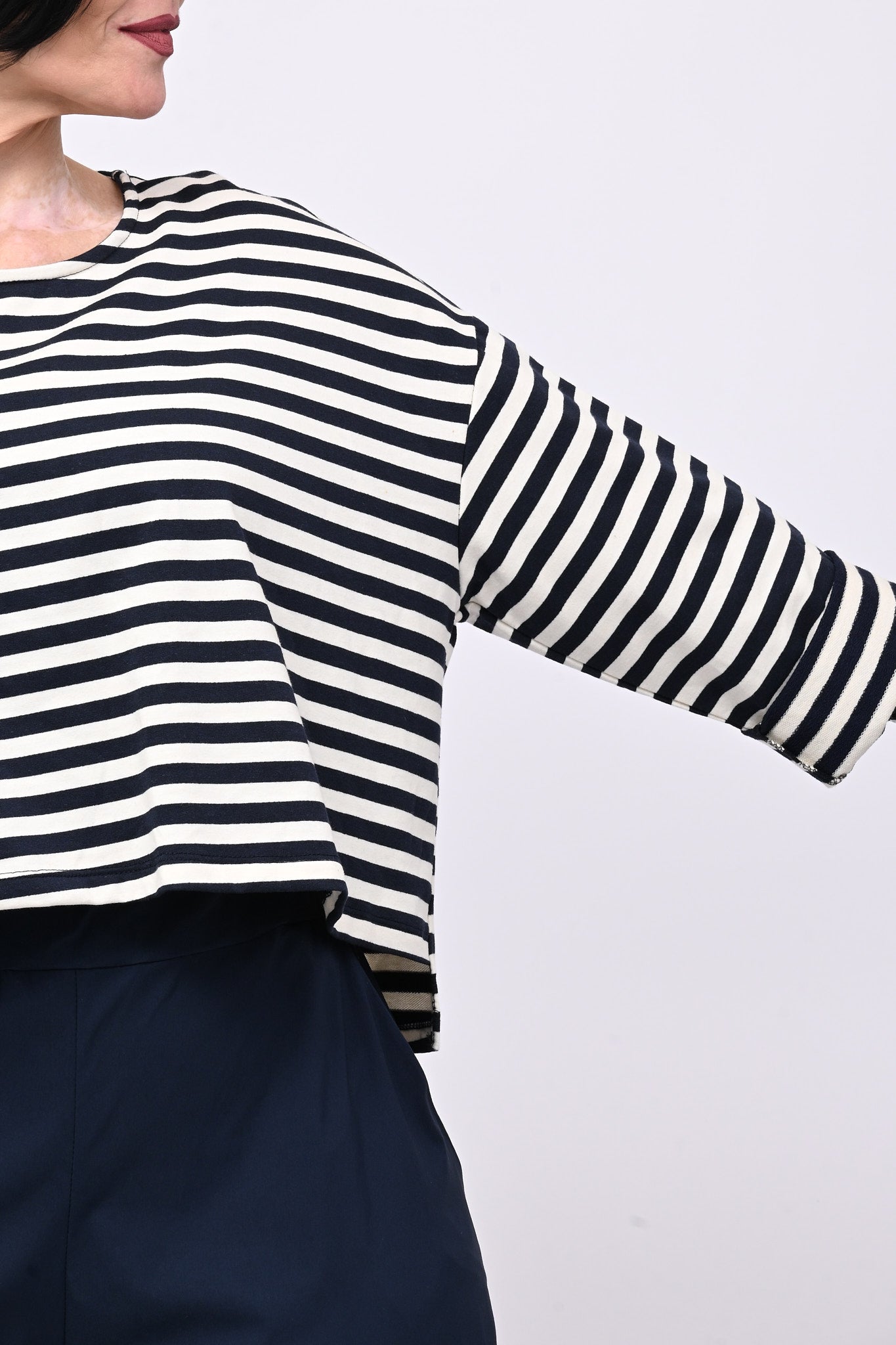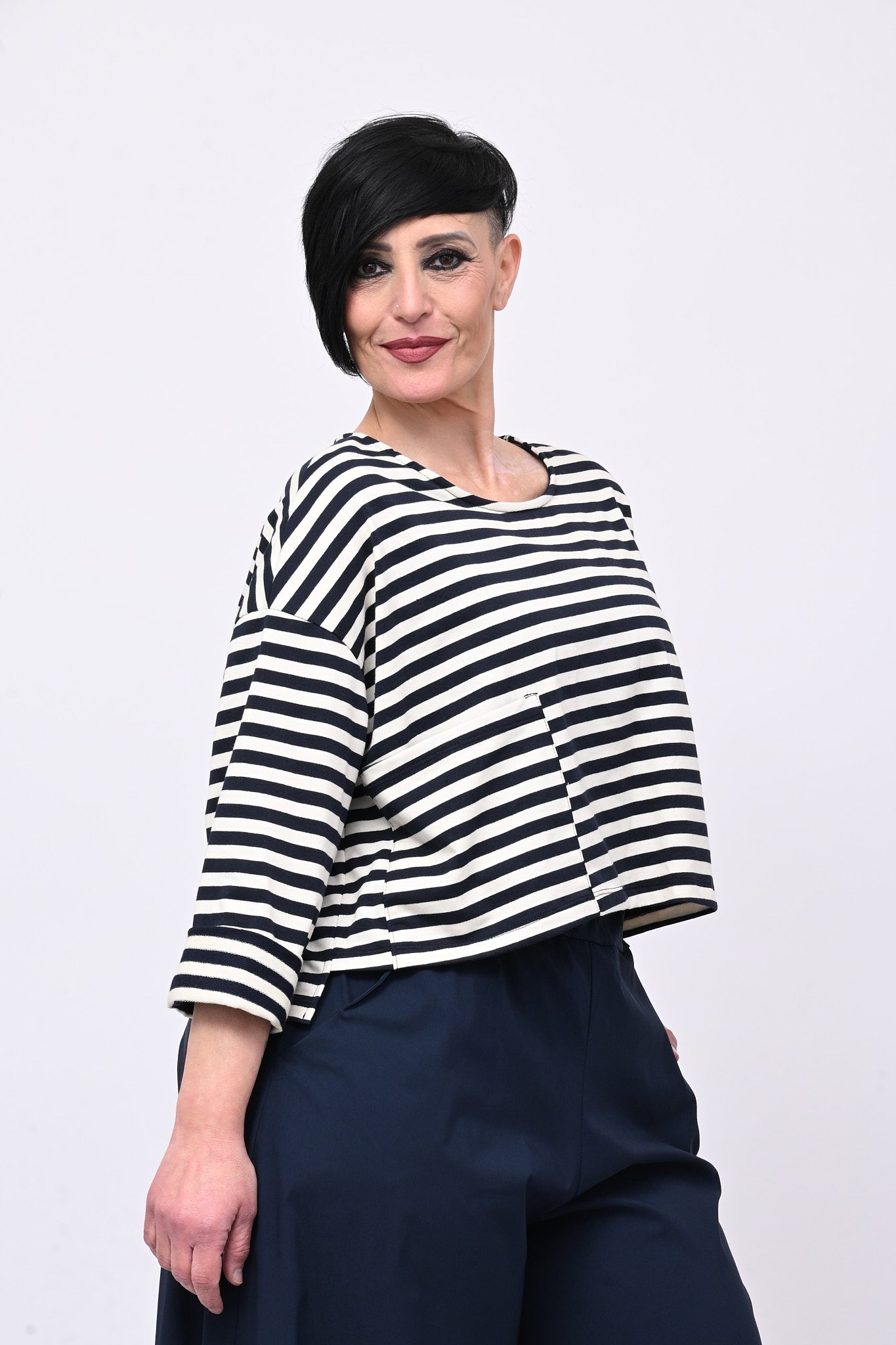 Felpa crop garzata, fantasia a righe, taglio leggermente più lungo sul retro e grande tasca applicata davanti. Versatile e comoda, si abbina facilmente a qualsiasi outfit, dal casual al semi-formale. Un capo che unisce stile e praticità.