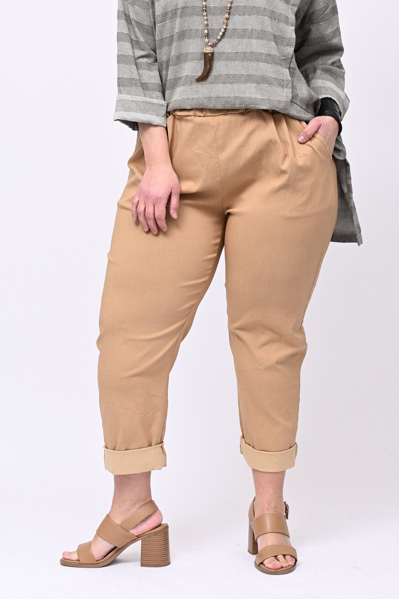 Pantalone bengalina over con elastico in vita e tasche. Finta pattina, gamba tipo baggy e risvoltino regolabile. Il jolly dei pantaloni, molto elasticizzato, con una vestibilità ampia e una comodità senza confronti. Un vero best seller.