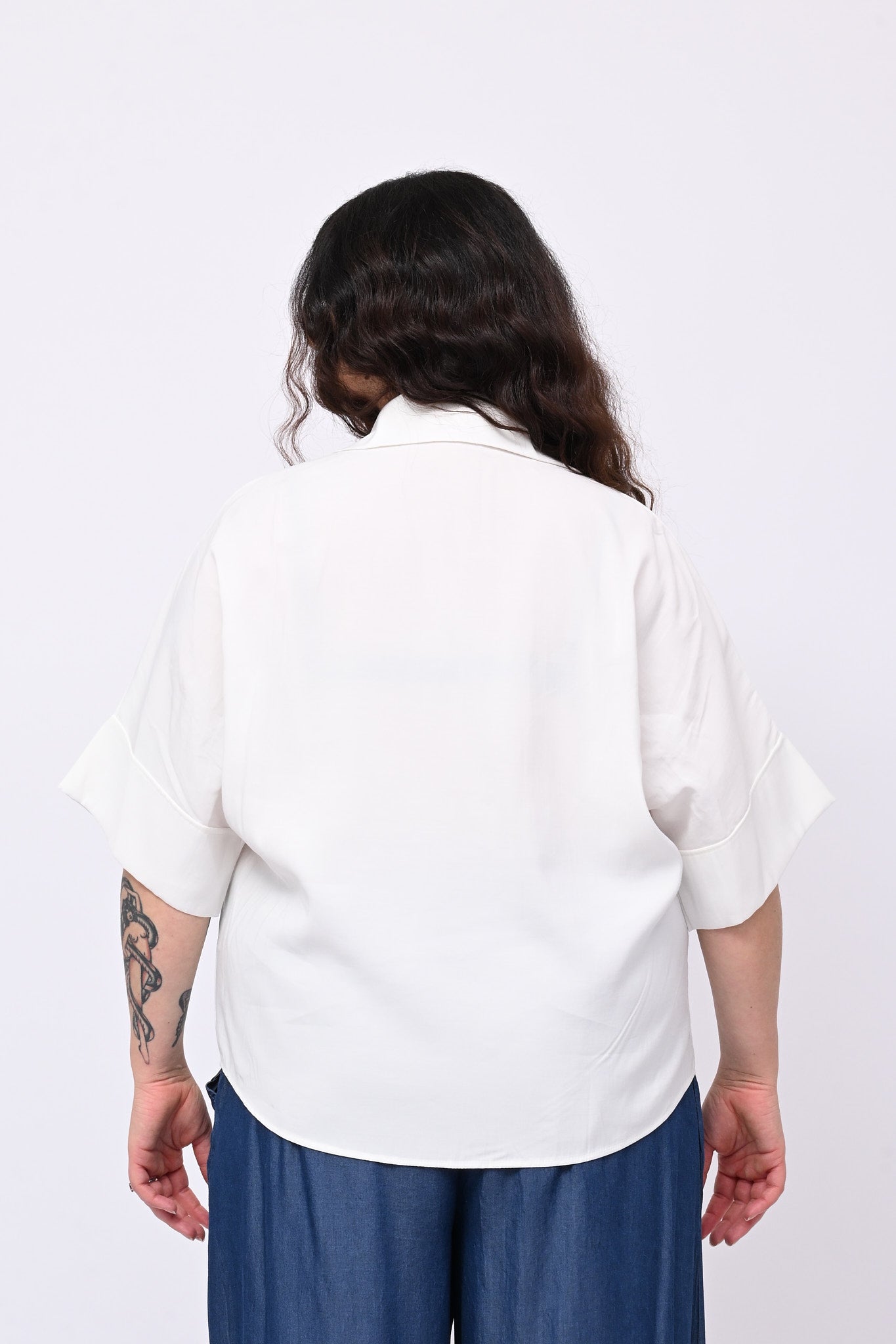 Camicia effetto seta lavata, mezza manica, design senza spalla, silhouette a scatoletta che valorizza la figura mantenendo un'eleganza sobria. Perfetta per chi ricerca versatilità: indossabile sia in contesti formali che casual, si adatta facilmente a qualsiasi guardaroba.