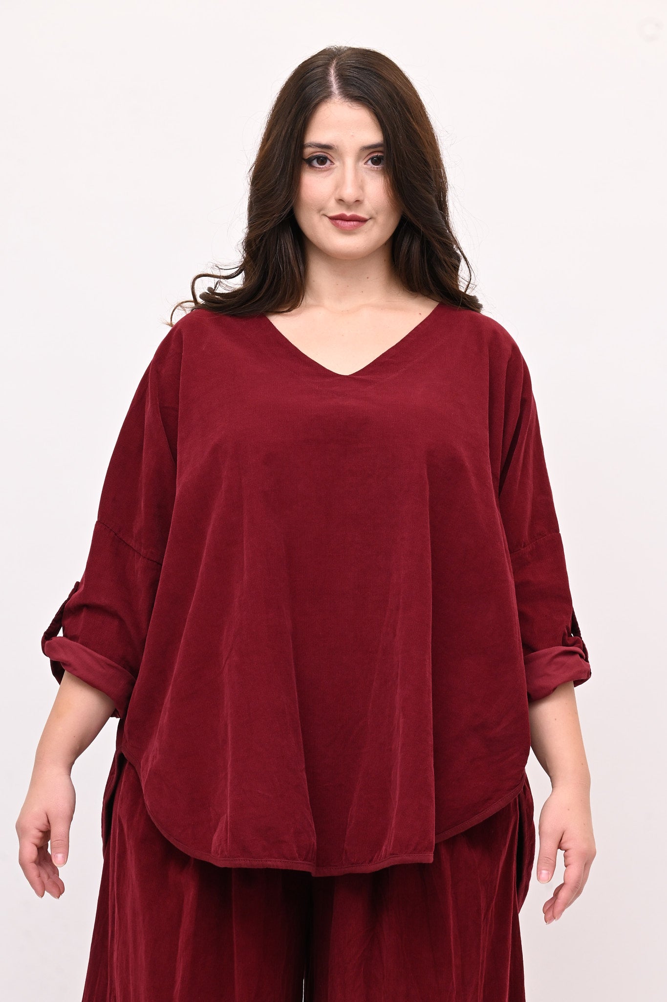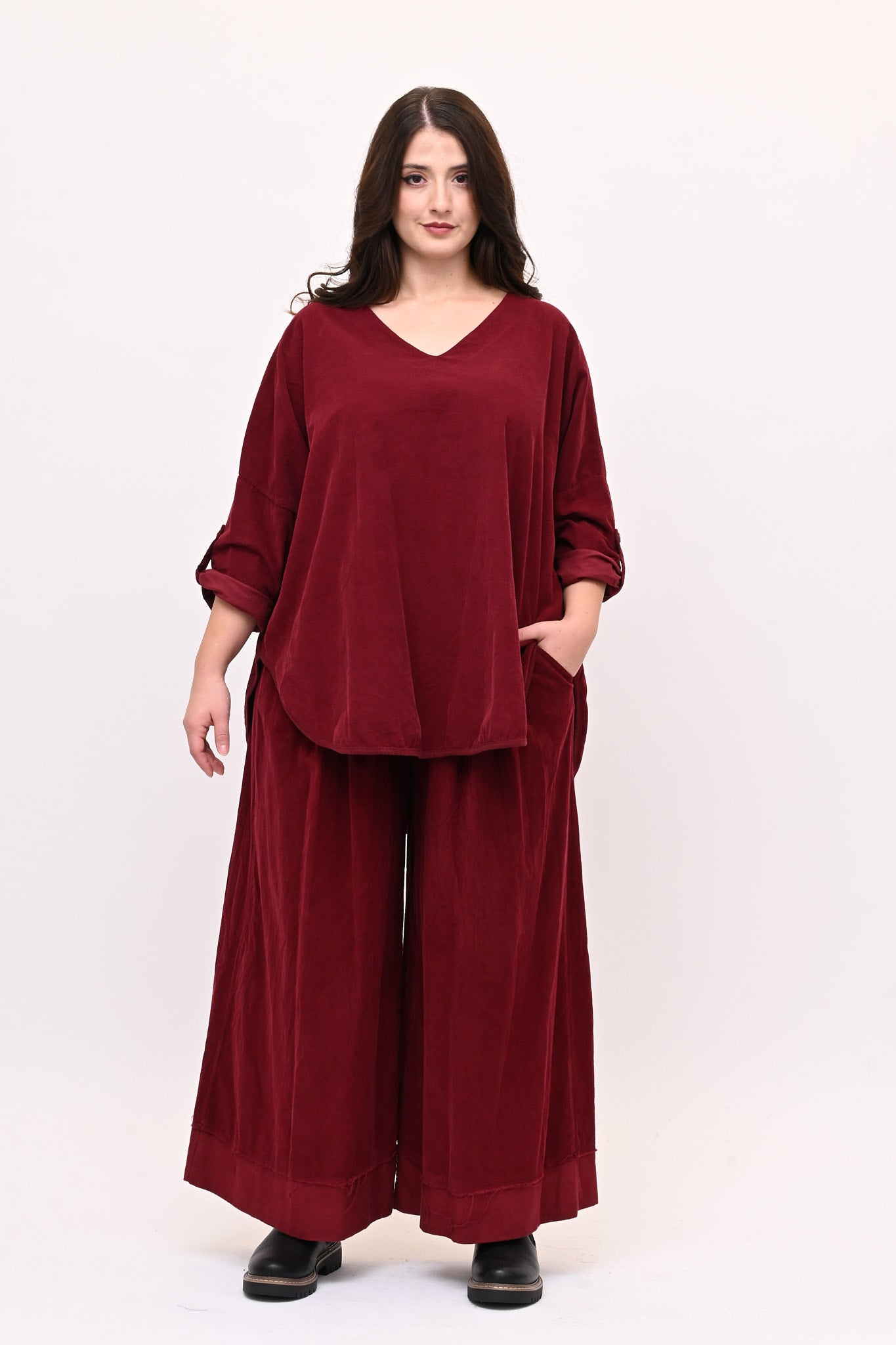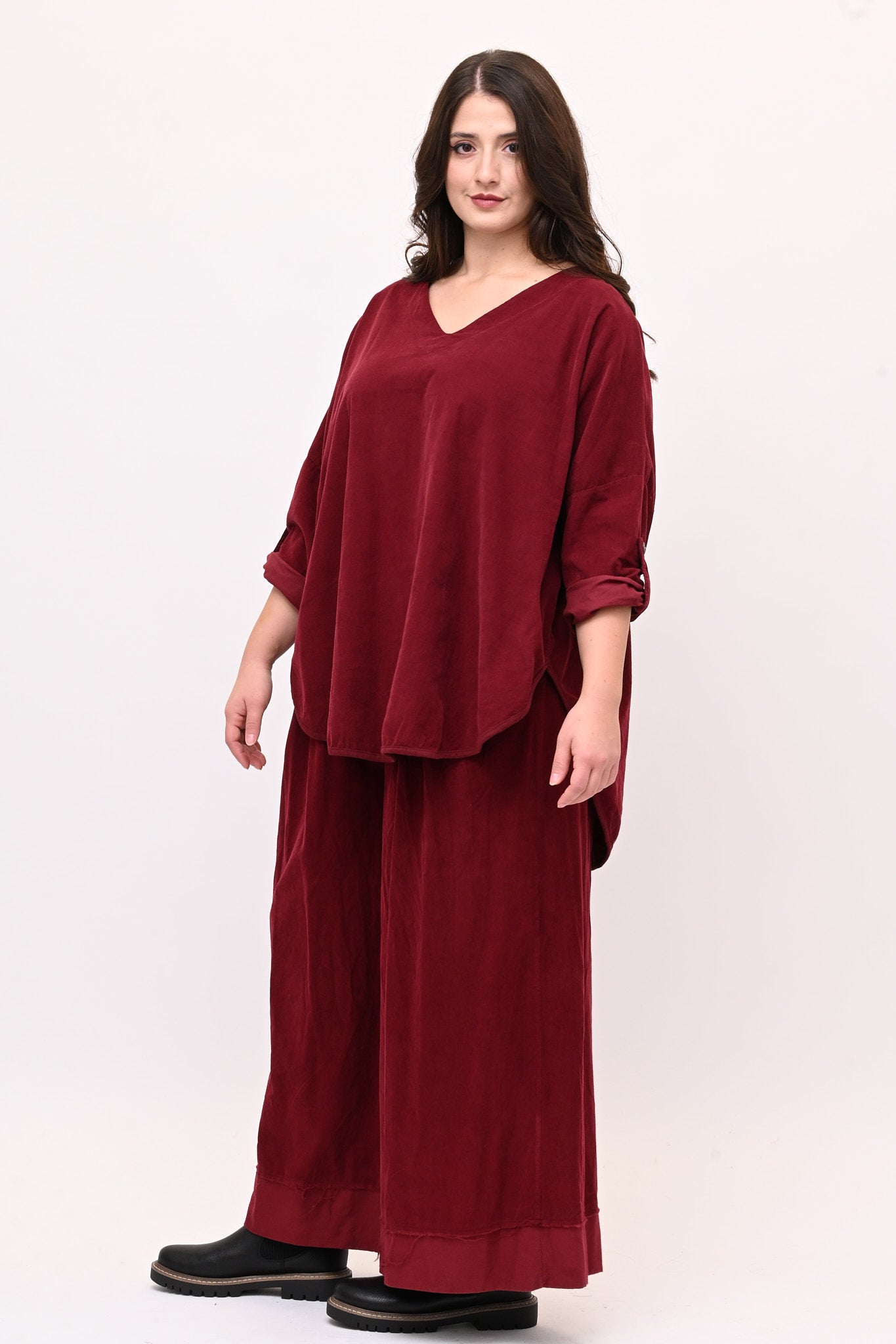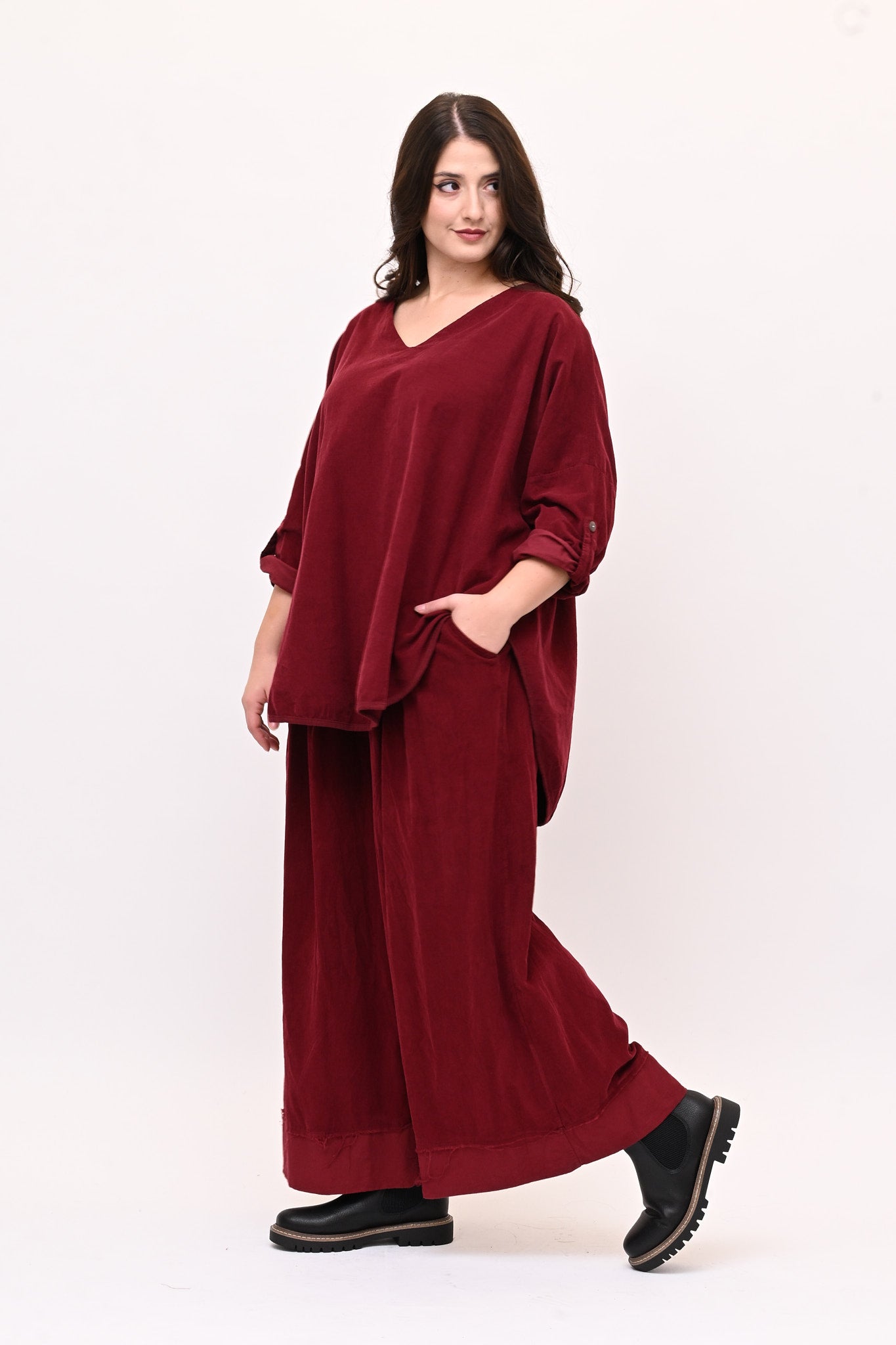 Completo in velluto a costine millerighe, composto da: blusa scollo a V, maniche lunghe regolabili con bottoncino e fondo stondato più lungo dietro. Il pantalone palazzo ha elastico in vita, pinces, tasche e gamba ampia. Comfort e libertà di movimento in un abbinamento versatile, perfetto per chi ricerca stile contemporaneo dal design sporty chic.