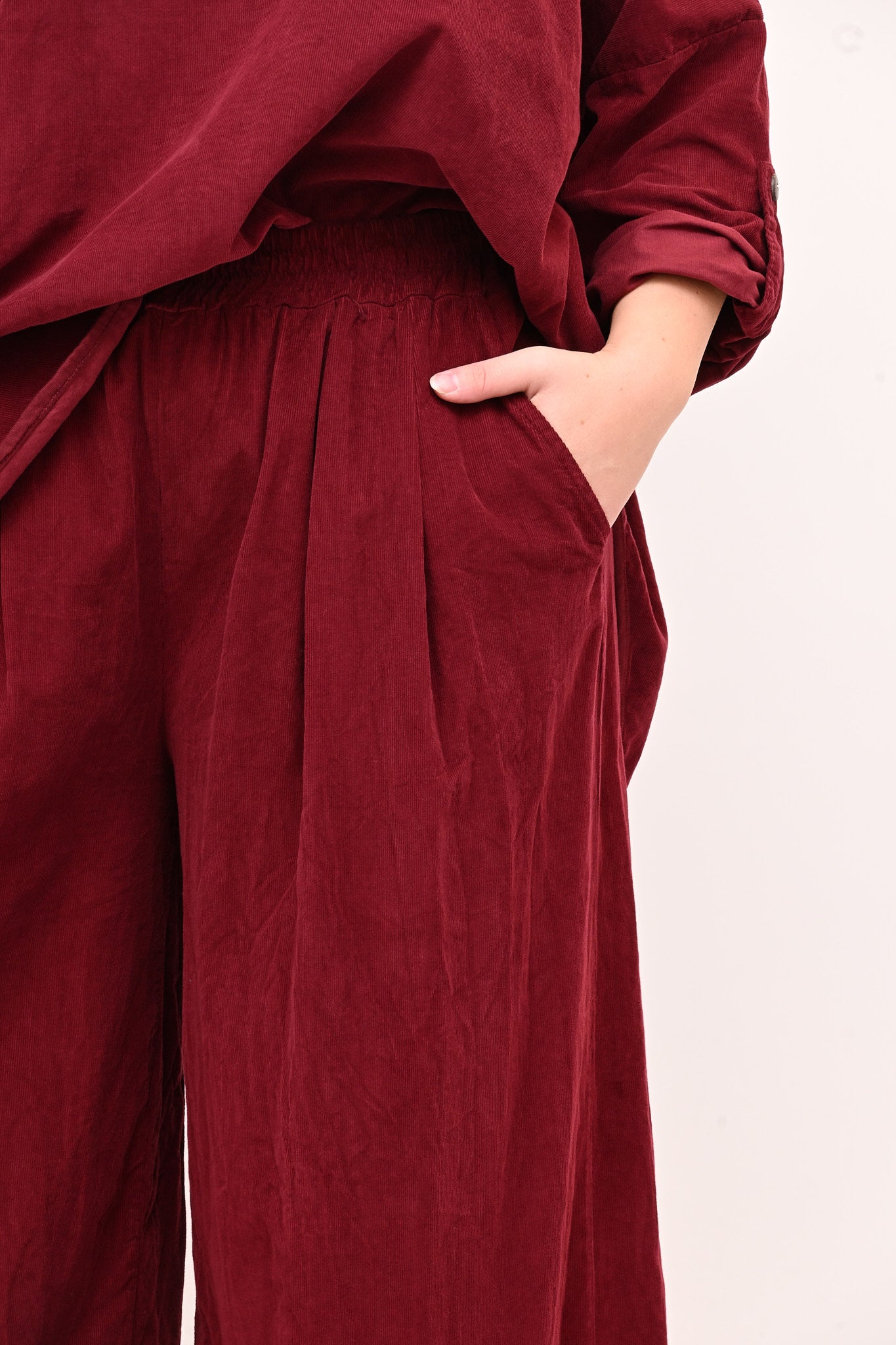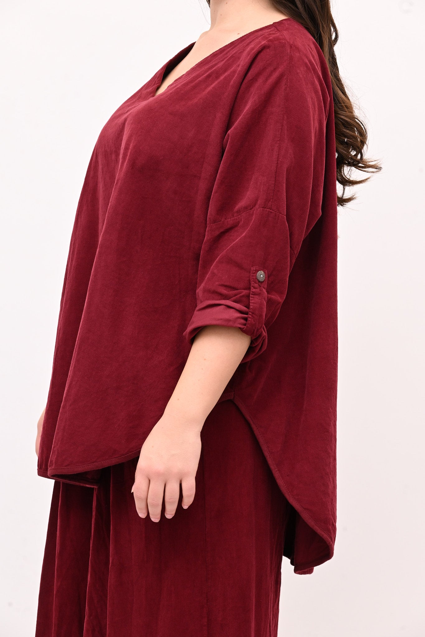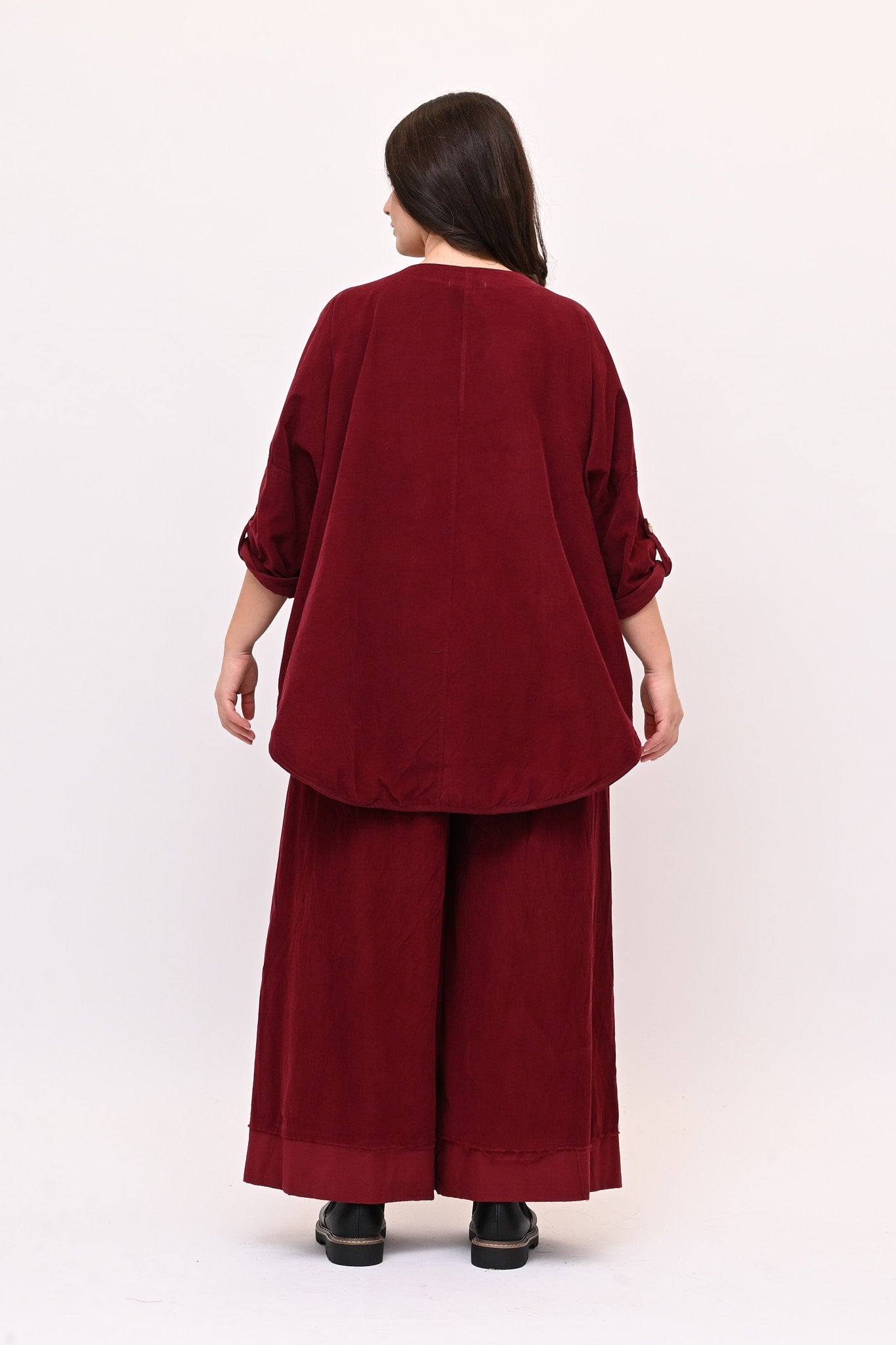 Completo in velluto a costine millerighe, composto da: blusa scollo a V, maniche lunghe regolabili con bottoncino e fondo stondato più lungo dietro. Il pantalone palazzo ha elastico in vita, pinces, tasche e gamba ampia. Comfort e libertà di movimento in un abbinamento versatile, perfetto per chi ricerca stile contemporaneo dal design sporty chic.
