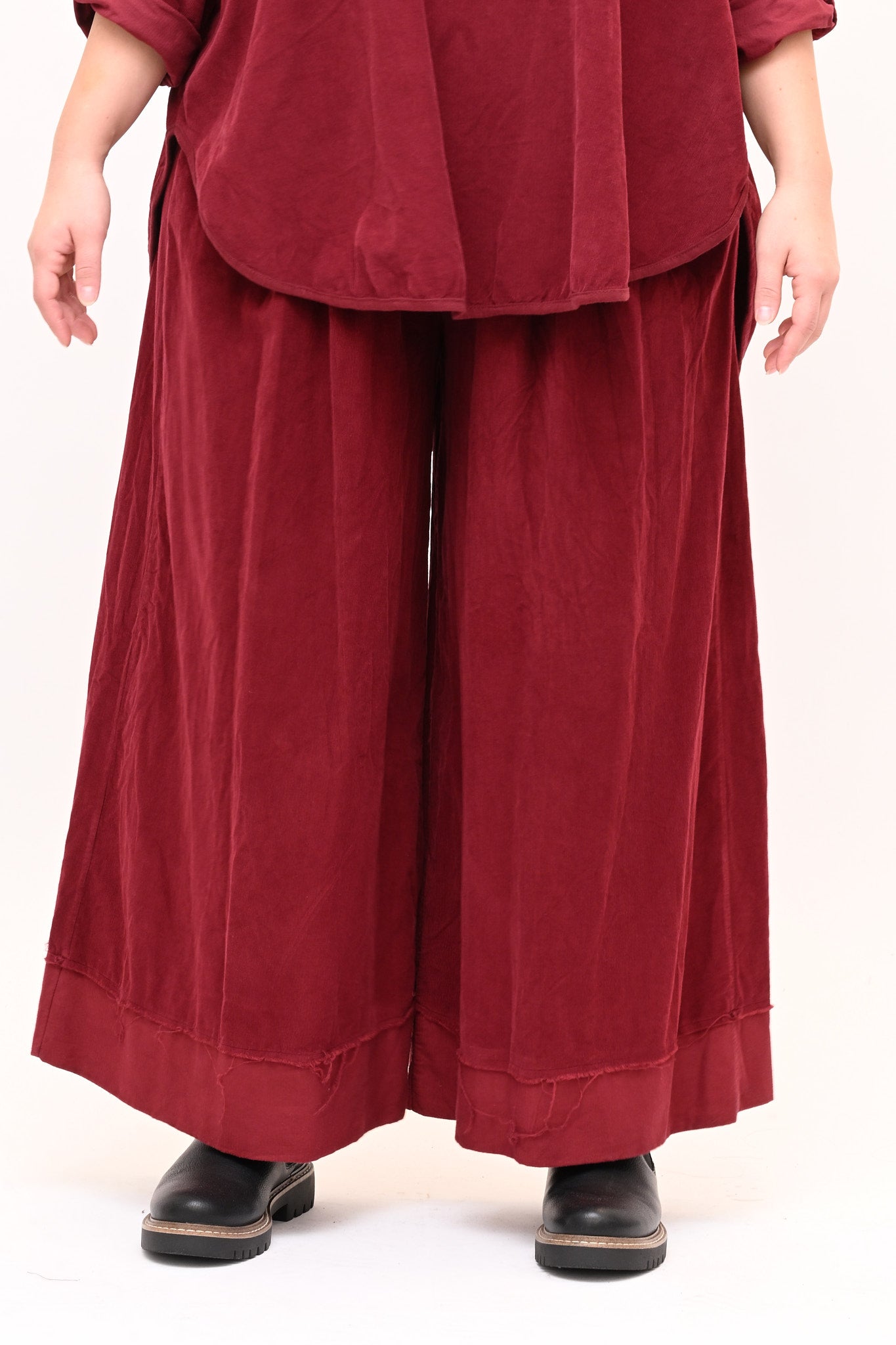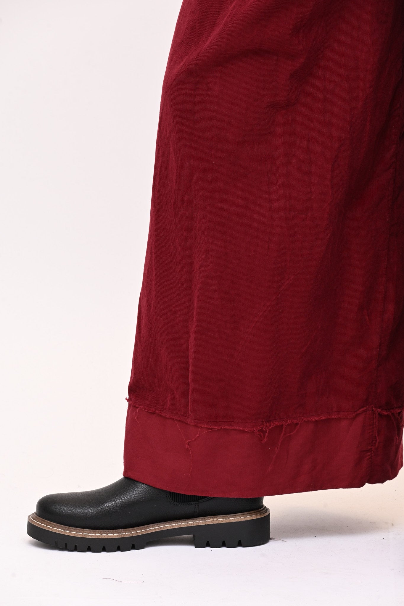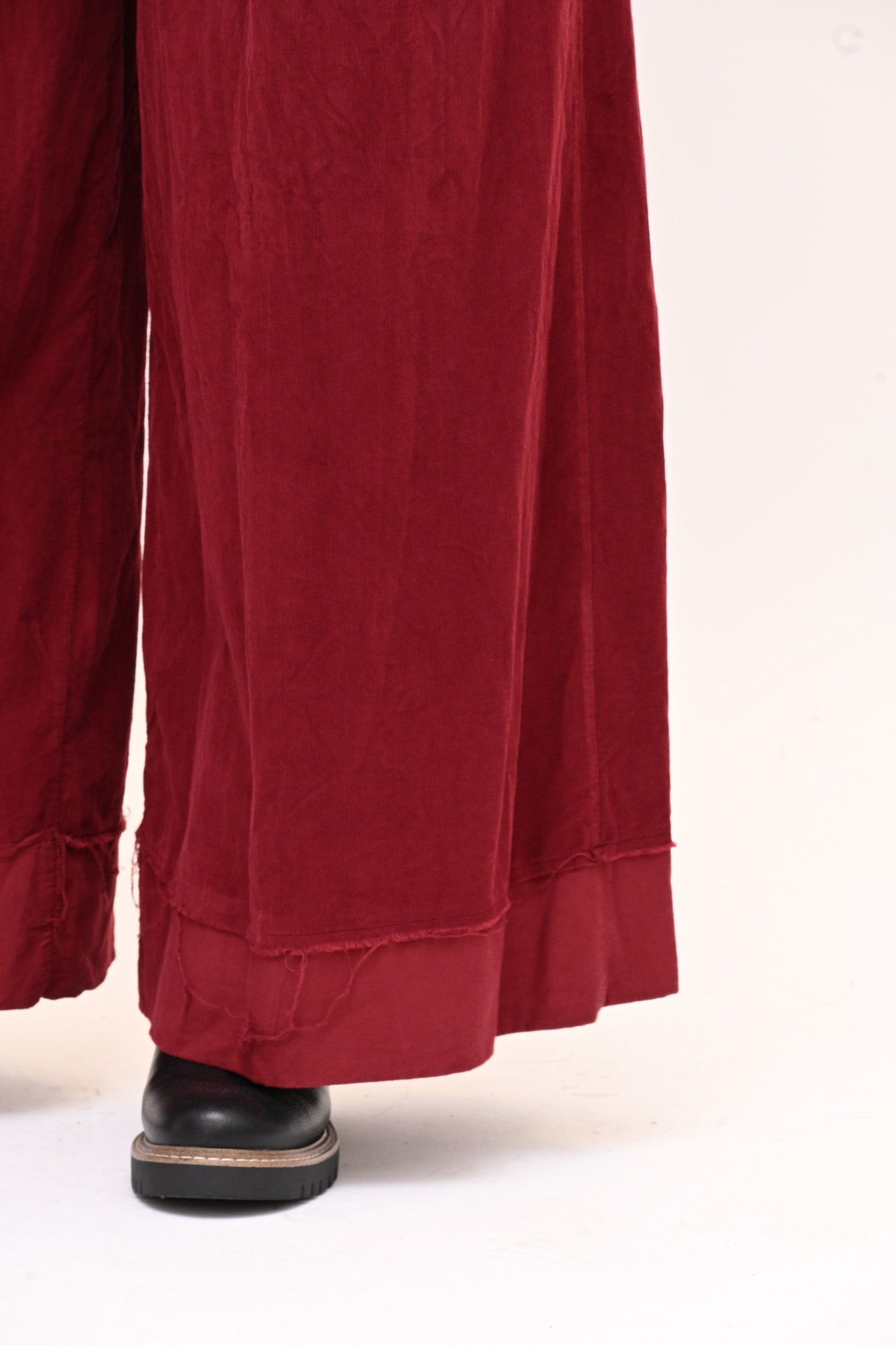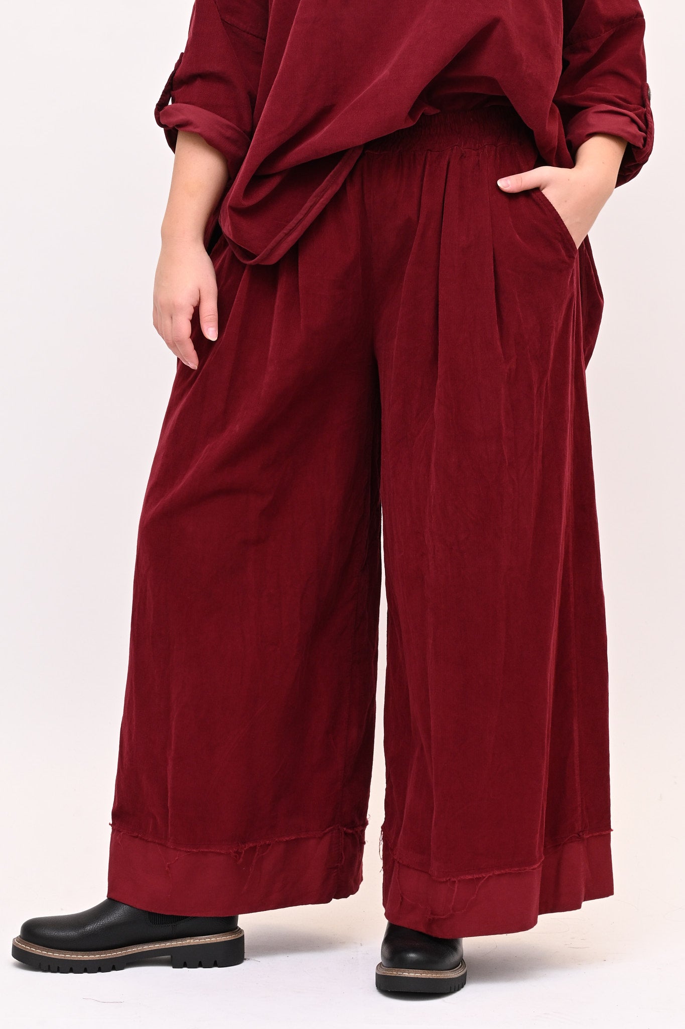 Completo in velluto a costine millerighe, composto da: blusa scollo a V, maniche lunghe regolabili con bottoncino e fondo stondato più lungo dietro. Il pantalone palazzo ha elastico in vita, pinces, tasche e gamba ampia. Comfort e libertà di movimento in un abbinamento versatile, perfetto per chi ricerca stile contemporaneo dal design sporty chic.