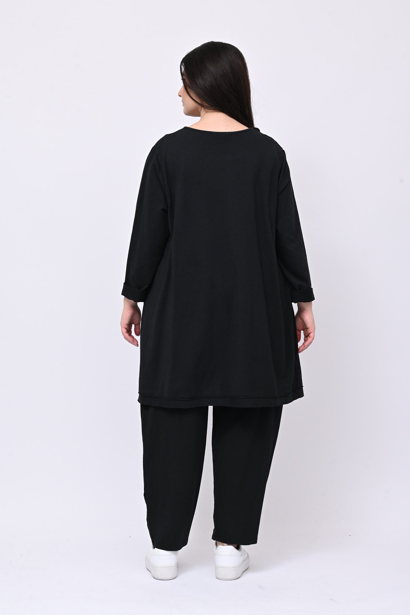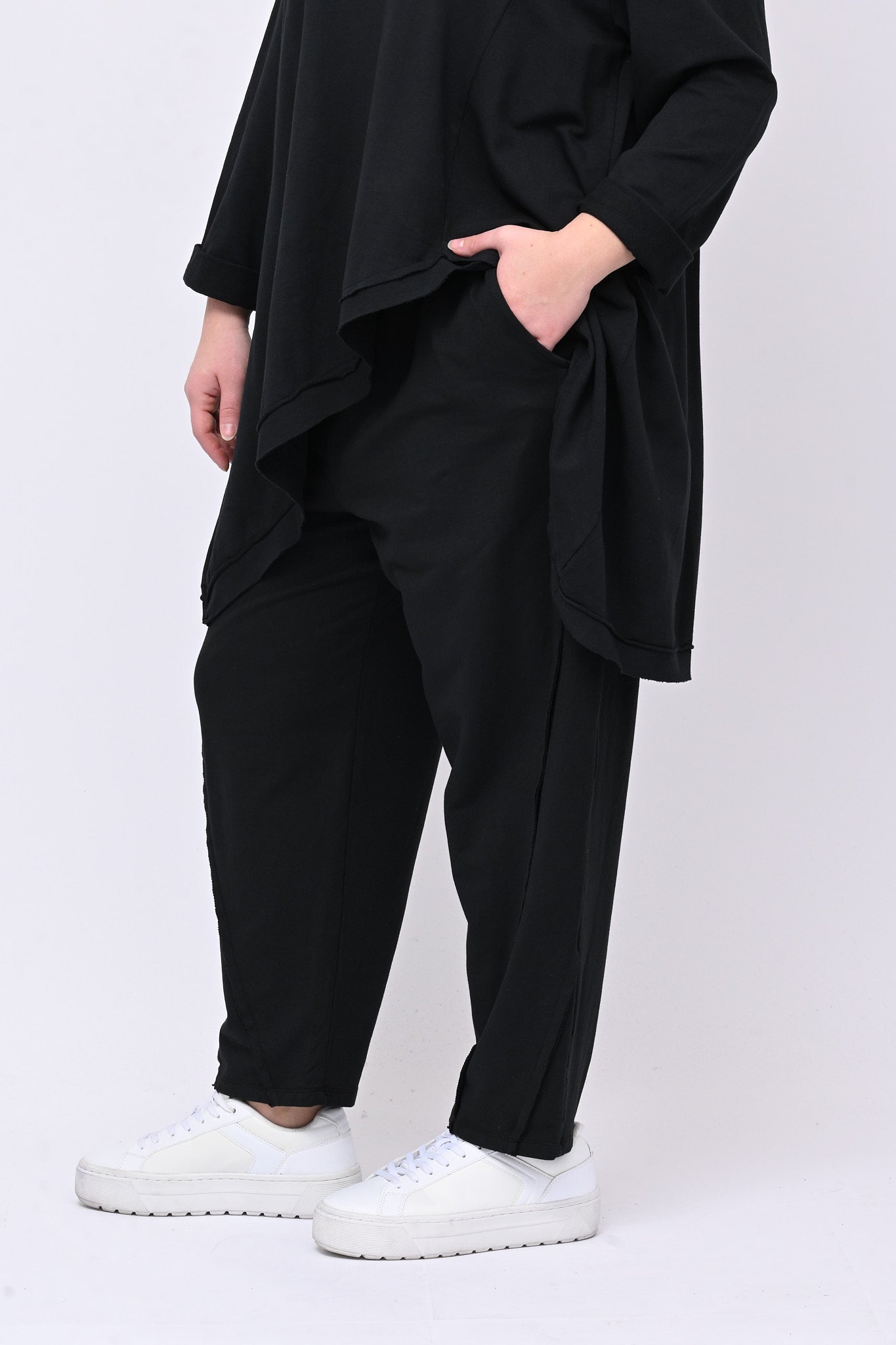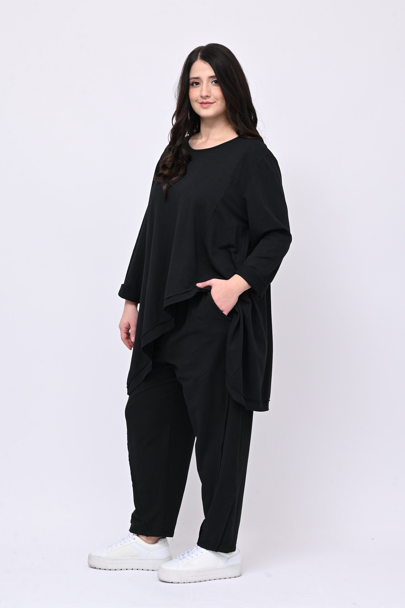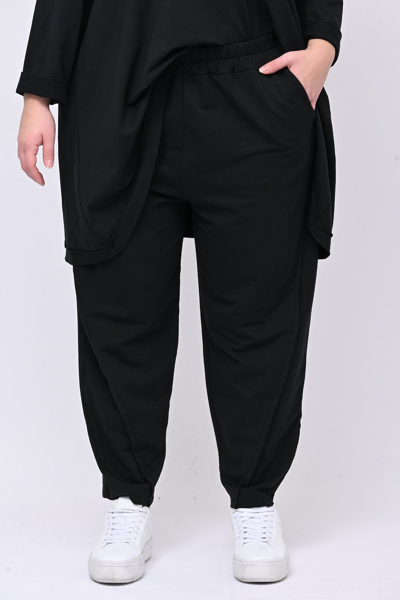 Completo in punto Milano, elasticizzato, con cuciture in rilevo, composto da: maglia girocollo, manica lunga leggermente più lunga sul retro per un effetto moderno e sofisticato. Il pantalone è modello carota con elastico in vita e tasche. Perfetto per uno stile casual chic e confortevole da indossare durante la giornata.