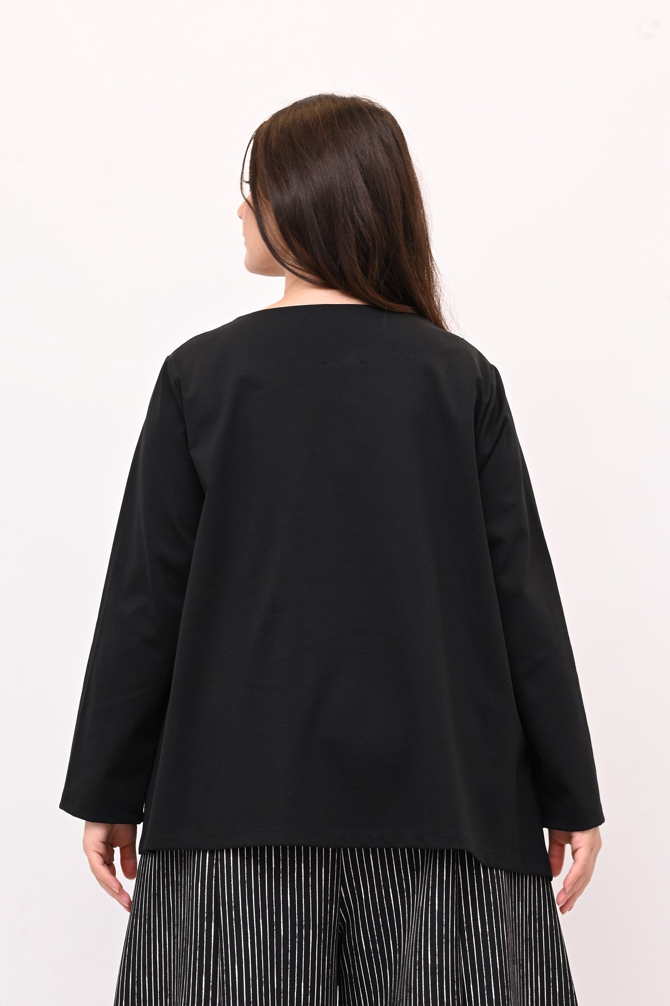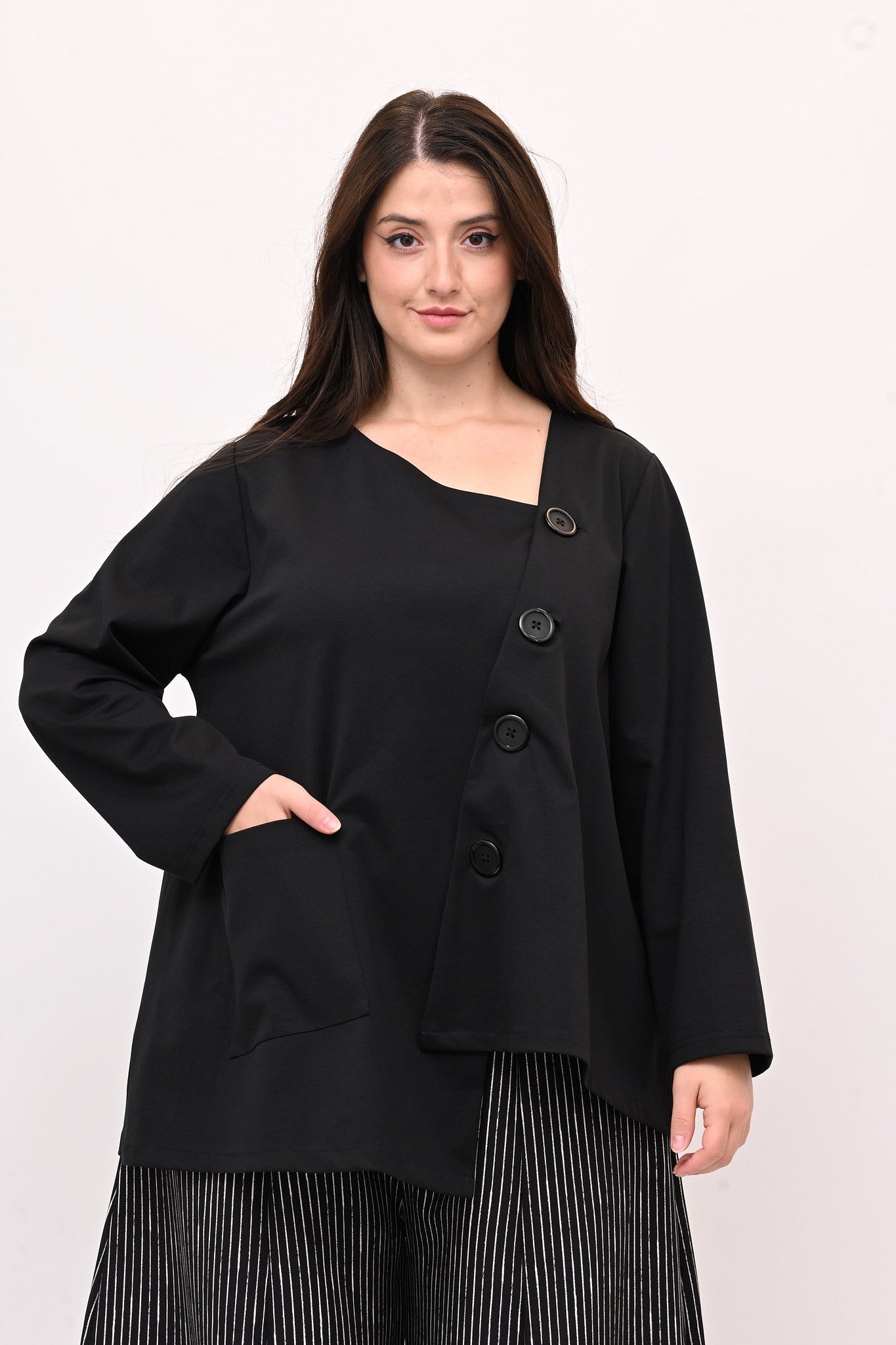 Giacca con design asimmetrico su collo e fondo, abbottonatura laterale obliqua e tascone frontale. Un capo raffinato e pratico per uno stile elegante e moderno. Perfetta per chi cerca un capo che unisca originalità e raffinatezza in ogni occasione.