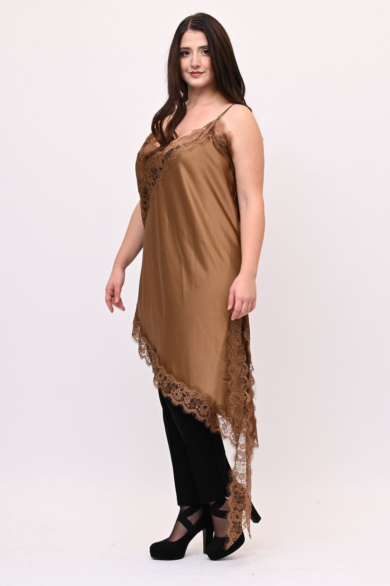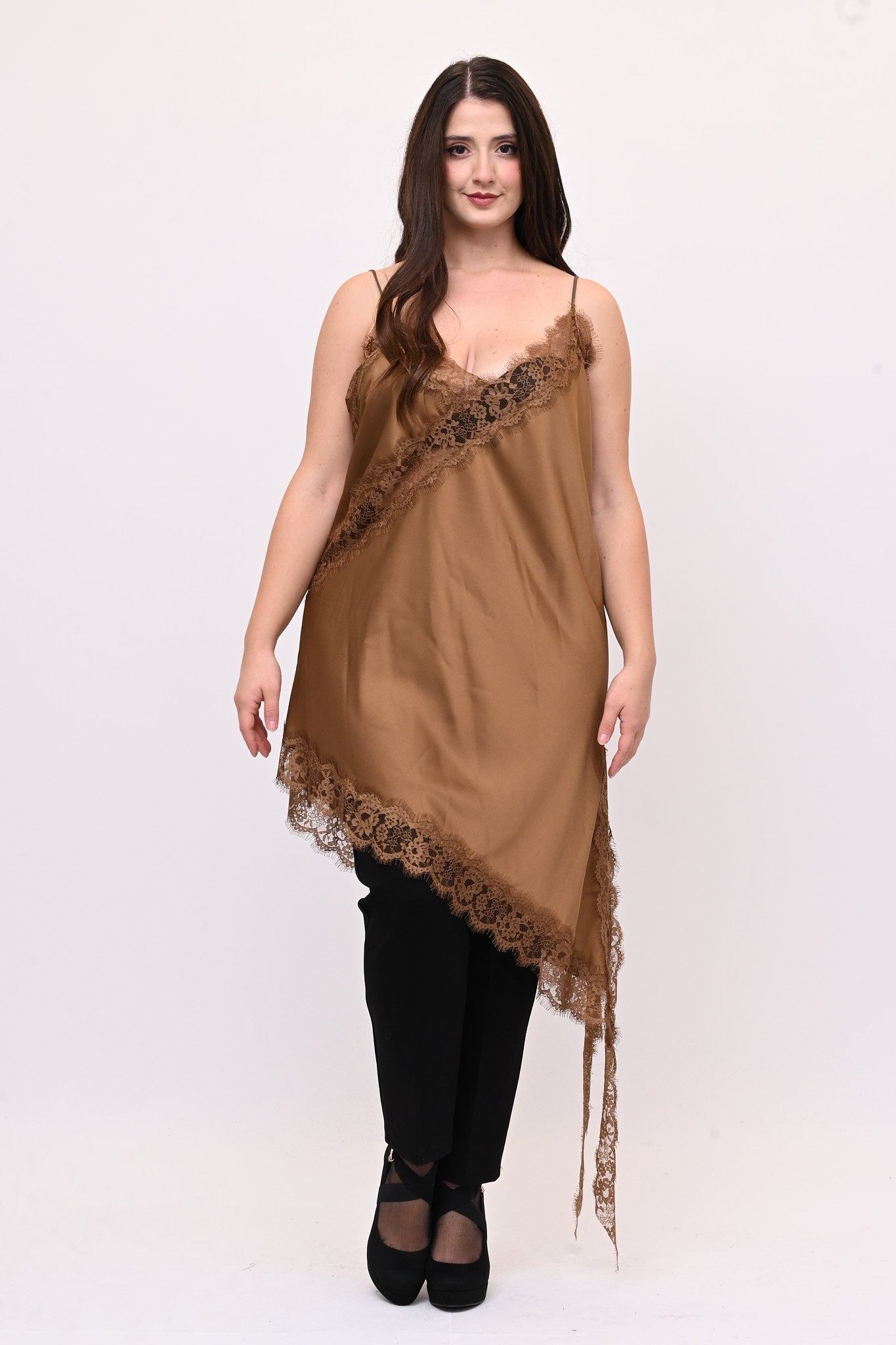 Top lungo in raso, con bretelle sottili e dettagli in pizzo sul decoltè e sull'orlo inferiore. Il design asimmetrico presenta una lunga punta laterale con spacco che da movimento e sensualità. Sexy indossato da solo per look audaci, può diventare una base versatile per outfit raffinati. Un capo che unisce eleganza femminile e carattere deciso.