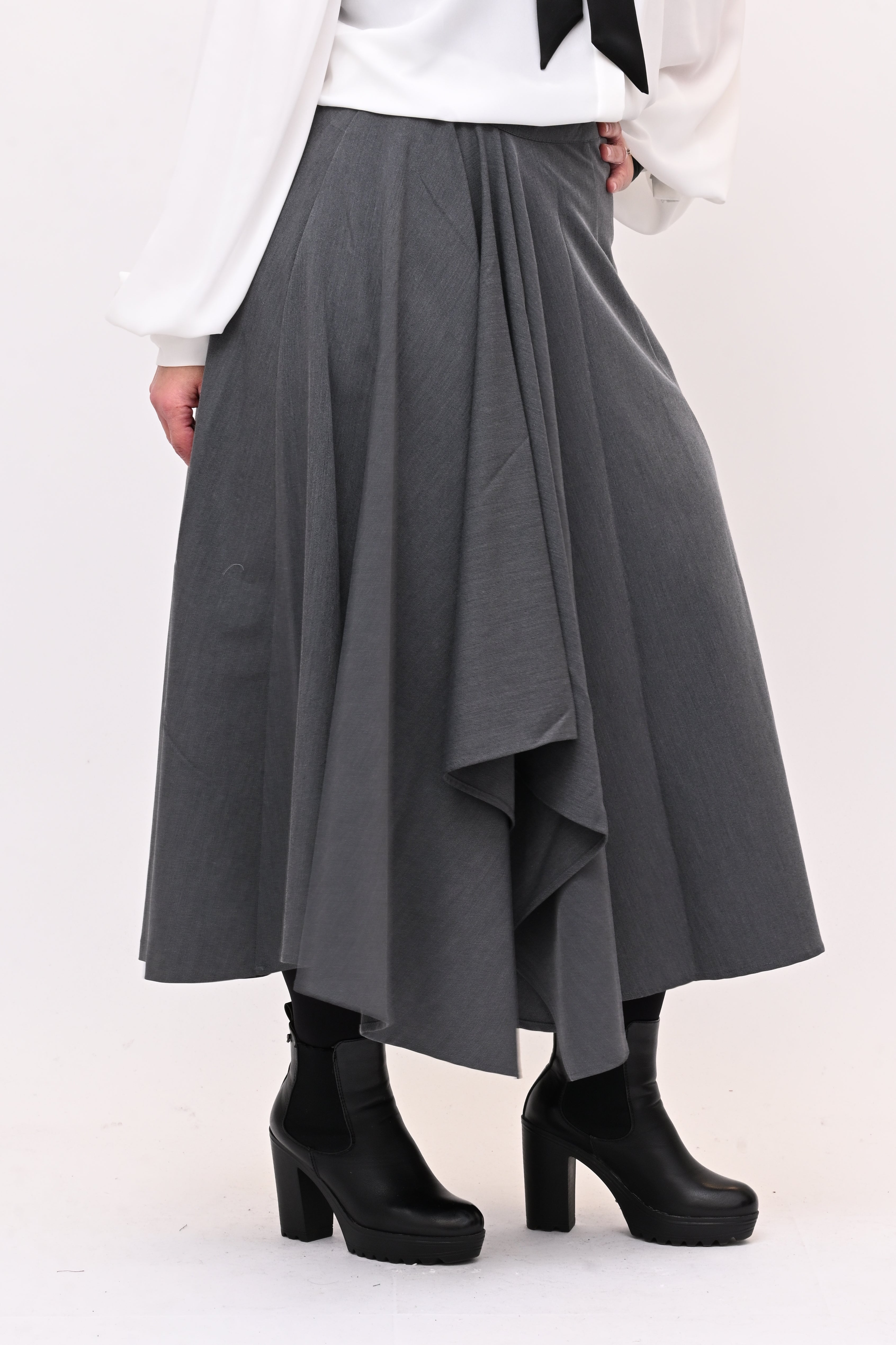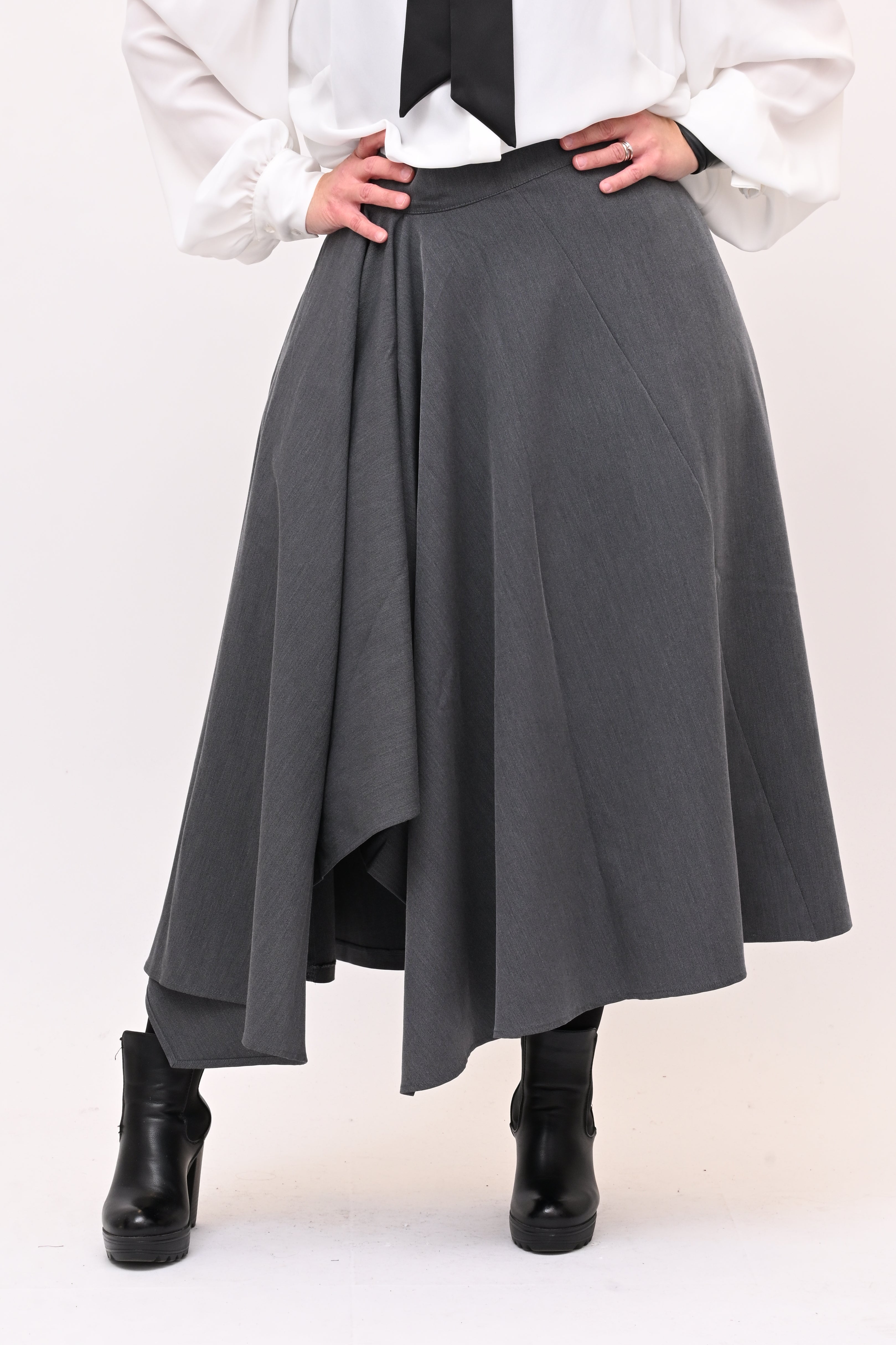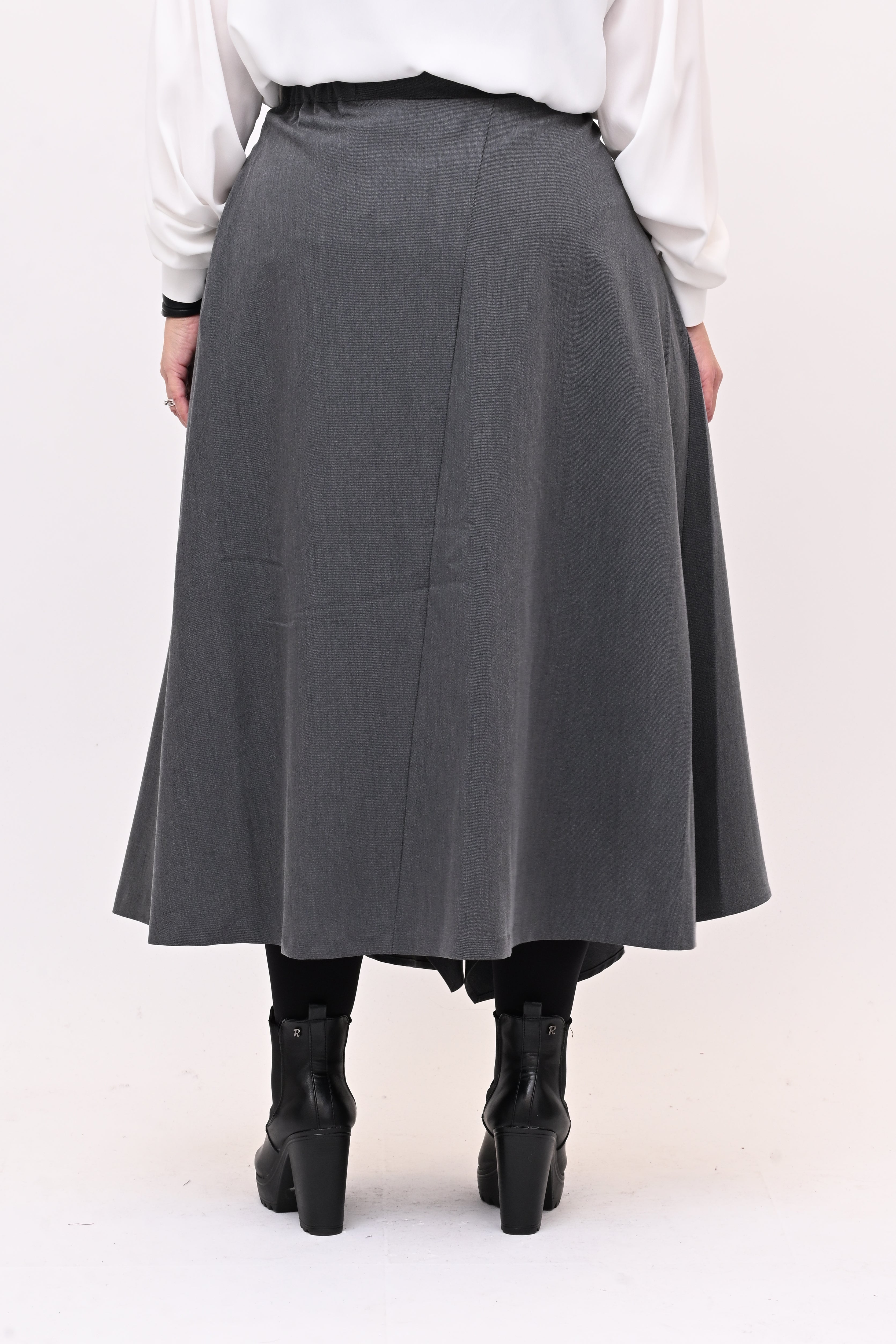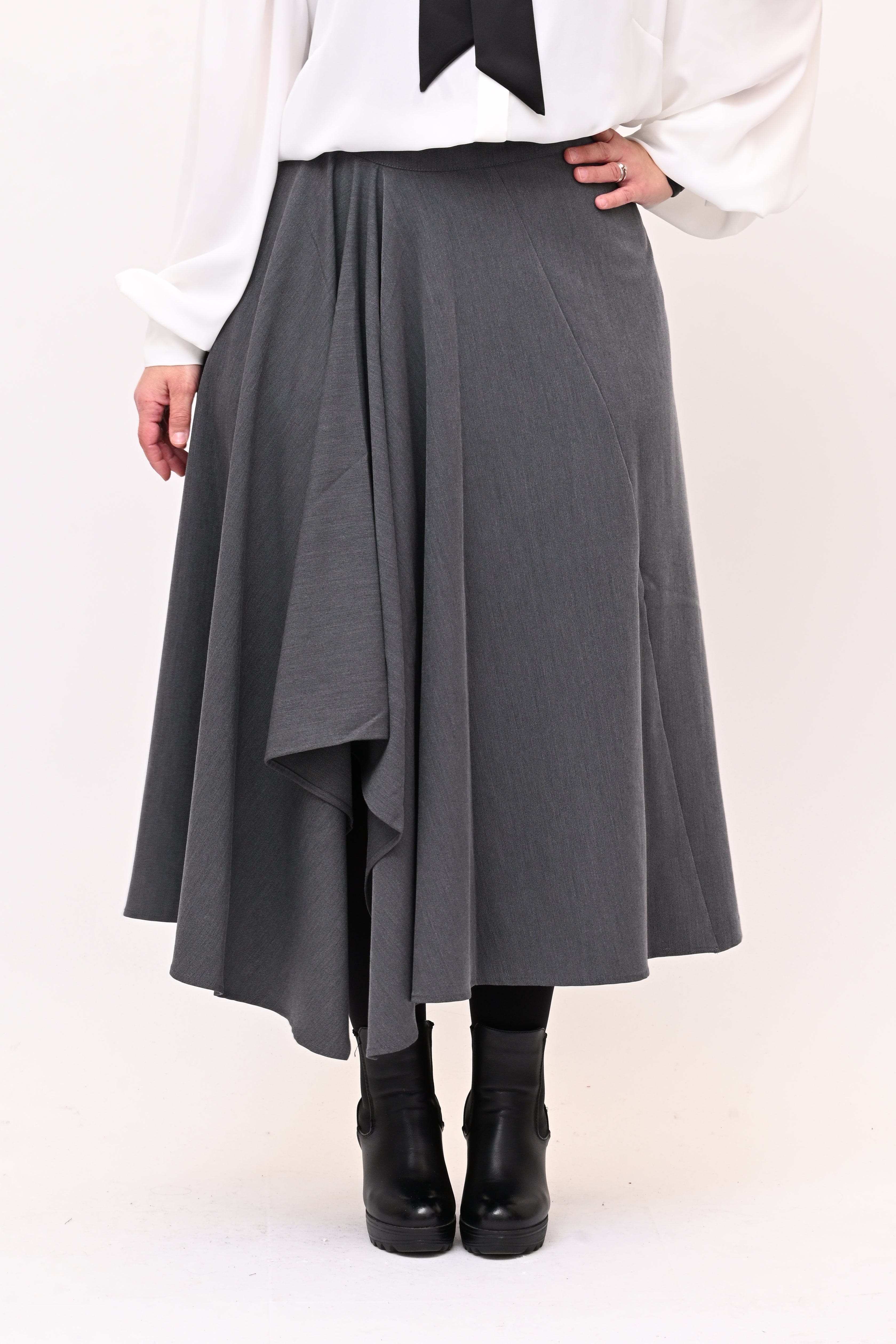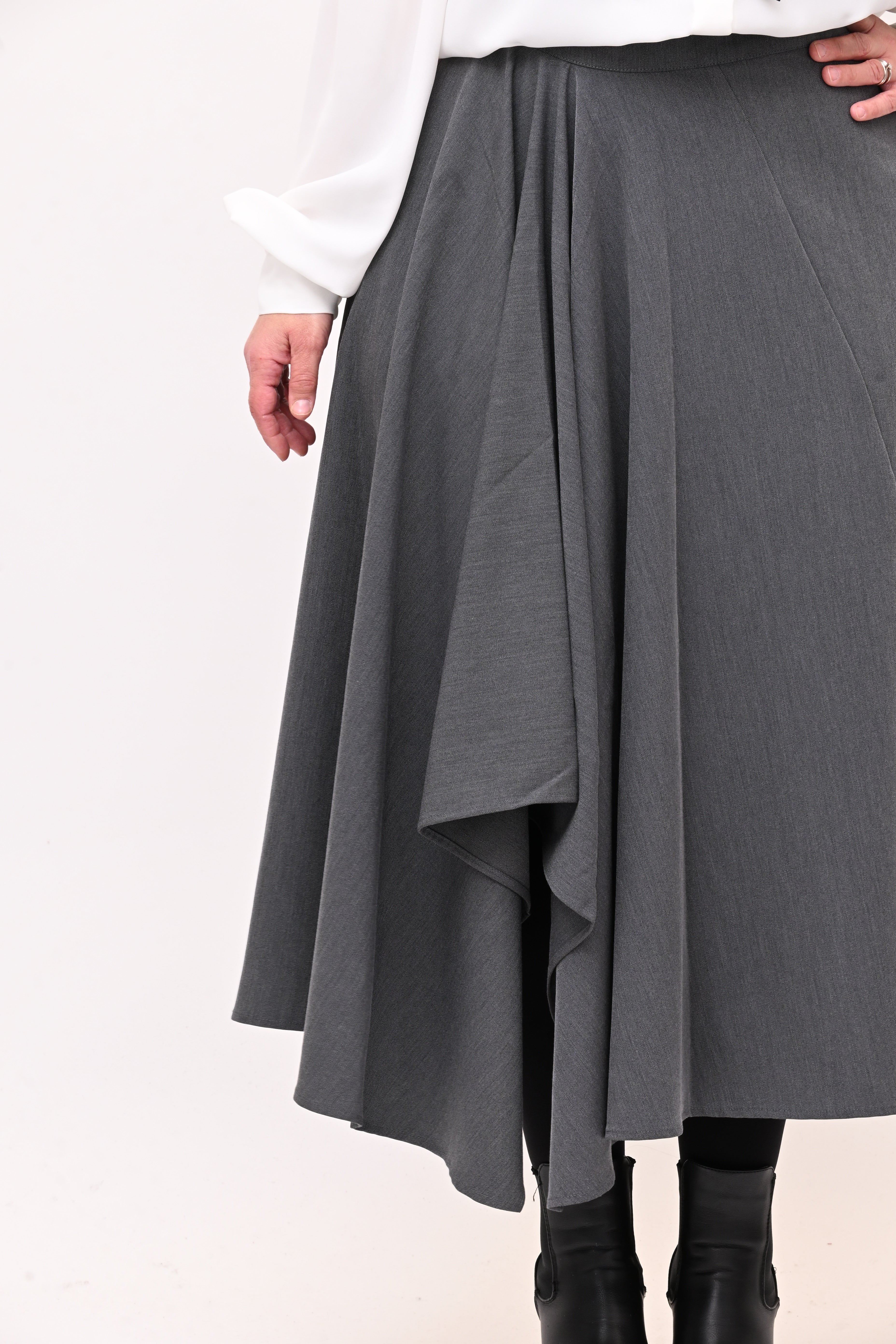 Gonna svasata, con zip ed elastico in vita. Su un fianco ,un gioco di pinces crea una punta laterale e asimmetrie. Un capo sofisticato e di tendenza, dal look contemporaneo, ideale per chi cerca originalità senza rinunciare alla versatilità.