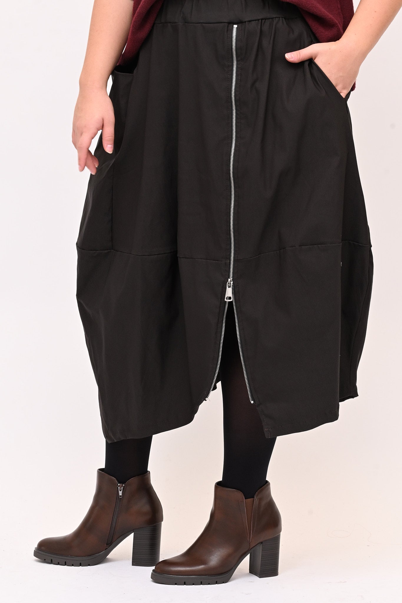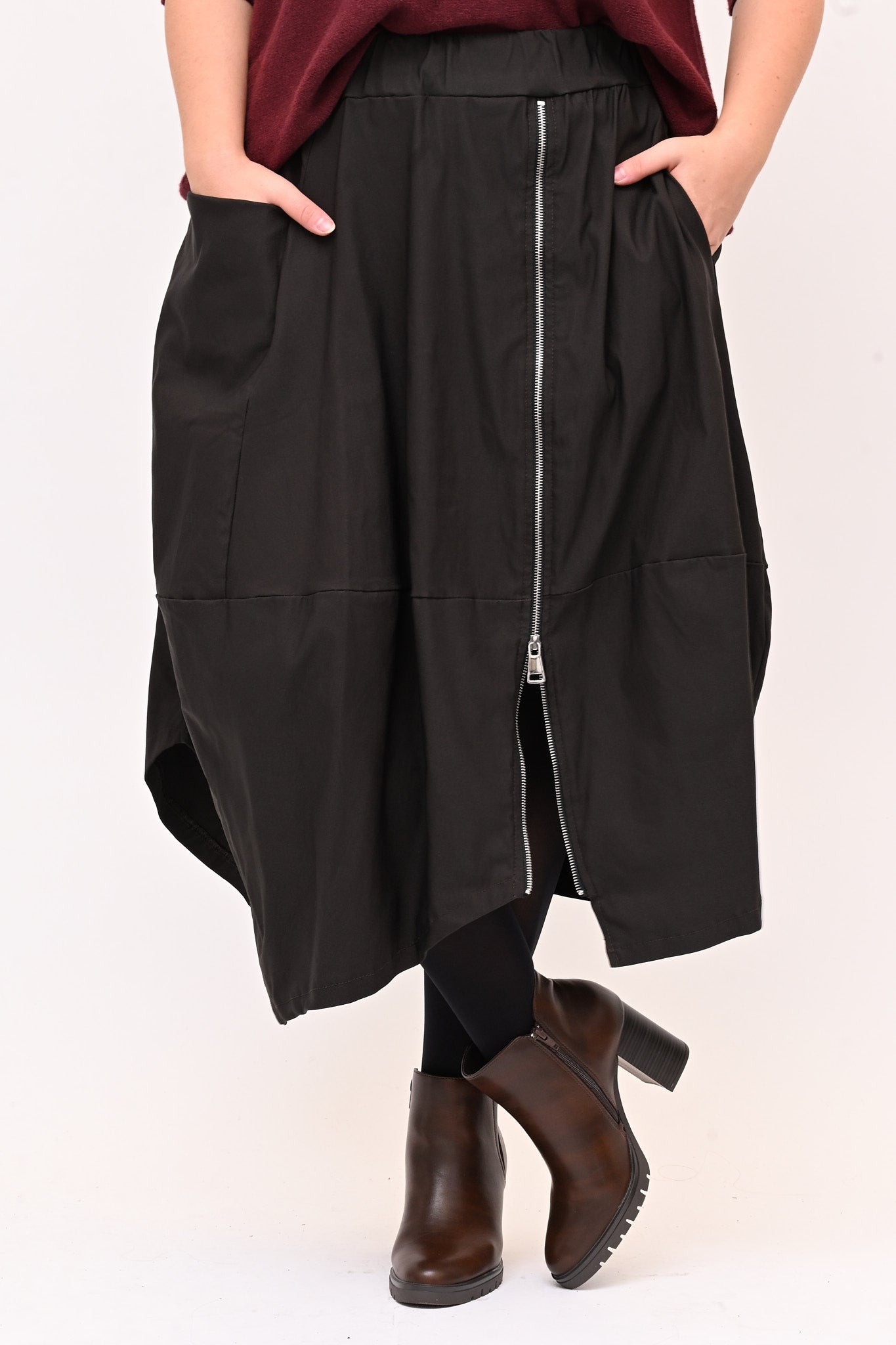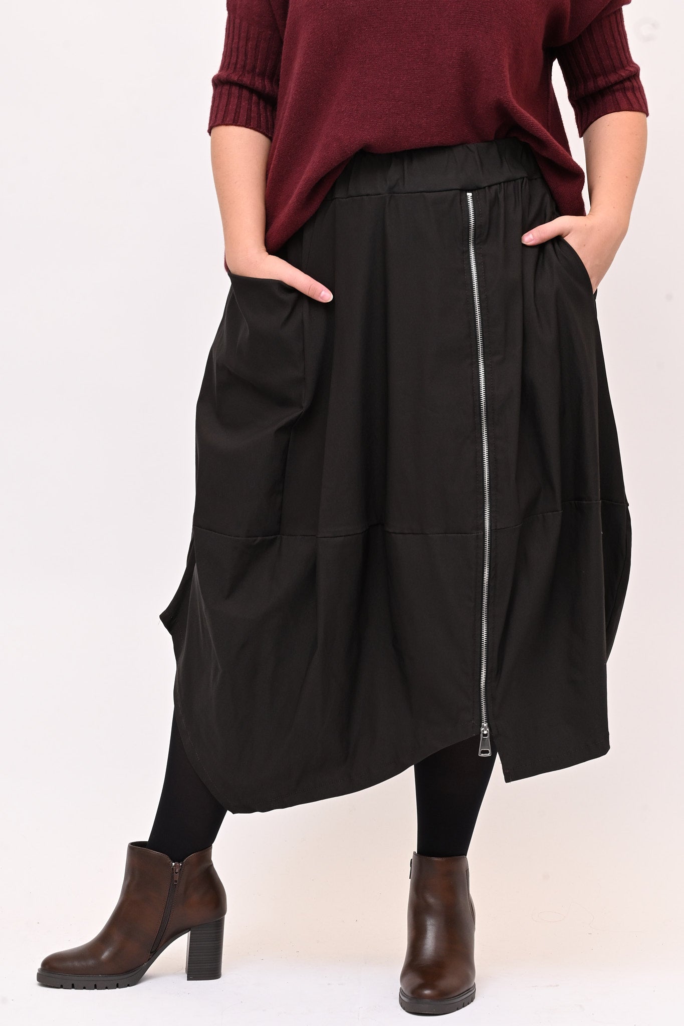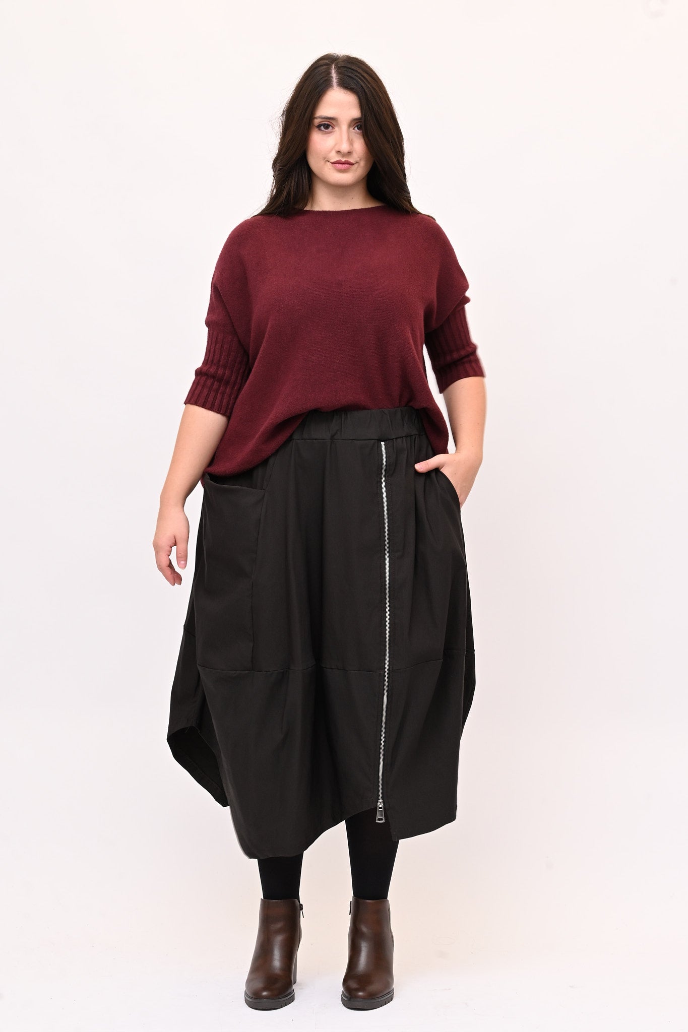 Gonna in bengalina elasticizzata, modello a ovetto, dal design asimmetrico, arricchito da una zip nera laterale e una maxi tasca. Contemporanea e distintiva, è perfetta per chi cerca un capo moderno e con carattere.