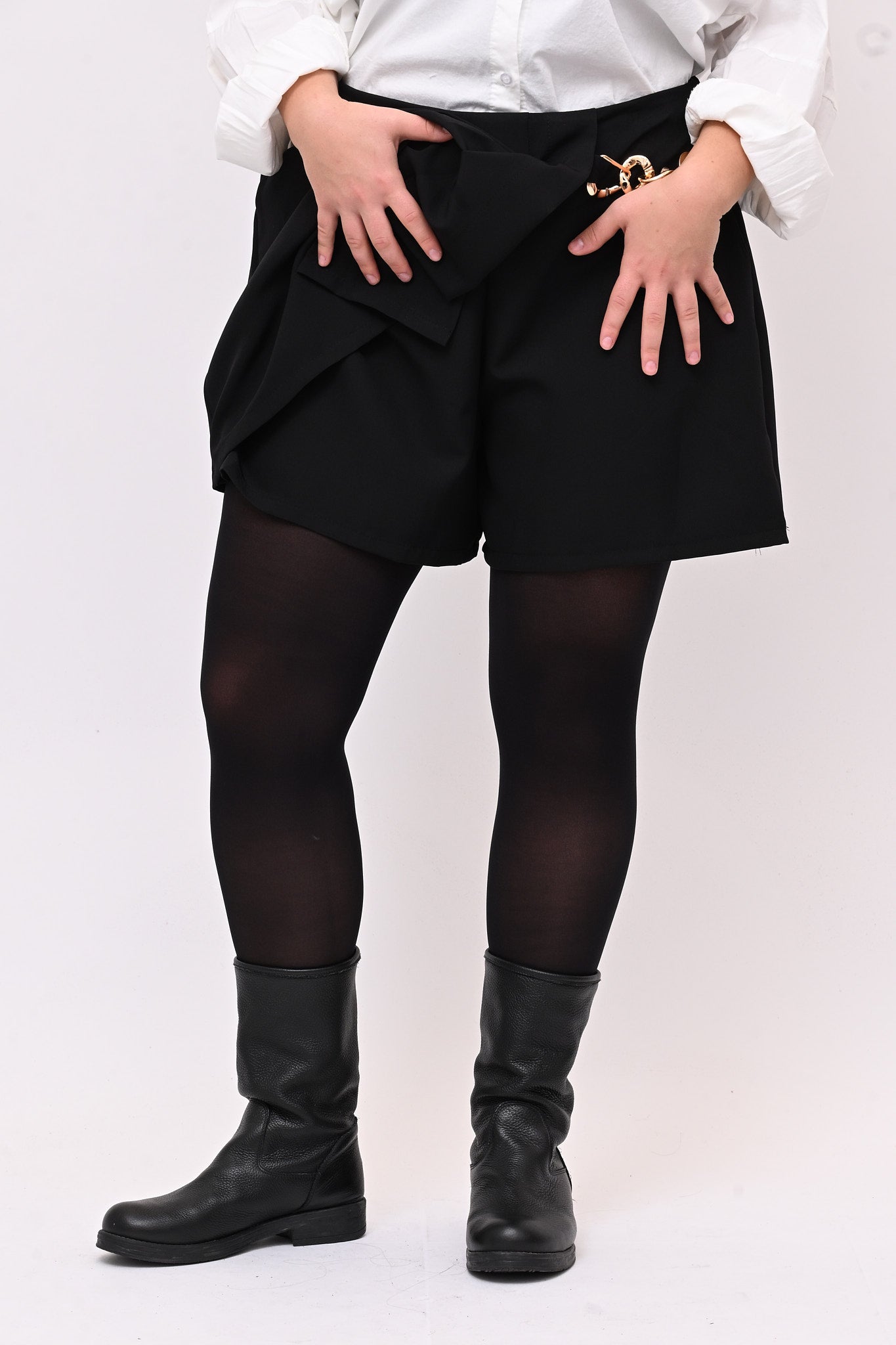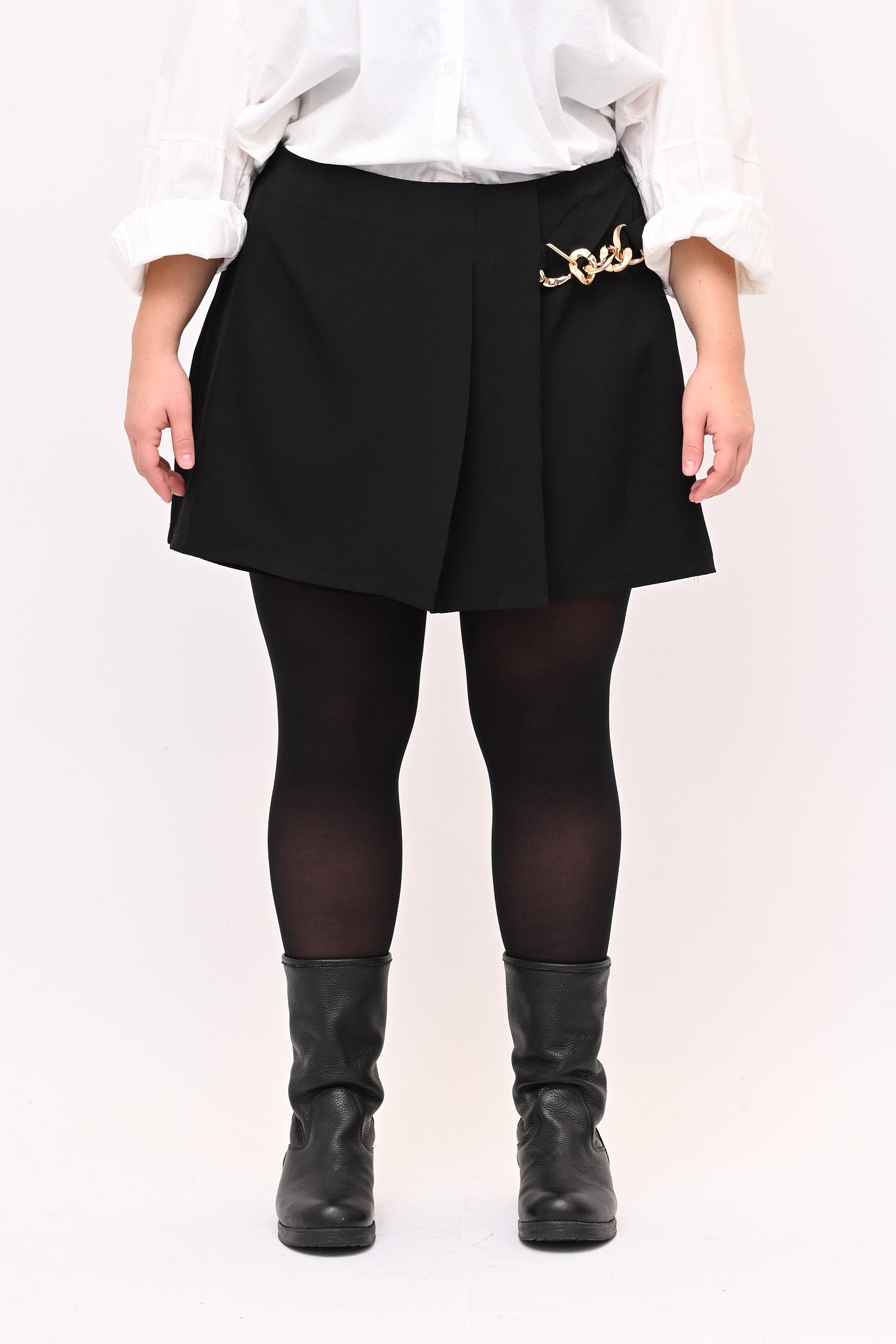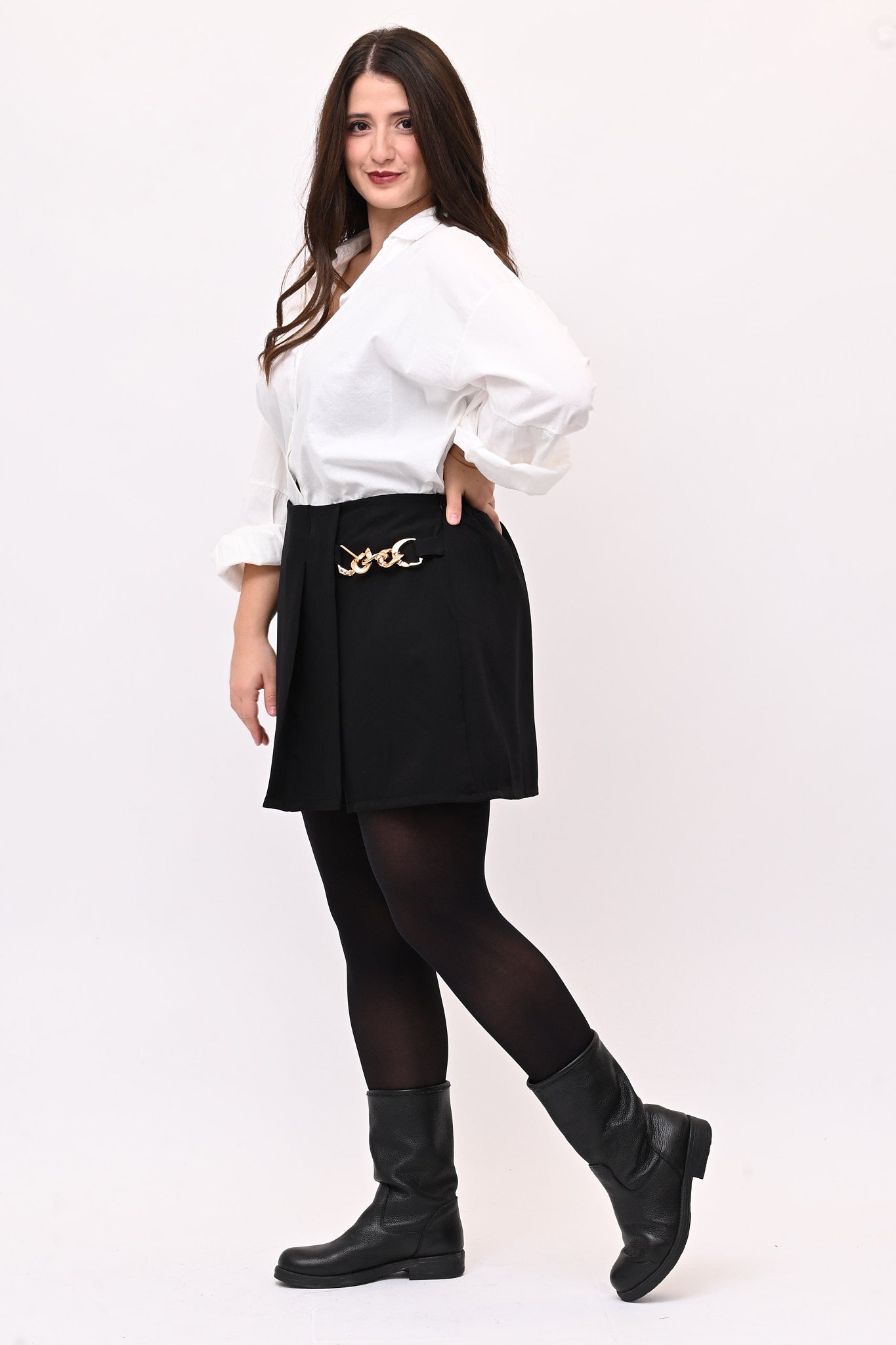 Shorts con pannello frontale effetto gonna, con catena oro, elastico e zip in vita. La lunghezza a metà coscia esalta un look femminile e funzionale, ideale per chi cerca stile e comodità in un unico capo.