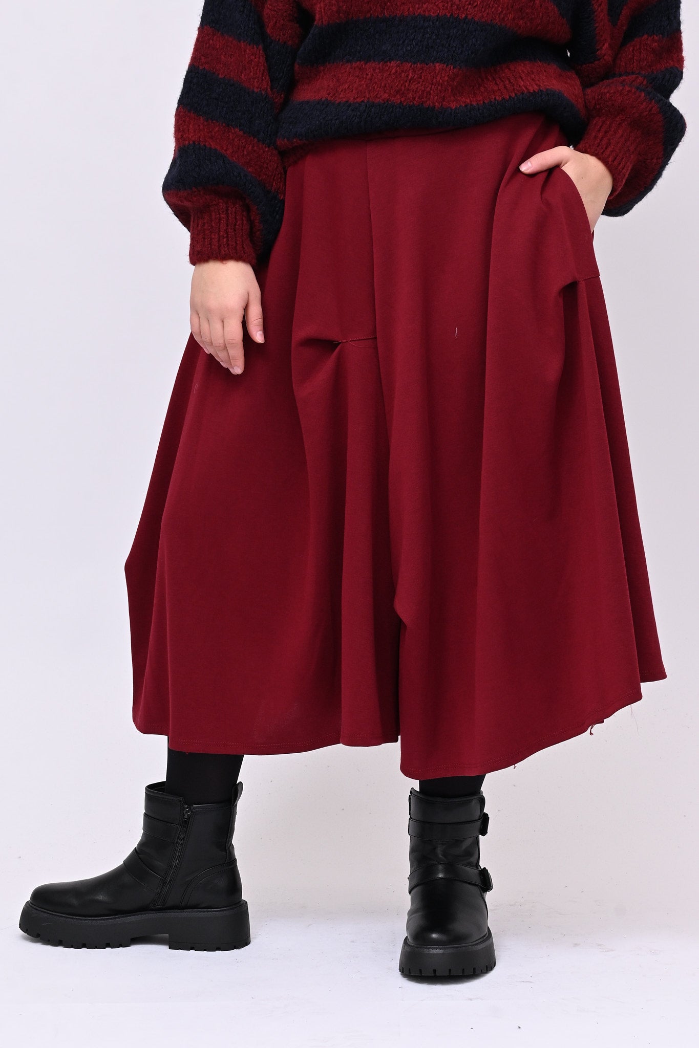 Gonna in felpa di cotone, modello a ruota, elastico in vita e tasche laterali. Giochi di cuciture e riprese strategiche conferiscono carattere e movimento al capo, rendendolo versatile per ogni occasione, dal casual al semi-formale. Una scelta ideale per chi ricerca qualità, comodità e stile.